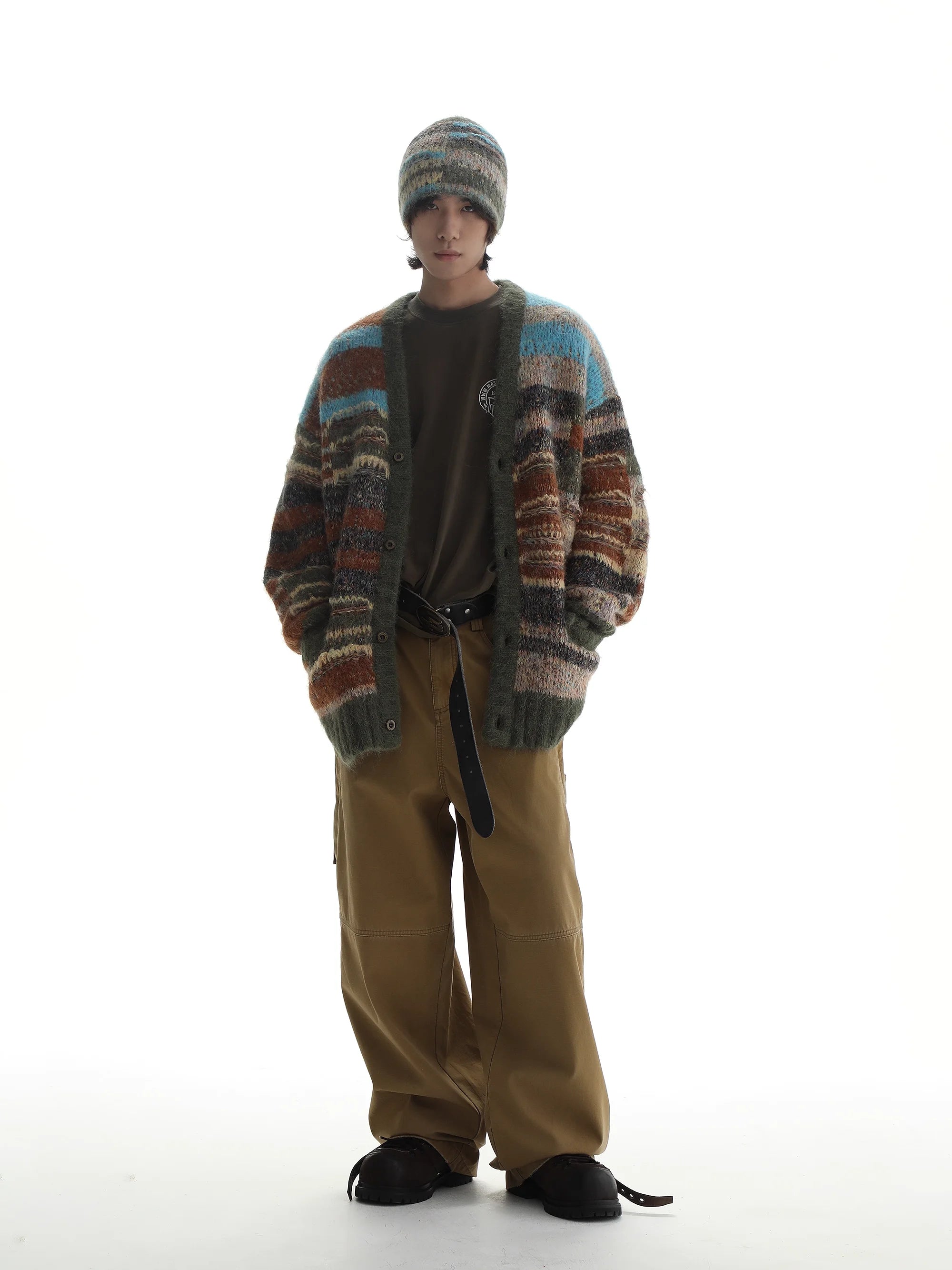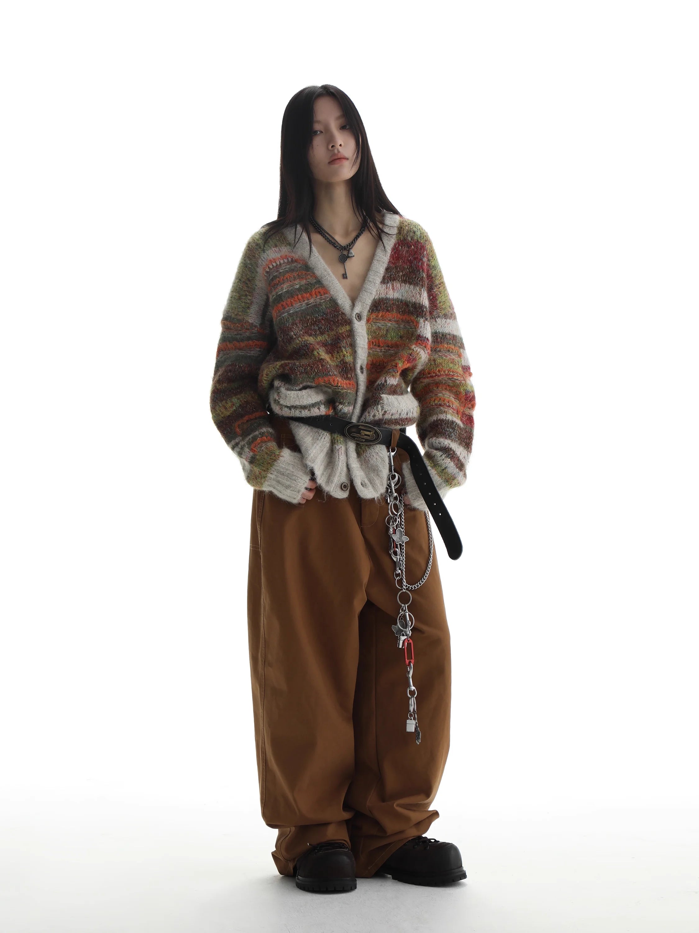 Stay warm and stylish this fall and winter with this cozy colorblock knit cardigan. Designed with a mix of red, green, grey, and cream yarns, this oversized piece offers a textured, fashion-forward look. Featuring a button-down front and a loose silhouette, it can be cinched at the waist with a bold black belt for added shape. Styled here on a female model, it pairs effortlessly with wide-leg trousers and layered accessories for an edgy yet comfortable ensemble.