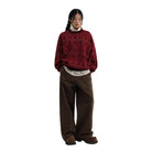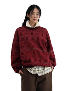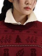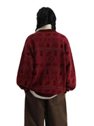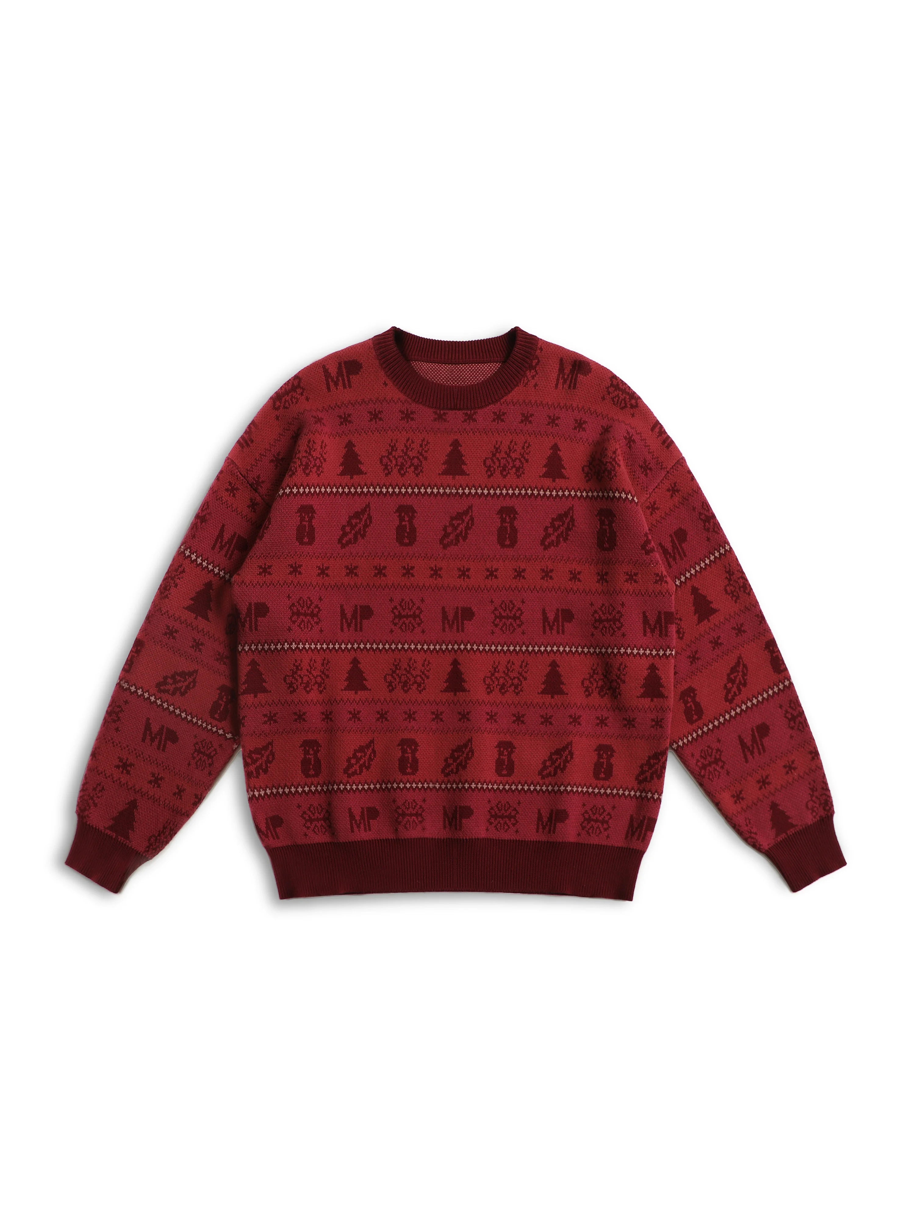This stylish crew neck sweater features a festive Nordic-inspired pattern in contrasting dark tones on a rich maroon background. Made from soft cotton, it is designed for comfort and warmth. Ideal for colder seasons, the loose fit allows for easy layering over shirts or turtlenecks.