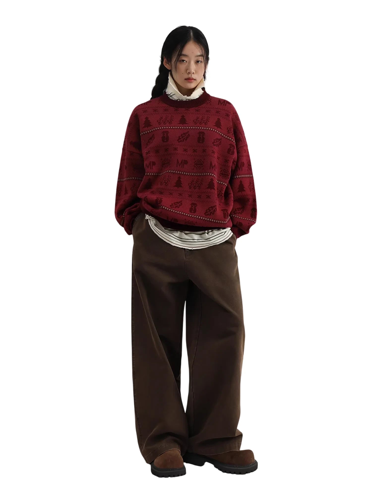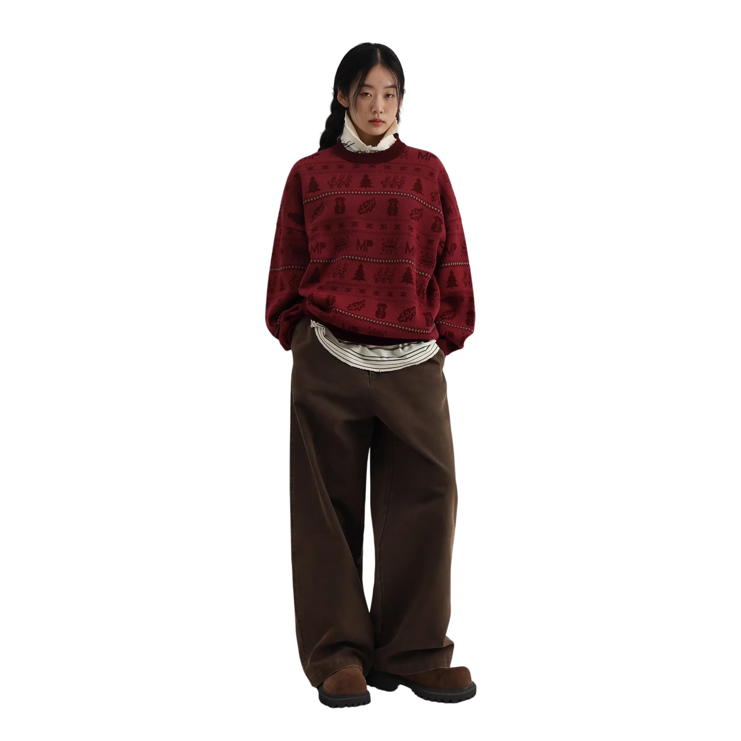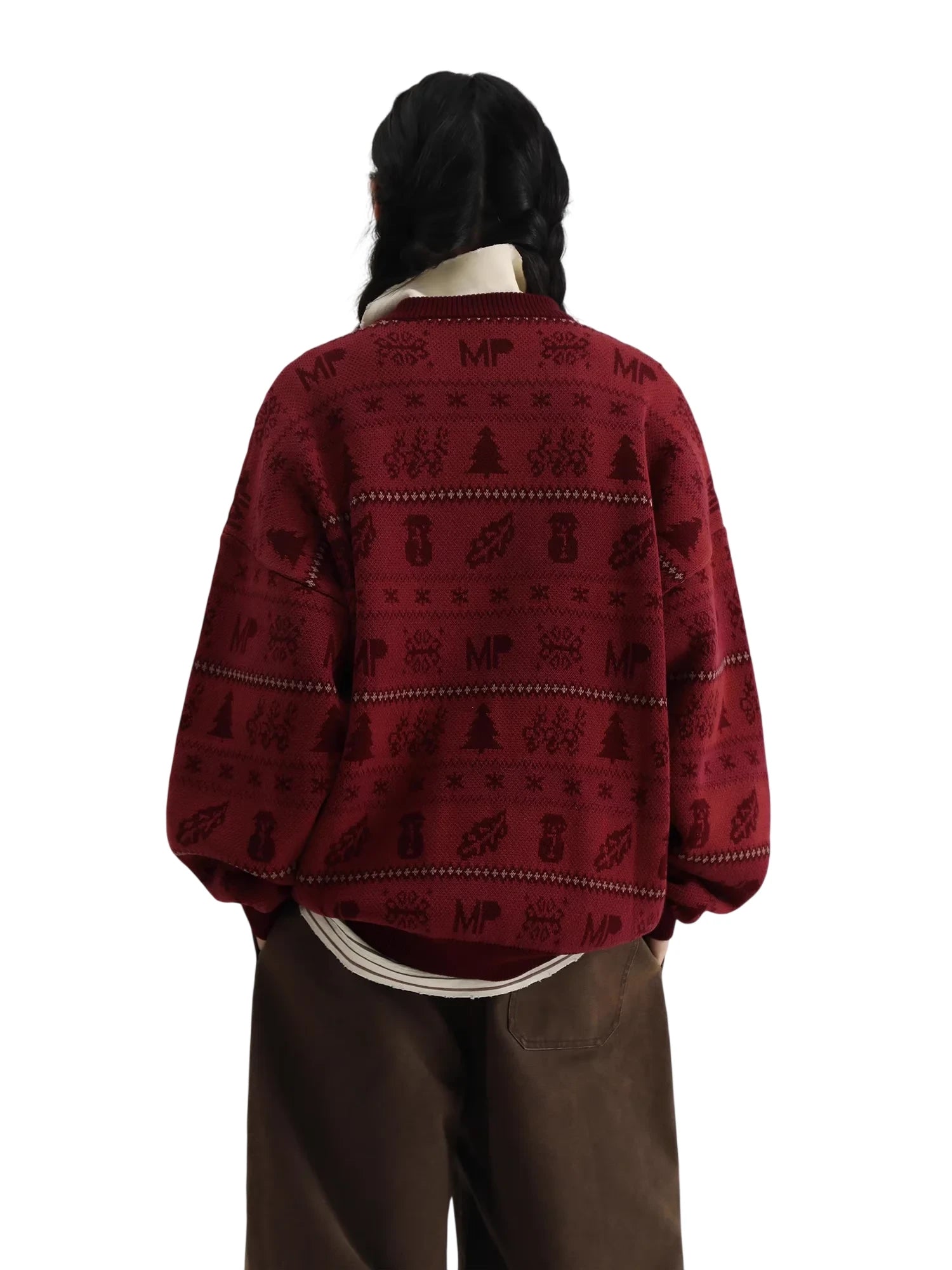 Worn here by a female model, the sweater is paired with a striped turtleneck undershirt and wide-legged brown pants, creating a cozy and casual winter look. The bold graphic motifs include trees, snowflakes, and geometric designs that bring a subtle holiday spirit to everyday wear.