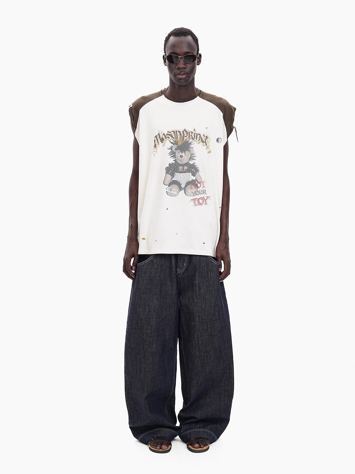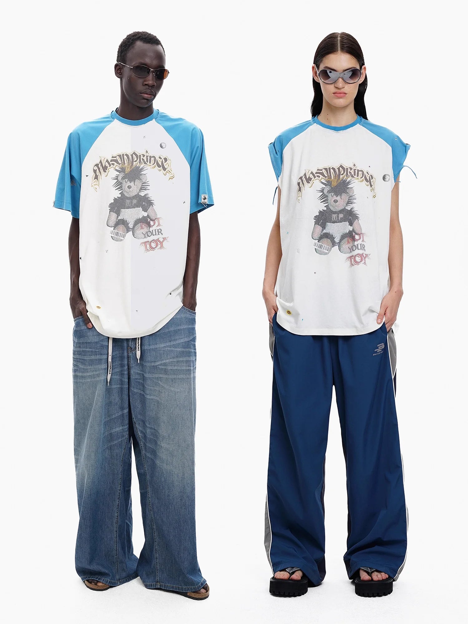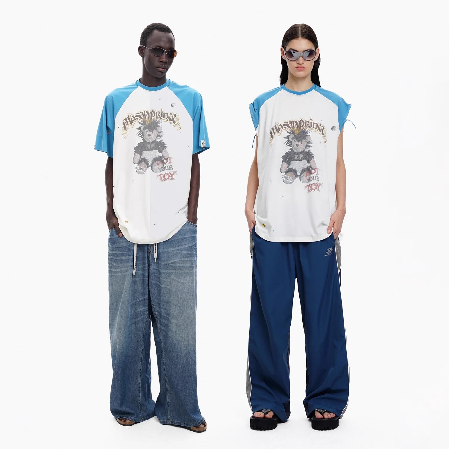 Make a bold statement with this oversized distressed tank or short sleeve top, featuring a playful punk-inspired cartoon bear graphic and the edgy phrase “Not Your Toy.” Designed with contrasting bright blue raglan sleeves, this unisex streetwear staple blends comfort with rebellious flair.