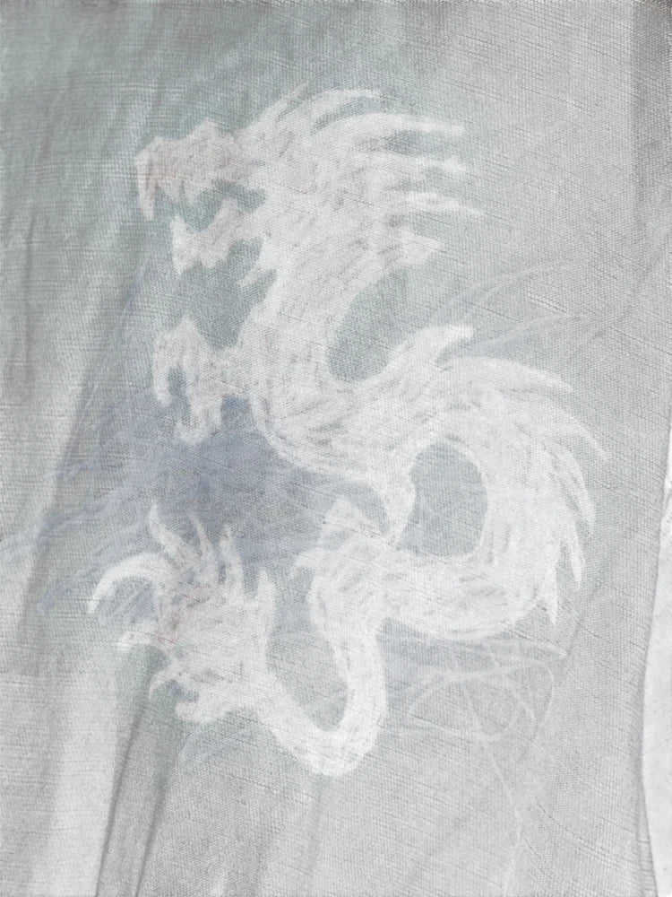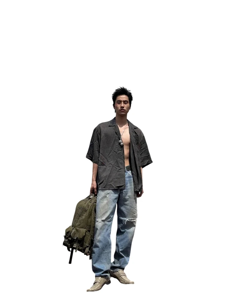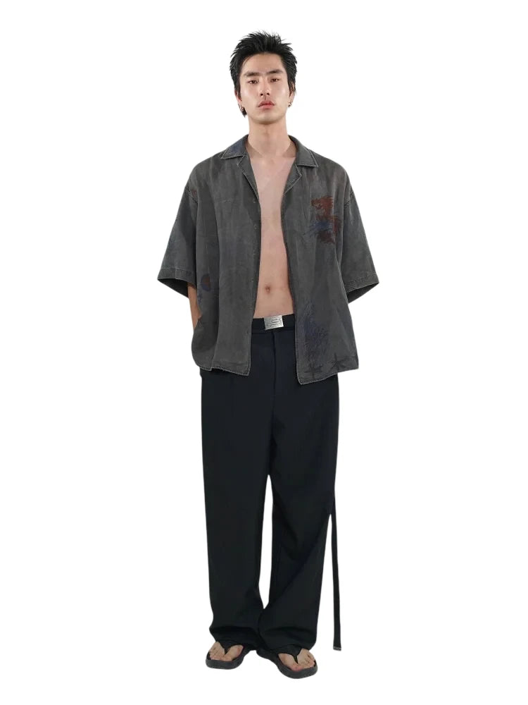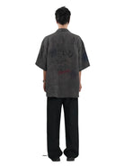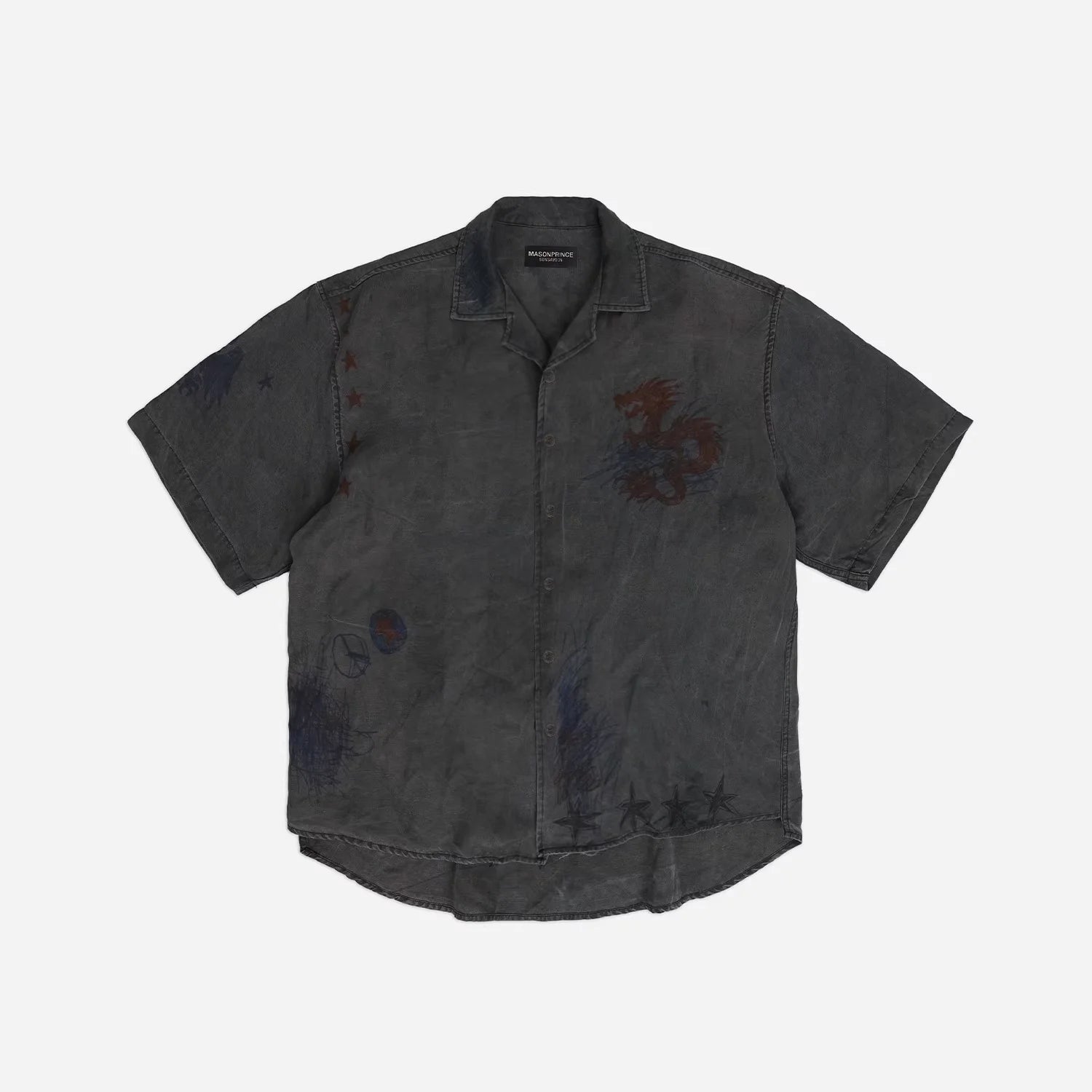 This men's short-sleeved shirt features a relaxed fit and a washed black charcoal tone for an effortlessly worn-in aesthetic. Designed with a camp collar and a slightly curved hem, it offers a casual yet structured silhouette. The shirt is adorned with artistic graphic prints including a red dragon, stars, abstract scribbles, and sketch-like illustrations, creating a distressed, graffiti-inspired look. Subtle seam detailing enhances its edgy character, making it a standout piece for street-inspired fashion.