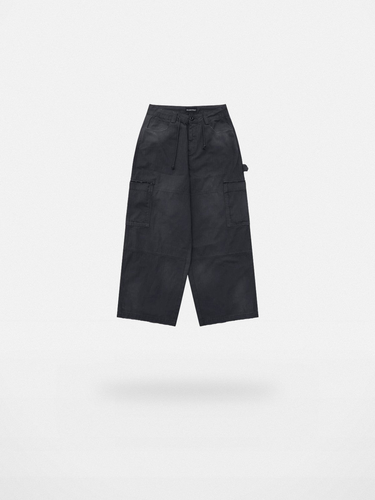 MASONPRINCE's tactical cargo pants in washed 100% cotton. Features distressed raw-edge patch pockets, a drawstring waistband, and reinforced knee panels with carpenter loop details.
