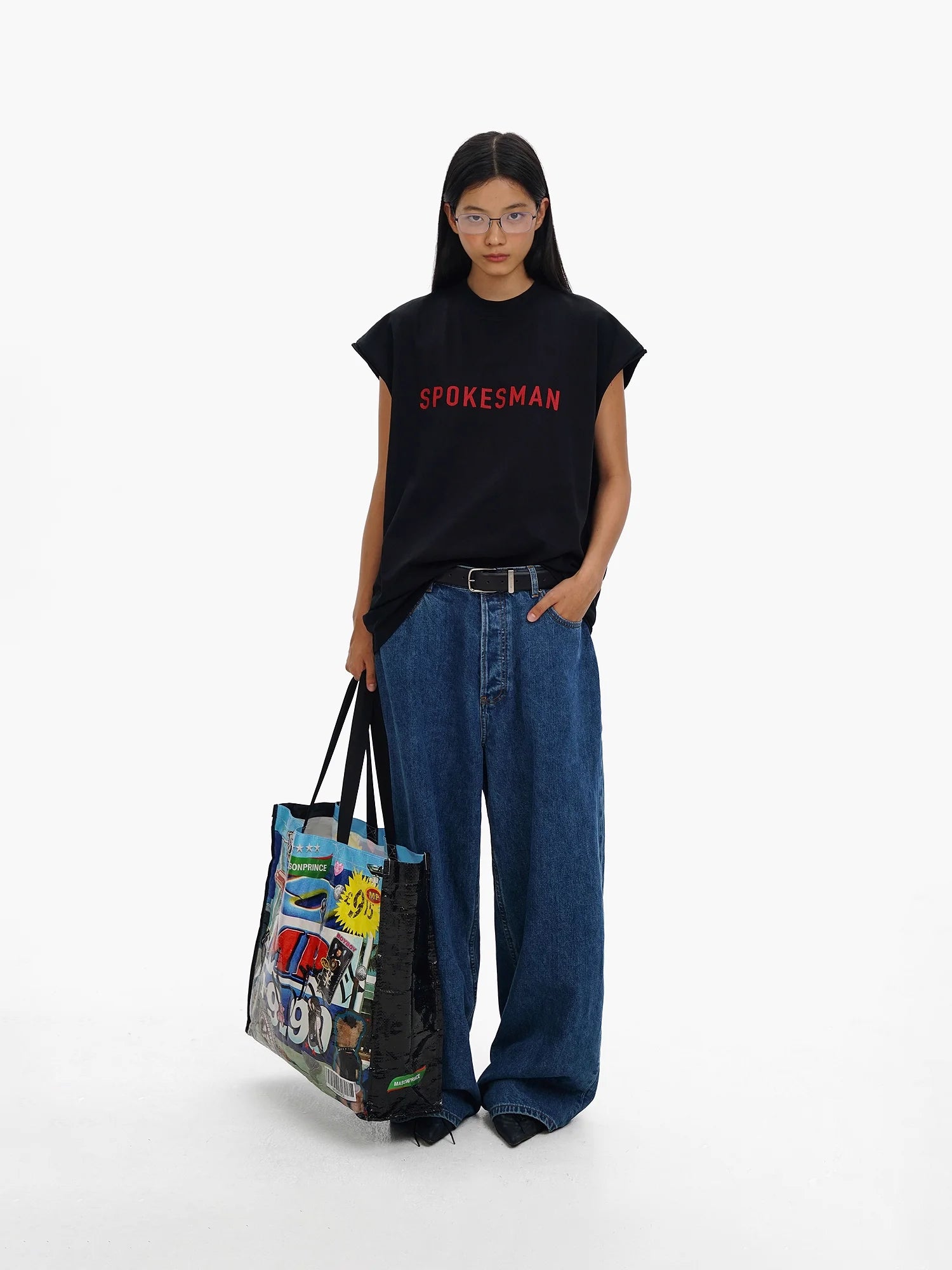 This women's sleeveless top features a relaxed, oversized fit perfect for streetwear styling. Crafted in classic black, it showcases bold red embroidered lettering that reads "SPOKESMAN" across the chest for a striking statement. Wide arm openings and a loose silhouette offer both comfort and laid-back appeal. Ideal for pairing with denim or casual separates.