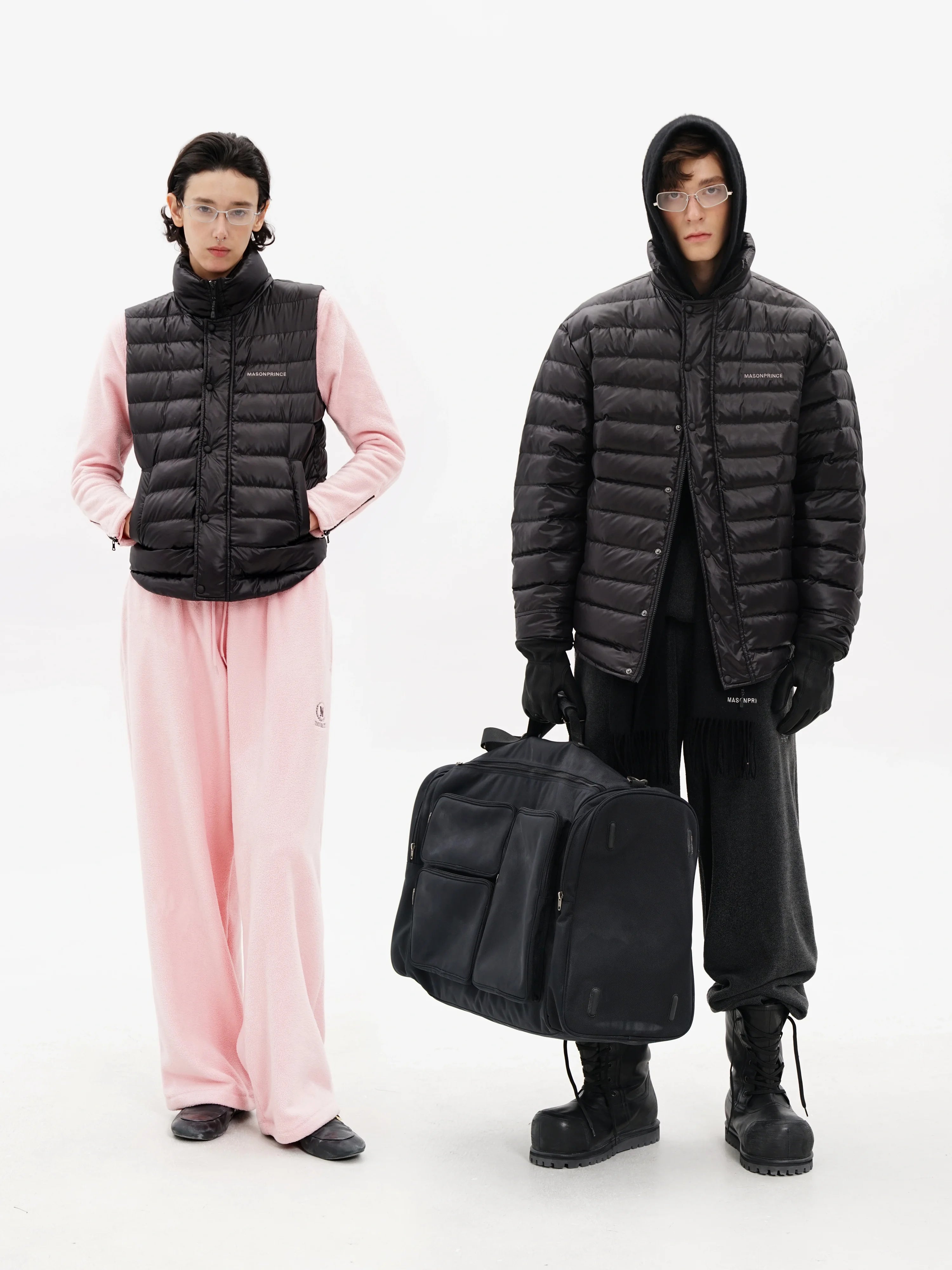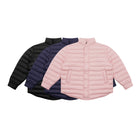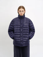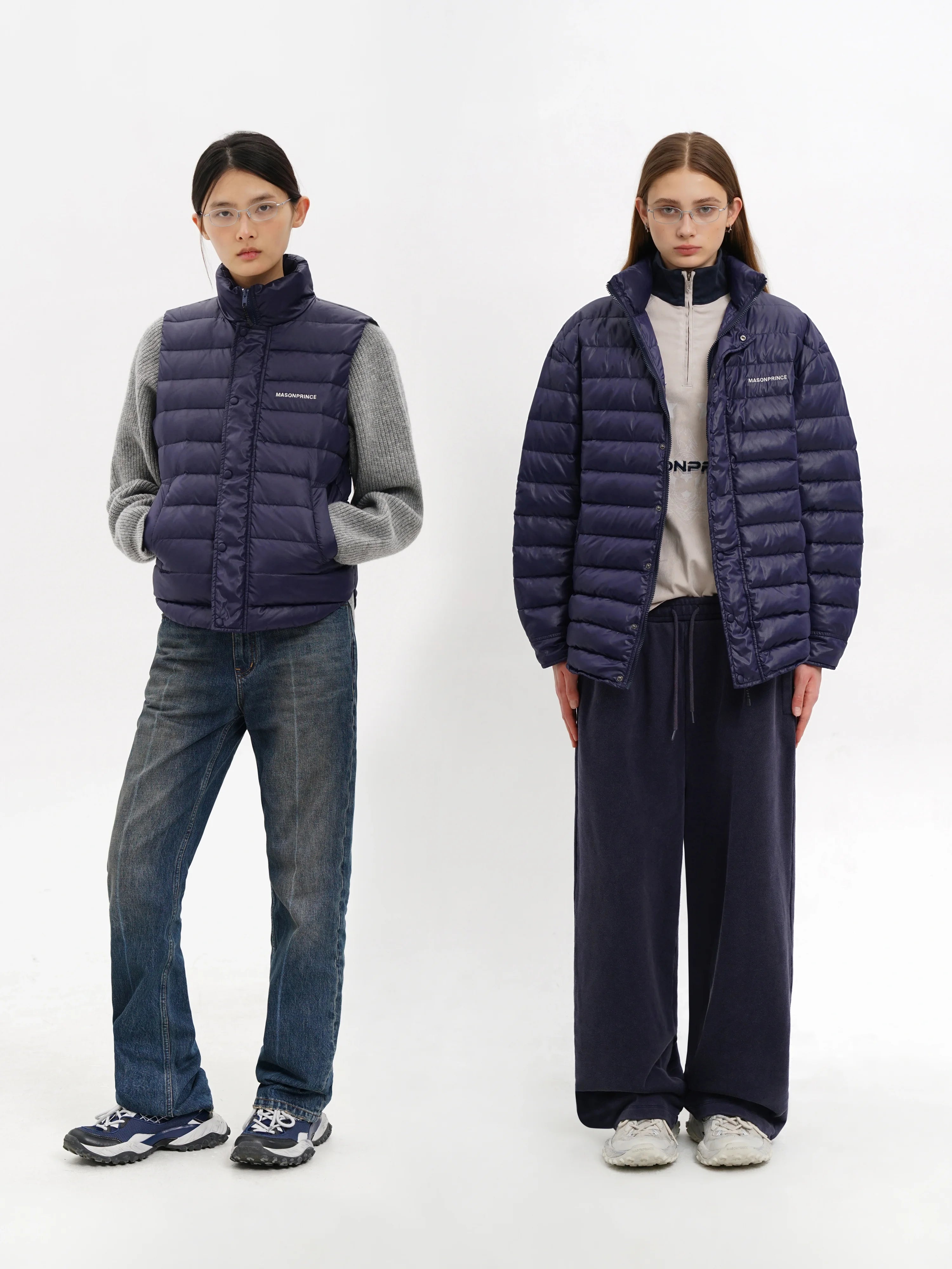 Stay warm and stylish with this lightweight insulated puffer jacket, featuring a 90% white duck down filling for exceptional warmth. Designed with water-resistant fabric, a high collar, and horizontal quilted stitching, this jacket offers functionality and comfort in colder weather. It is available in two distinct styles and a variety of color options including light pink, navy blue, and black. Unisex in design, it includes full front snap button closures and angled front pockets for a modern, versatile look.