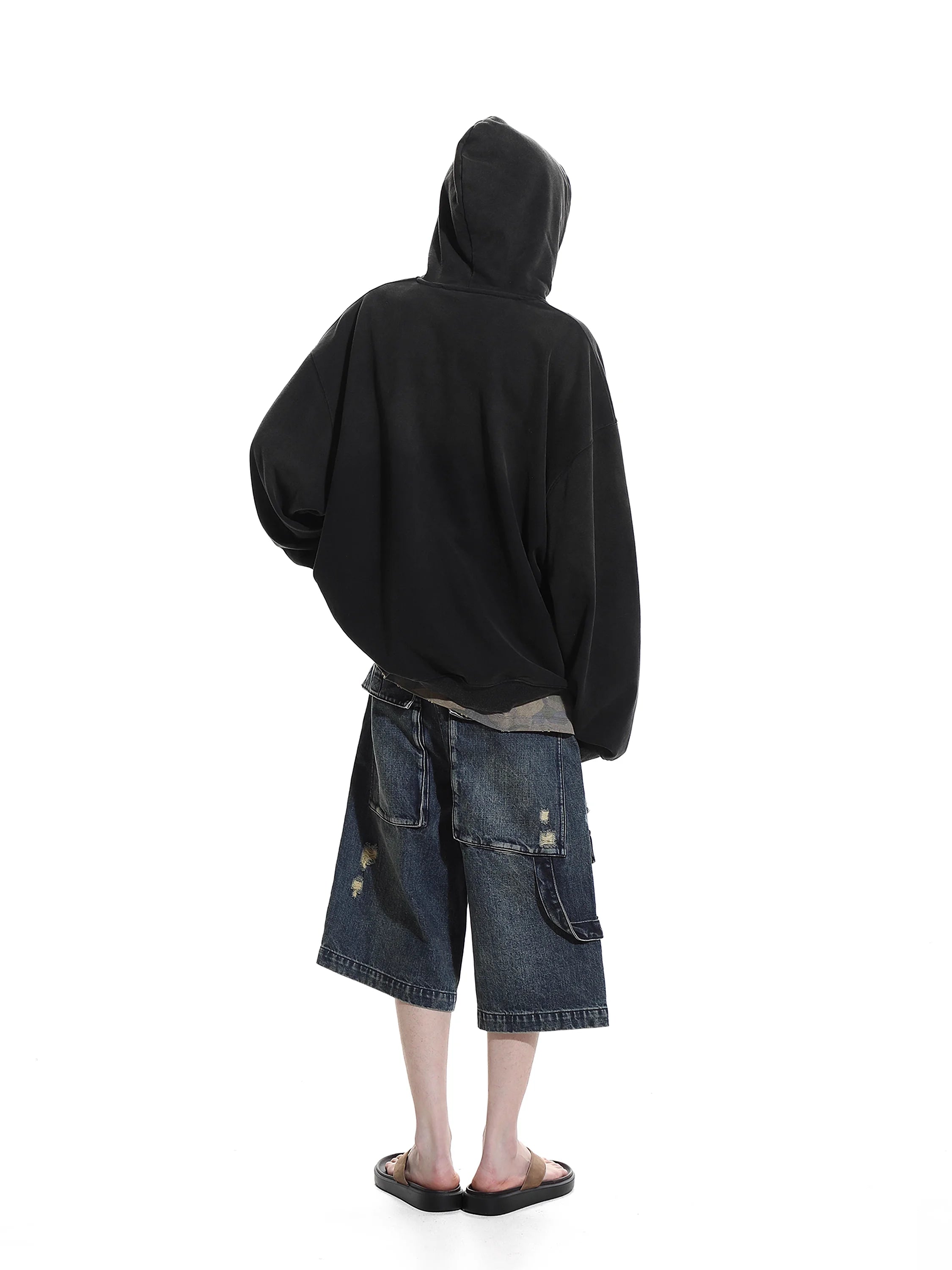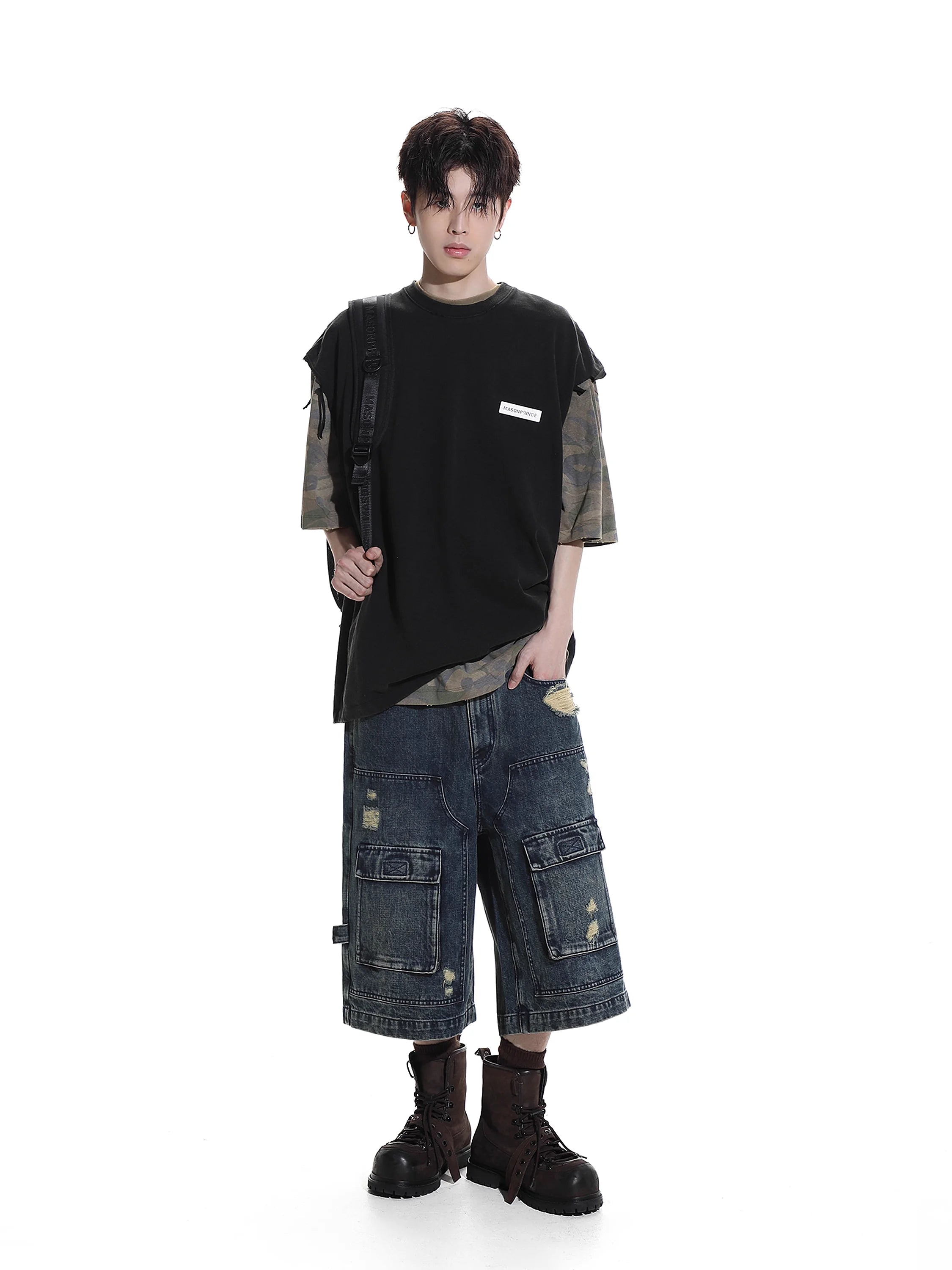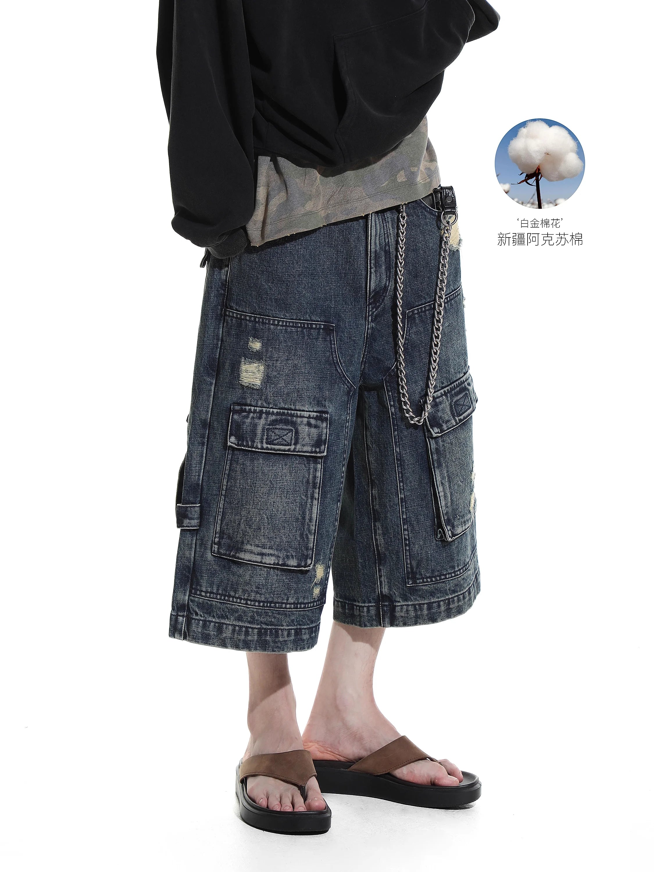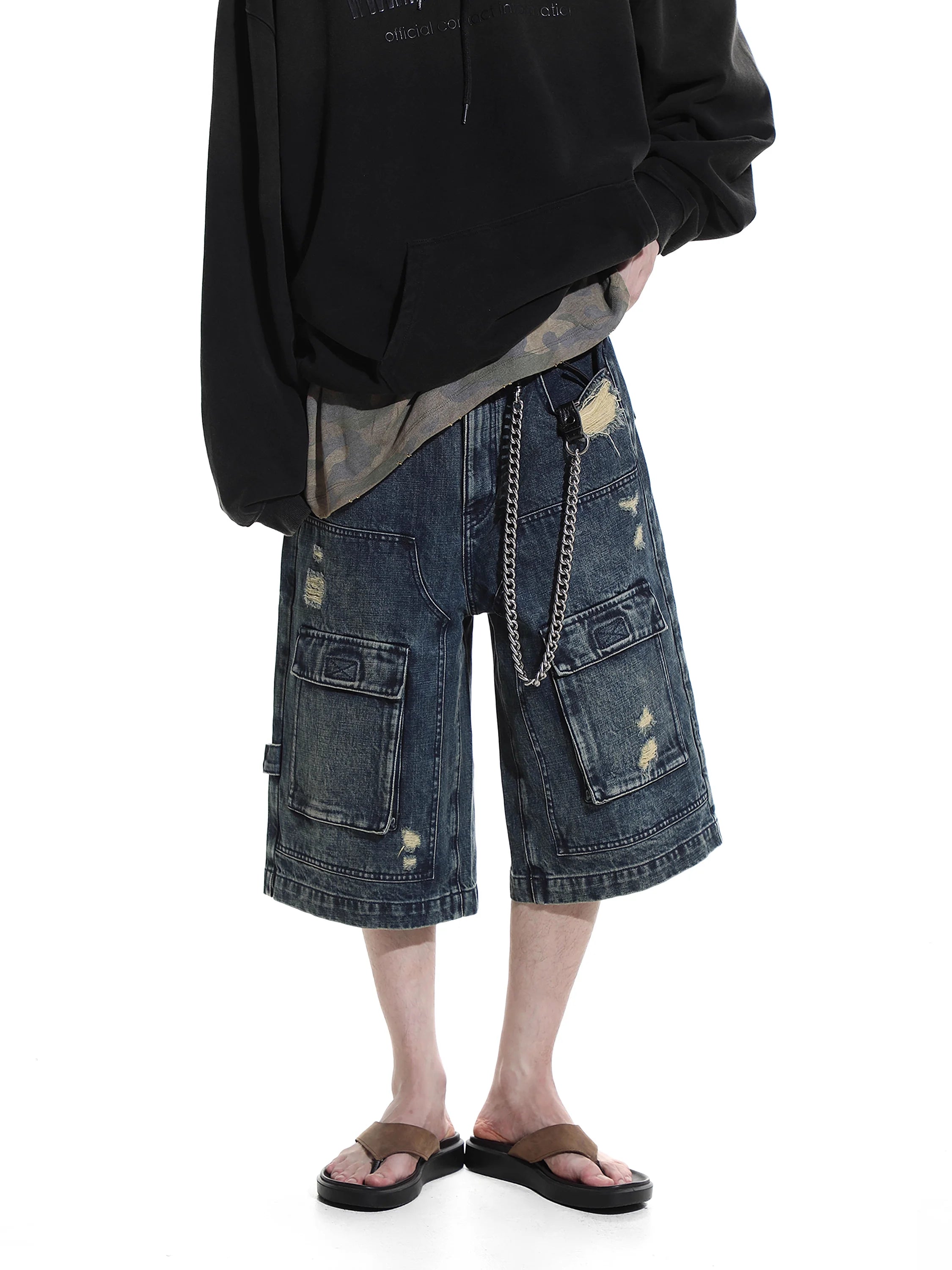 Upgrade your casual wardrobe with these men's retro washed denim cargo shorts. Designed with a rugged, vintage-inspired aesthetic, these knee-length shorts feature multiple utility pockets, including flap cargo pockets on both thighs for added functionality. The distressed detailing and frayed patches create a worn-in look, perfect for relaxed summer style. A button and zip fly closure and classic five-pocket design complete this durable and versatile piece.