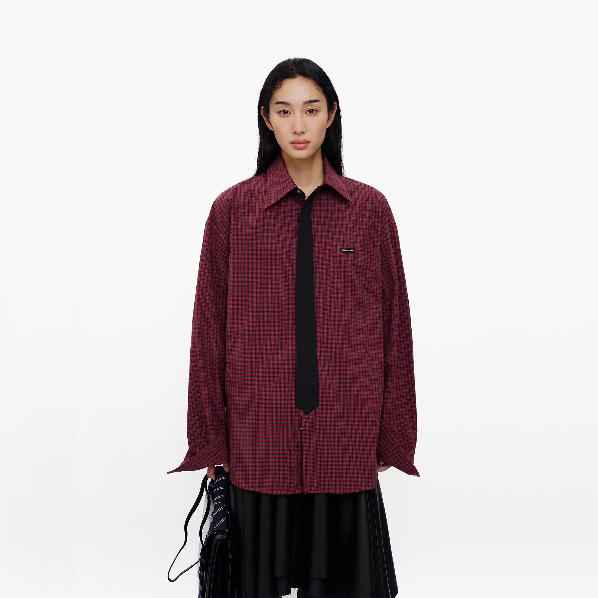 Elevate your casual wardrobe with this oversized plaid long sleeve shirt, designed for a relaxed yet stylish look. Featuring a classic red and black checkered pattern, this shirt offers a laid-back vibe with an old-school washed finish. A classic collar, button-up front, and chest pocket with a subtle logo patch provide essential details, while the included faux black necktie adds a trendy, androgynous touch. Perfect for autumn layering, this shirt is ideal for women who love mixing casual comfort with statement style. Pair it with a skirt or trousers for a complete look that stands out effortlessly.