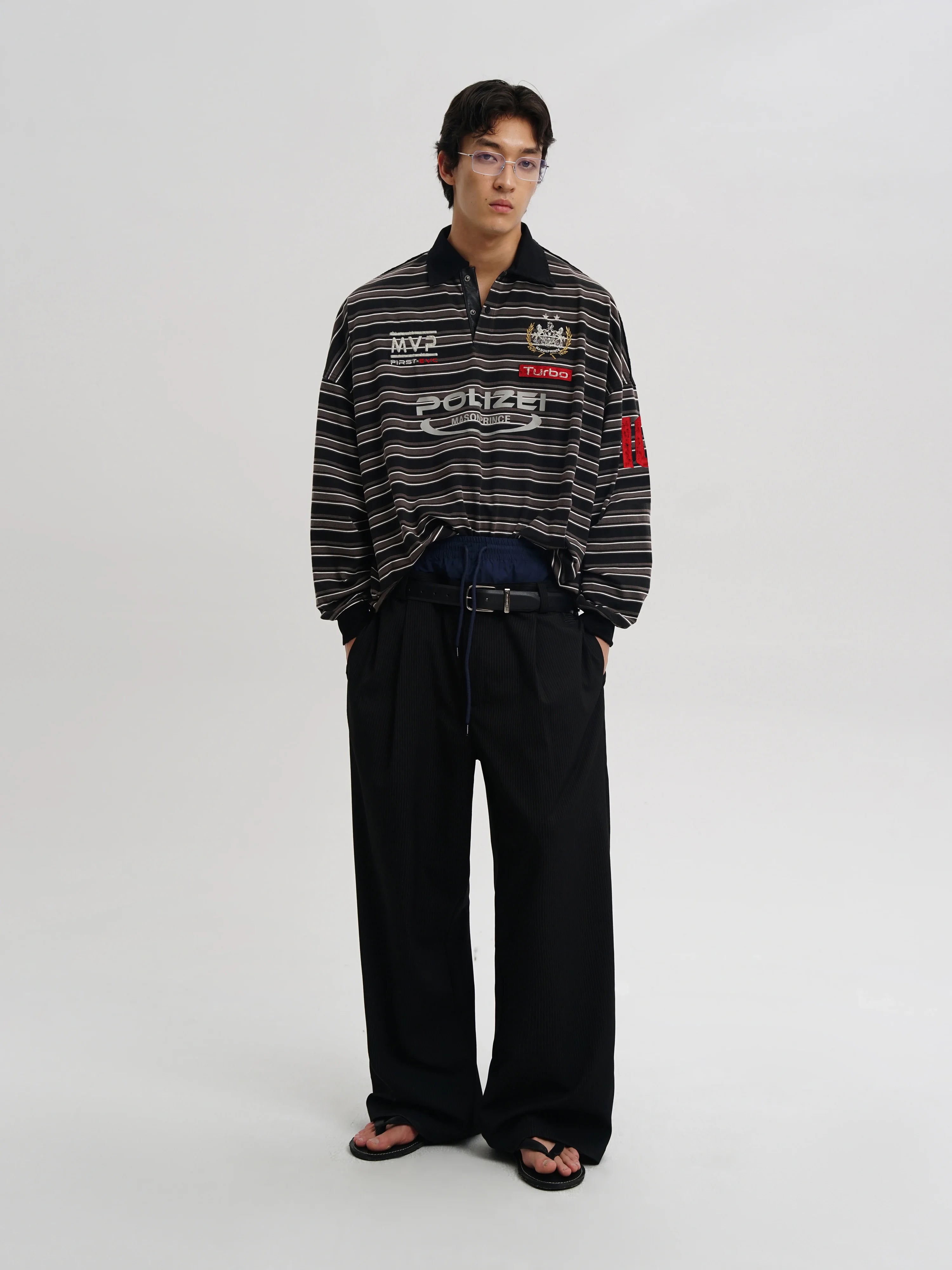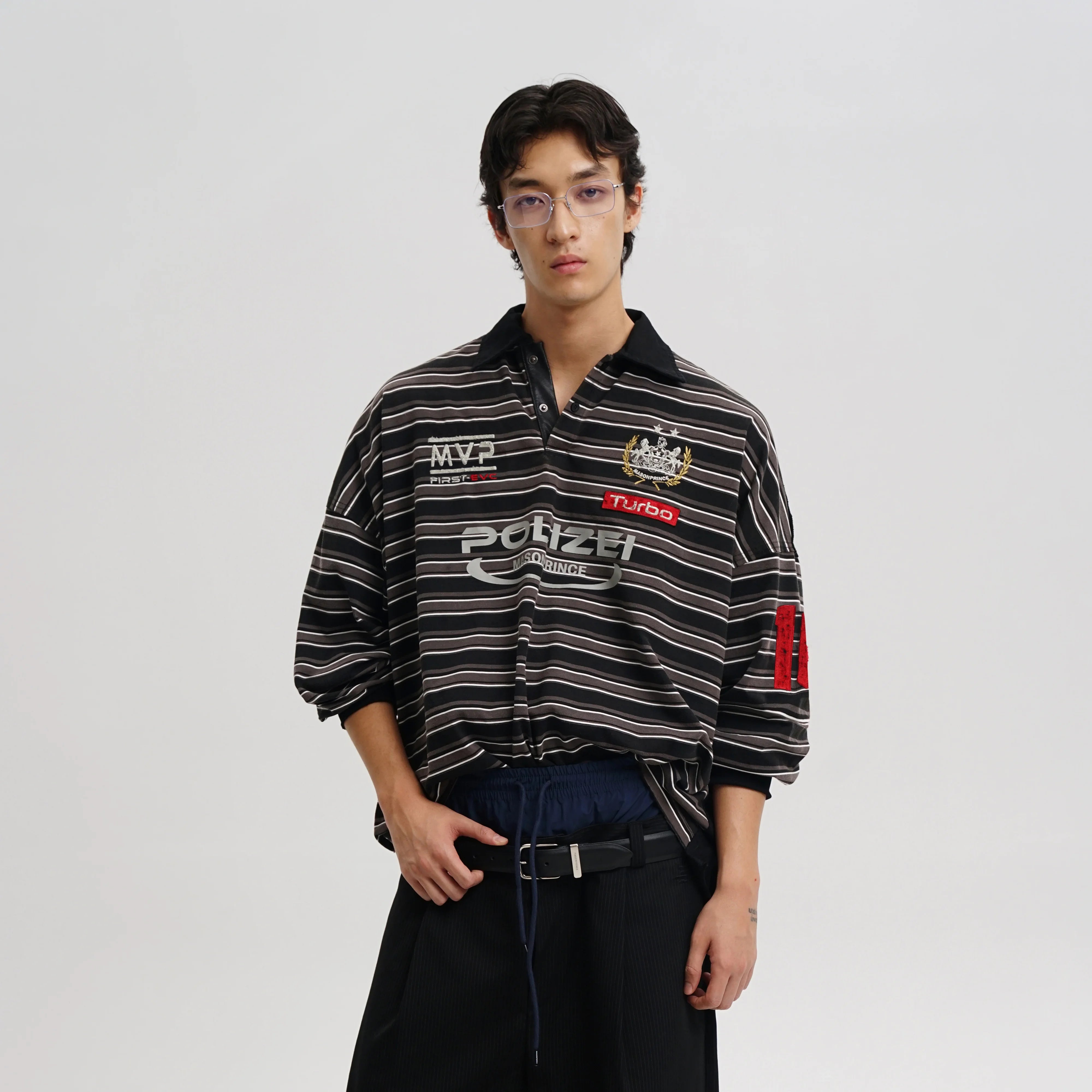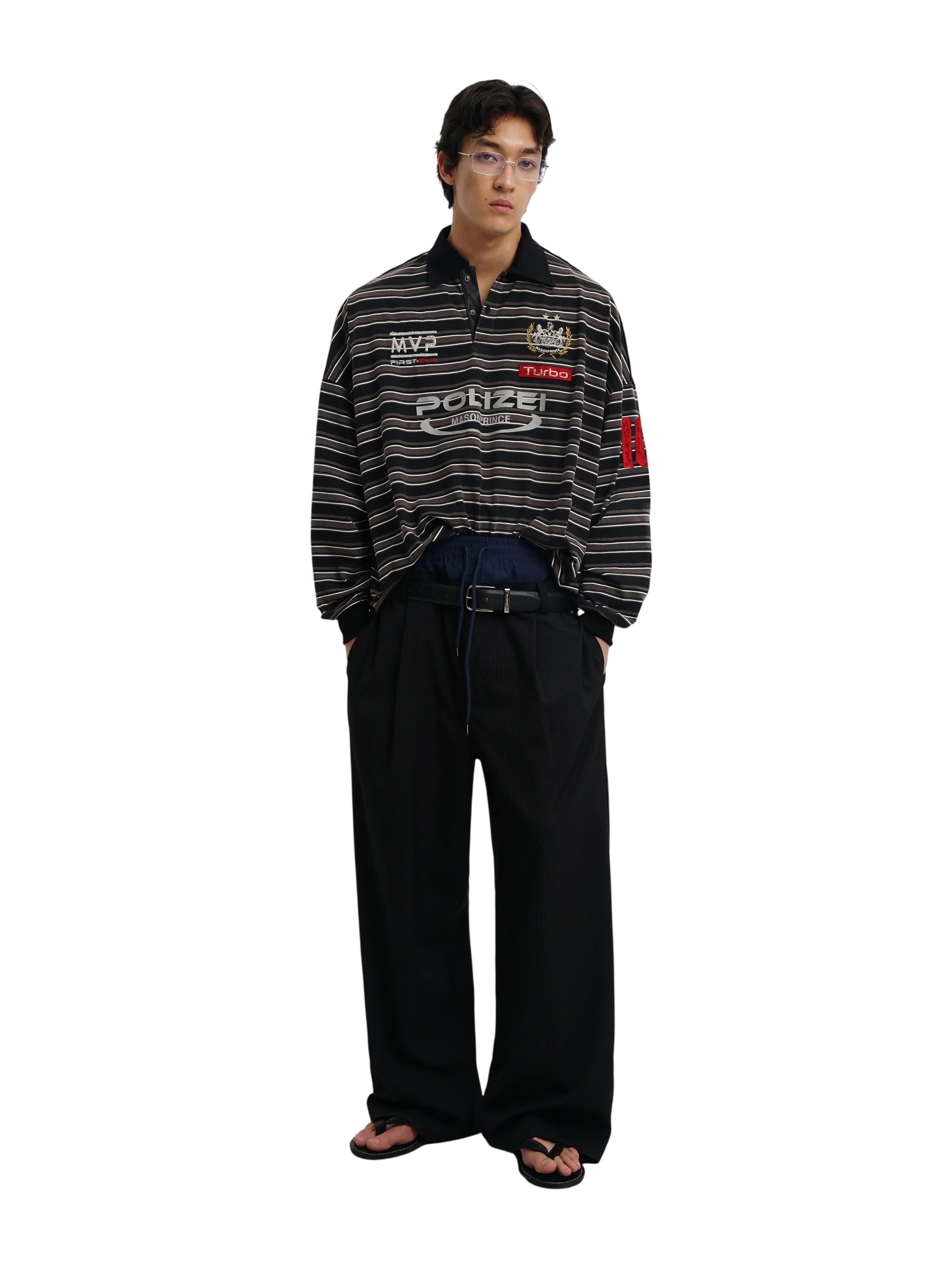 This men's long sleeve rugby-style polo shirt features bold black and white horizontal stripes for a striking sporty look. Designed with an oversized fit, it includes distinctive graphic patches and logos such as "MVP," "Turbo," and "Polizei," adding a unique streetwear edge. The black collar and button-up neckline, along with rolled-up sleeves, contribute to its casual and contemporary style. Ideal for pairing with tailored bottoms for a balanced, fashion-forward ensemble.