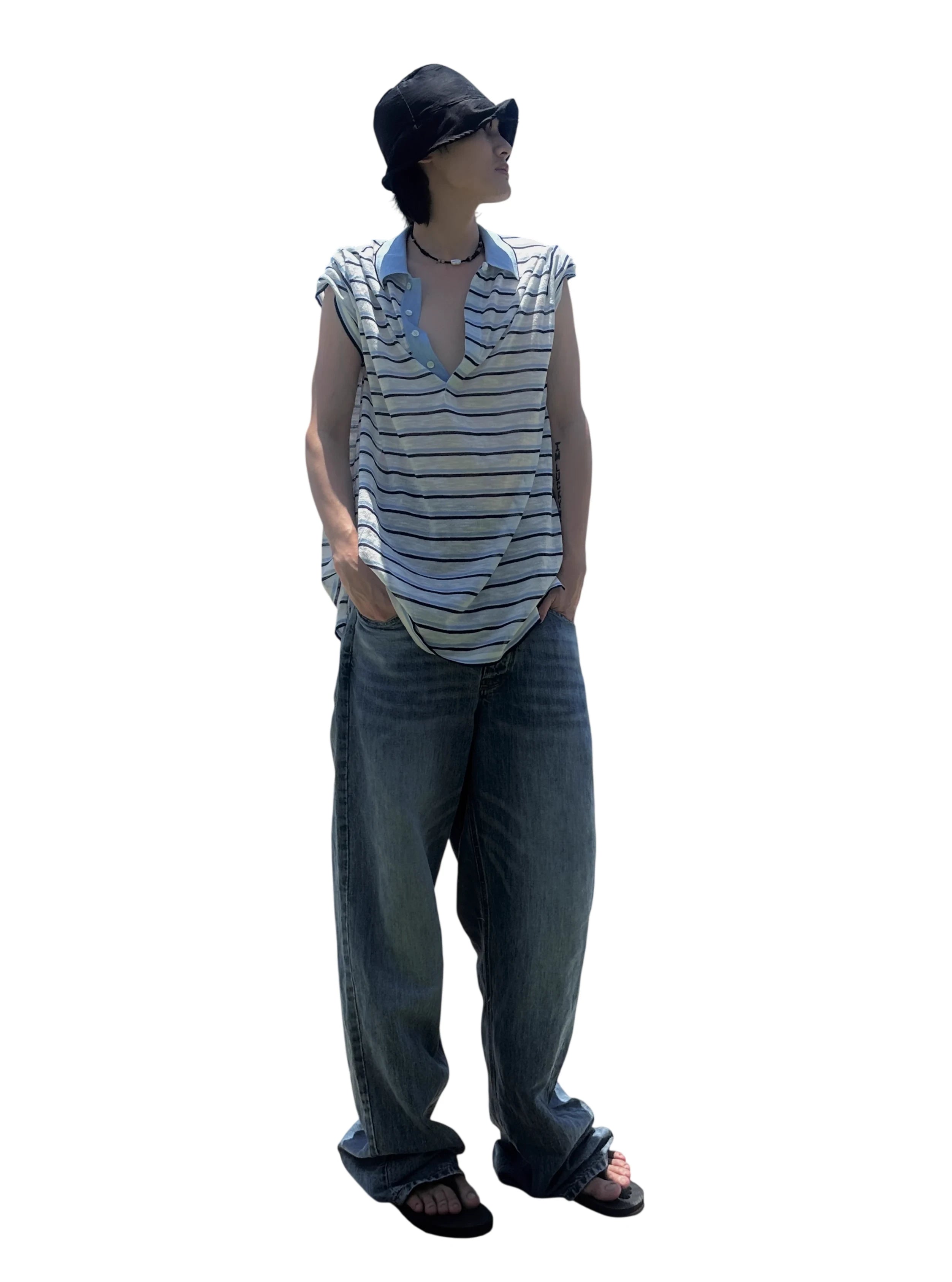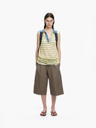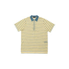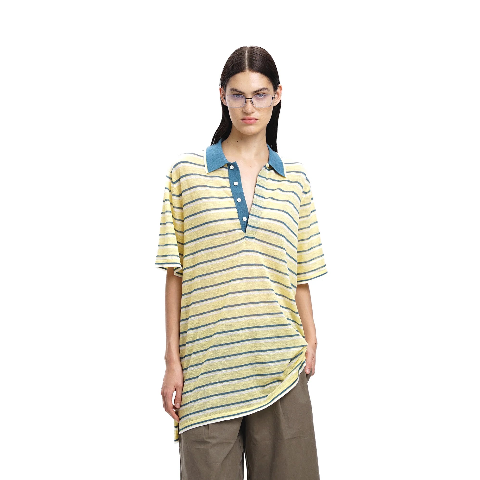 Elevate your casual wardrobe with this women's Tencel linen polo shirt, designed for effortless style and comfort. Featuring a relaxed, oversized fit, this short-sleeve top showcases a charming horizontal stripe pattern in soft yellow, white, and teal. A contrasting blue collar and deep buttoned placket with a V-shaped neckline add visual interest and a nautical touch. The lightweight, breathable fabric makes it an ideal choice for warm-weather wear.
