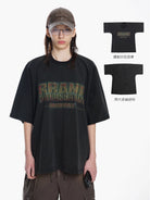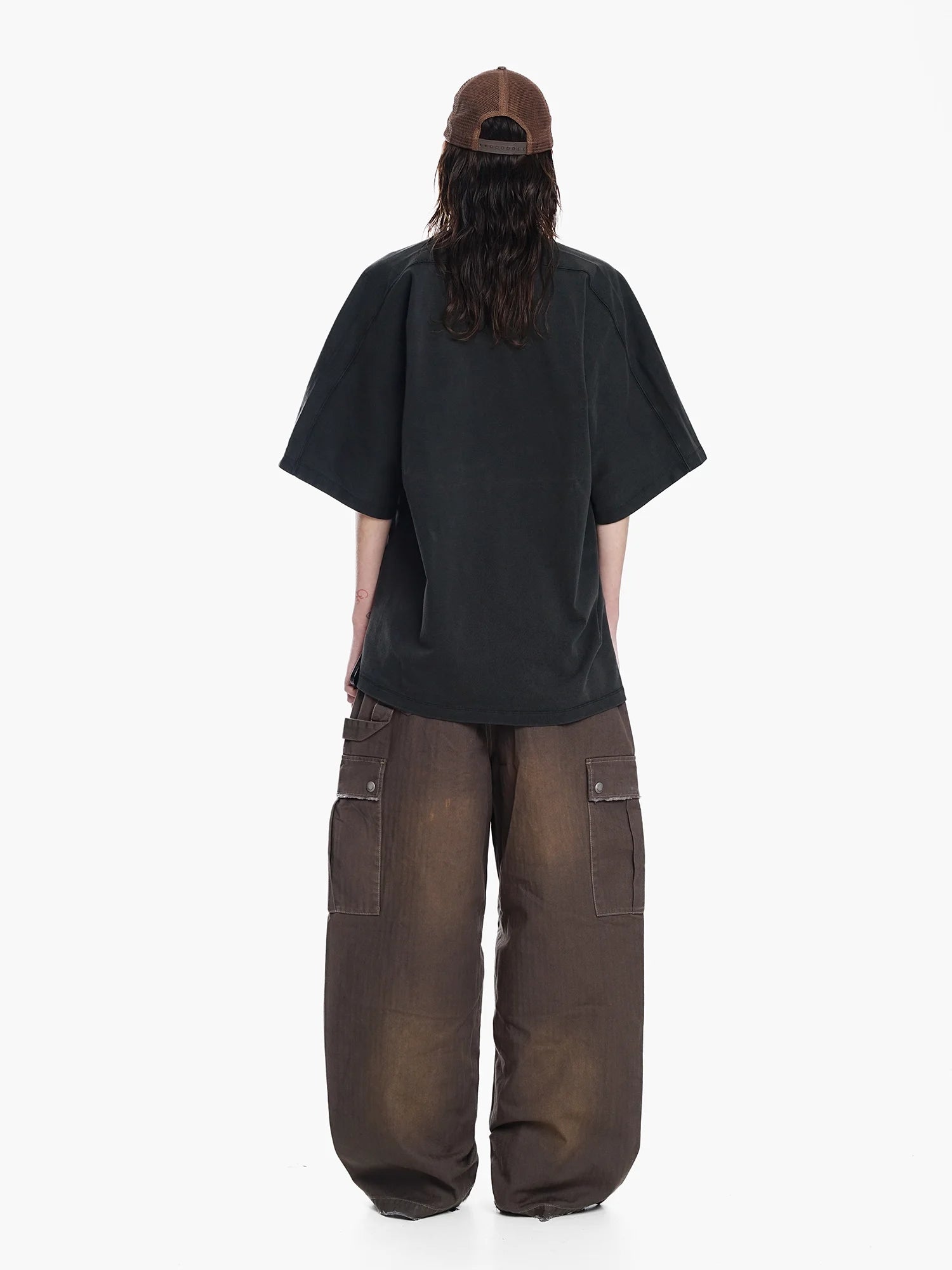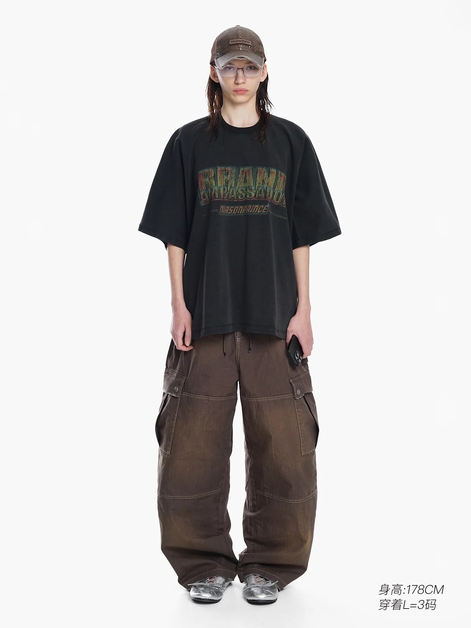 This men's two-piece set features a raglan sleeve A-line short t-shirt designed with vintage inspiration. The top showcases bold graphic text, enhancing its retro streetwear appeal. Paired with comfortable brown cargo pants, the outfit delivers a casual, utilitarian look complemented by rugged details. A perfect choice for modern urban style with a grunge edge.