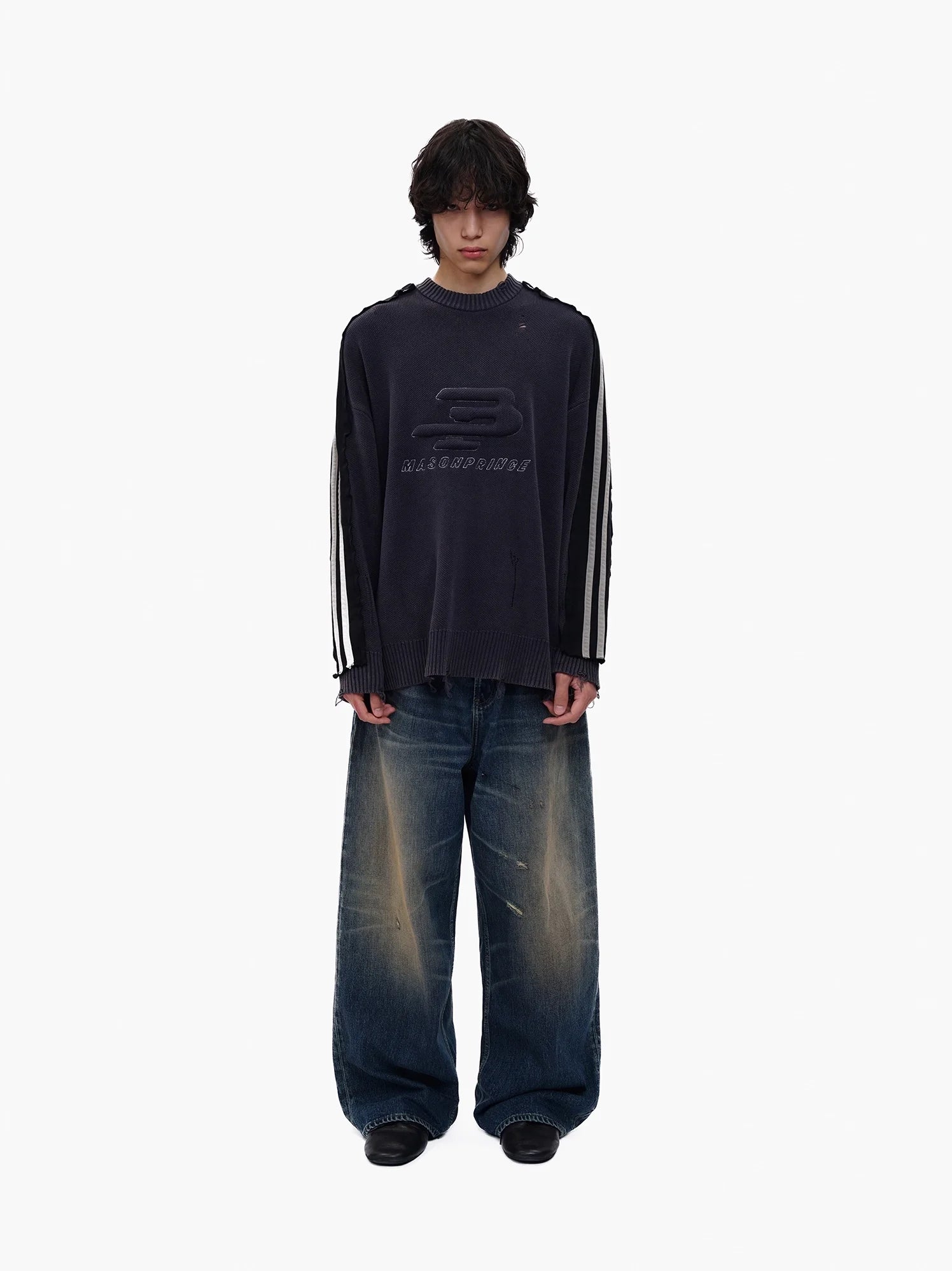 Elevate your streetwear style with this unisex 3D embroidered knit sweater, featuring a faded stripe design and subtle embossed logo detail at the chest. The distressed hem and relaxed fit bring a laid-back edge, while the soft knit fabric ensures comfort for everyday wear. Designed for both men and women, this crewneck sweater effortlessly blends sporty and casual aesthetics, making it a versatile addition to any modern wardrobe.