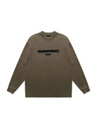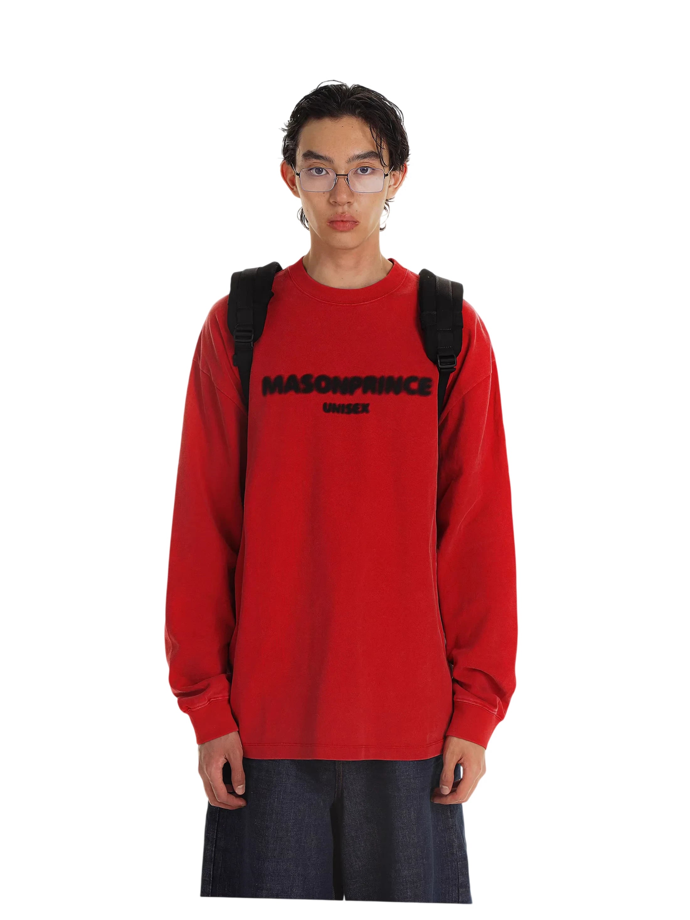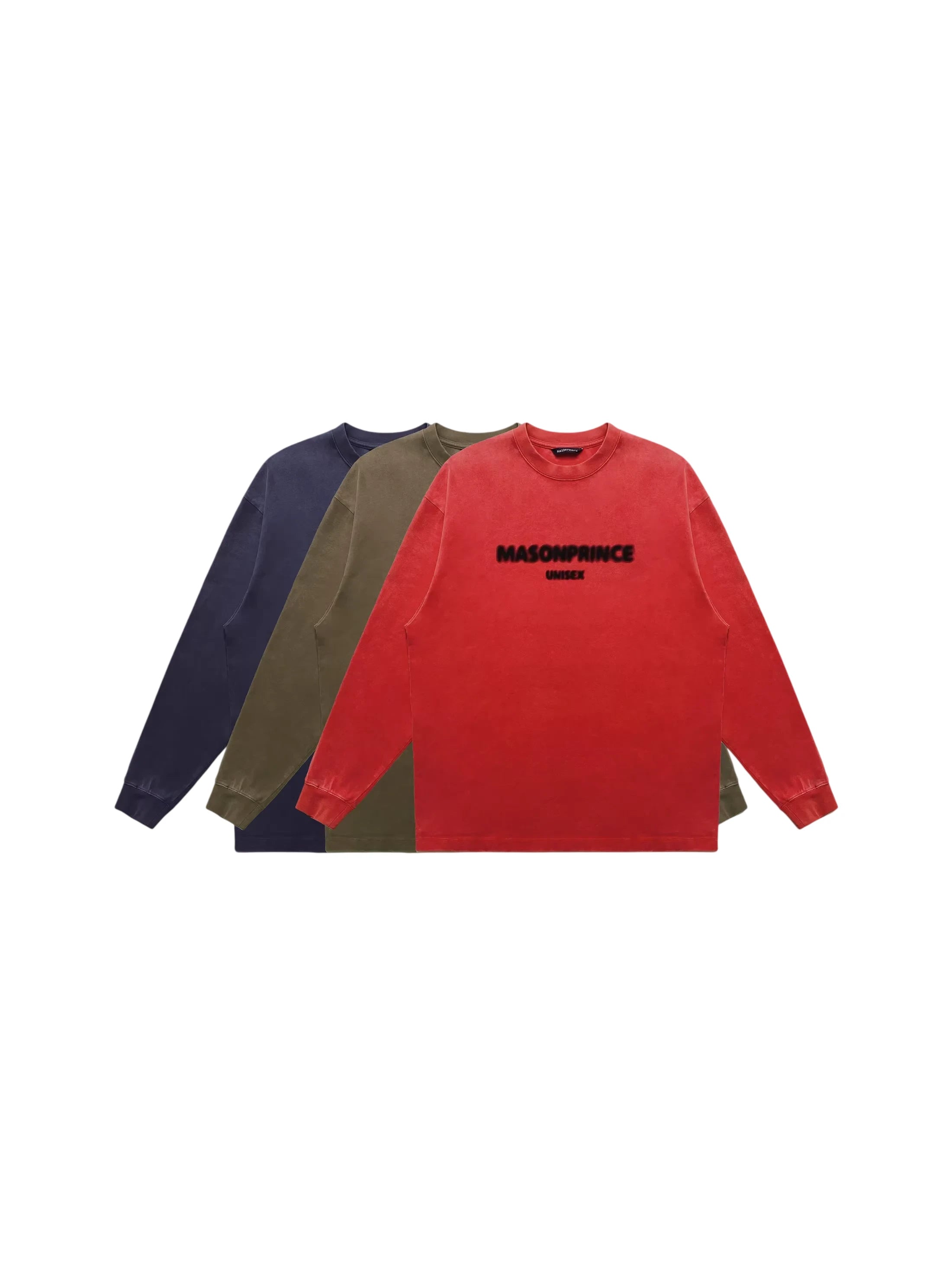 Elevate your casual wardrobe with this unisex long sleeve T-shirt, featuring a relaxed fit and classic crewneck design. Available in navy blue, olive green, and red, each shirt showcases a bold blurred print on the chest with a vintage-inspired, worn-dye finish. Crafted from soft, comfortable fabric, it's an ideal layering piece for cool autumn days.