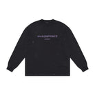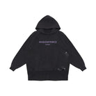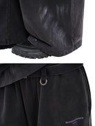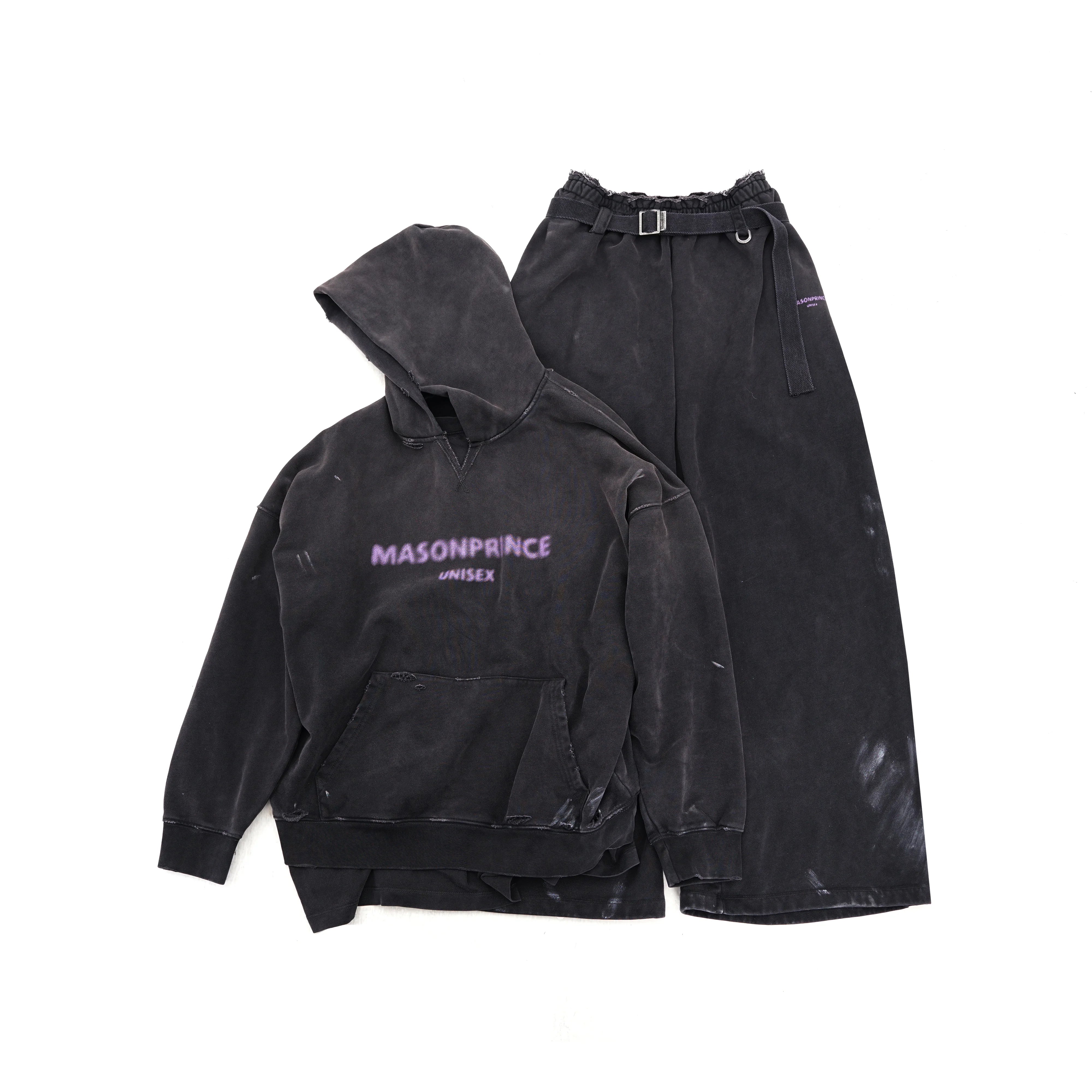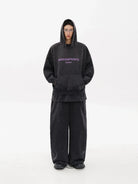 Elevate your streetwear collection with this unisex sweatshirt and pants set featuring a distinctive worn-in, layered look. The black washed hoodie includes a front kangaroo pocket and bold purple spray-painted text at the center, giving it a distressed, urban edge. Paired with matching high-waisted, wide-leg pants, this set offers a relaxed fit and contemporary silhouette. The pants feature a belted waistband for a customizable fit and subtle branding details that enhance their vintage appeal. Perfect for everyday comfort with a timeless, laid-back style.