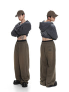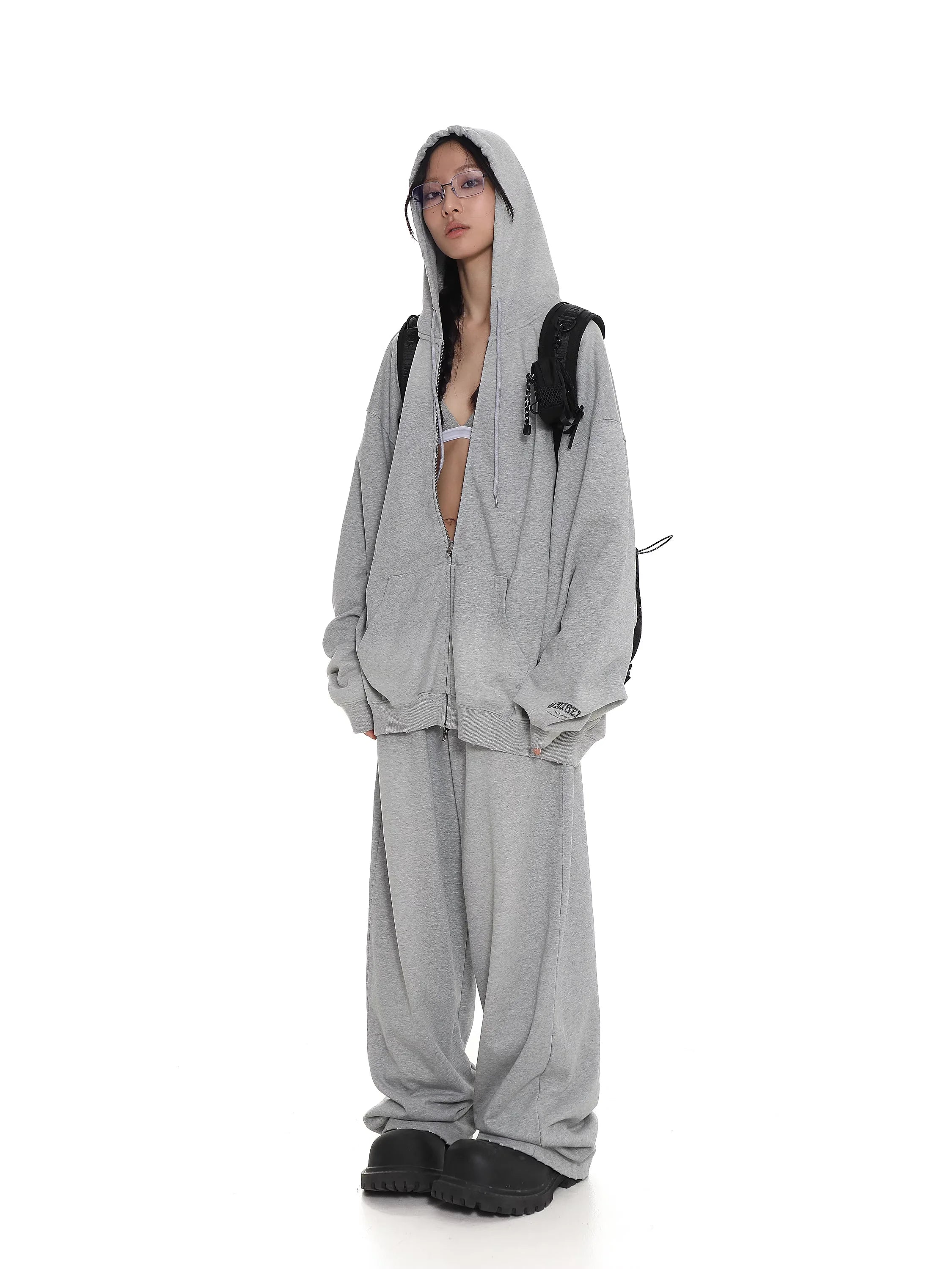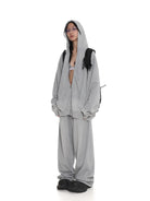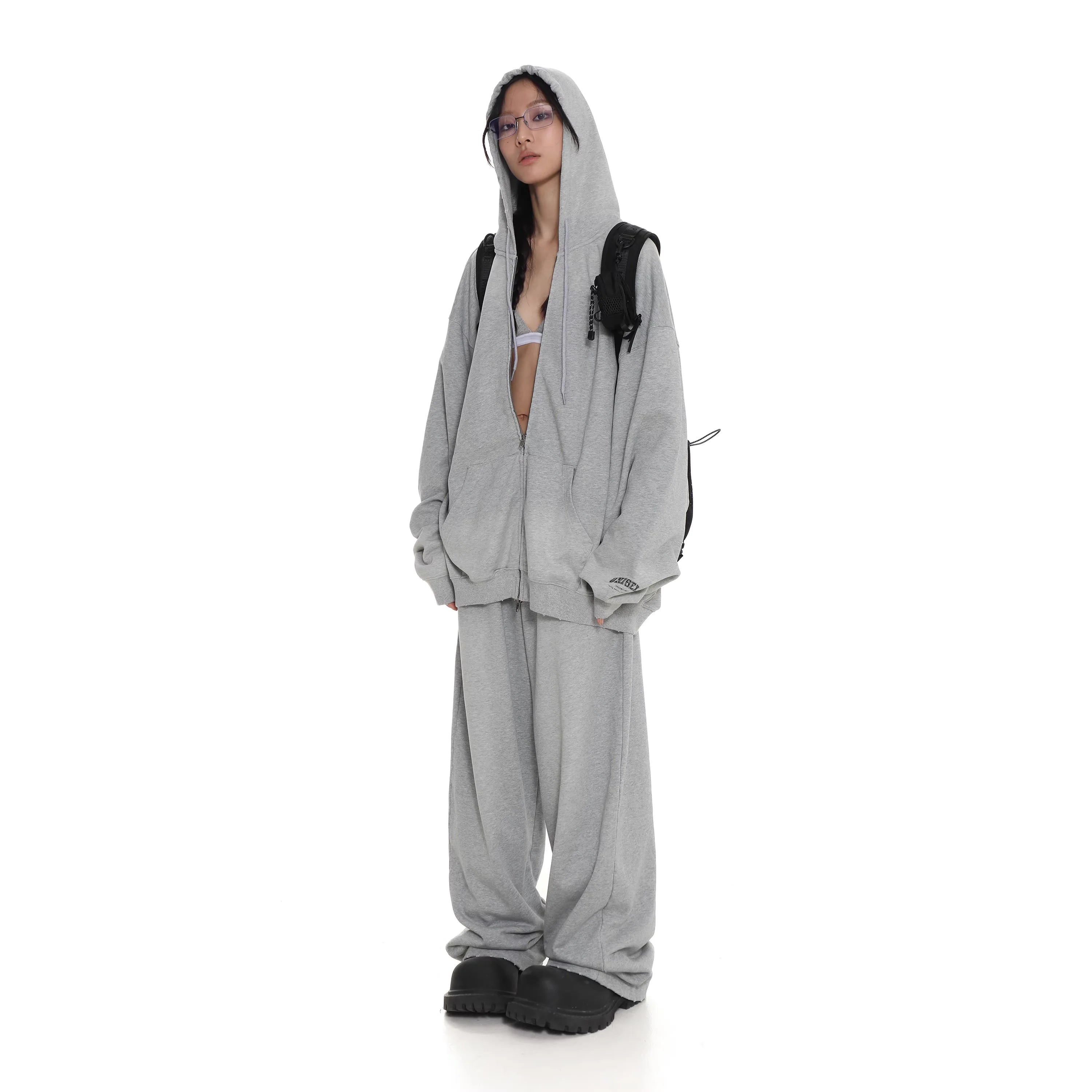 This unisex loungewear set features a versatile and lightweight design, perfect for casual or relaxed settings. The outfit includes an oversized grey zip-up hoodie with a relaxed fit, front zipper closure, and subtle logo detail near the left sleeve cuff. Complementing the hoodie are matching baggy 3XL grey sweatpants, offering a comfortable and contemporary silhouette.