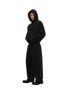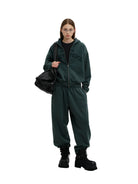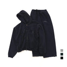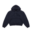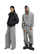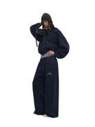 Stay comfortable and stylish with this unisex two-piece loungewear set. The set includes a deep navy zip-up hoodie featuring a hood, kangaroo pocket, and subtle raised appliqué text across the chest, paired with matching jogger pants. The joggers are designed with an elastic waistband and adjustable drawstrings for a relaxed fit, and feature tonal text detail on the thigh for a sleek monochromatic look. Ideal for casual wear or lounging, this set blends comfort with minimalistic style.