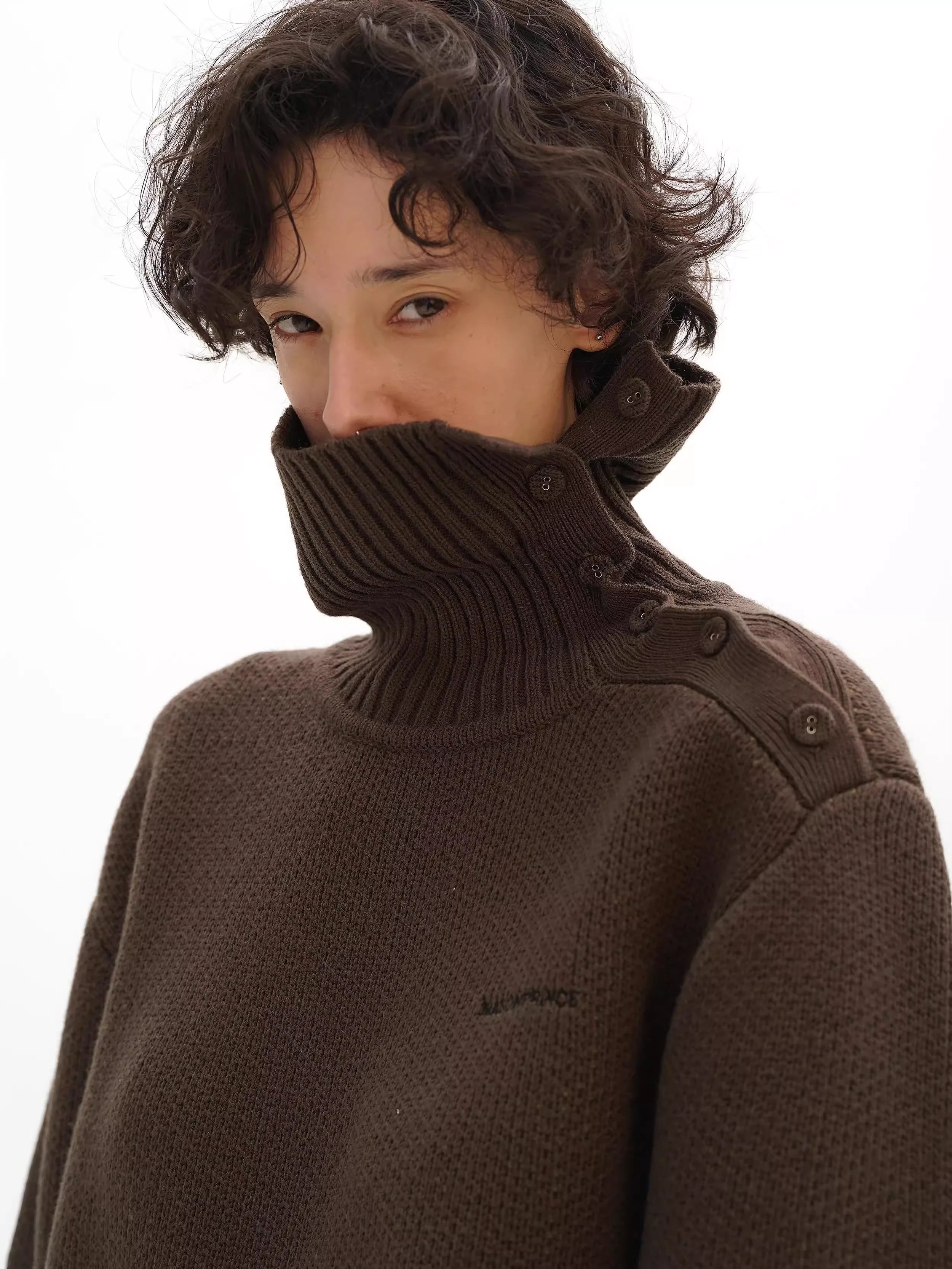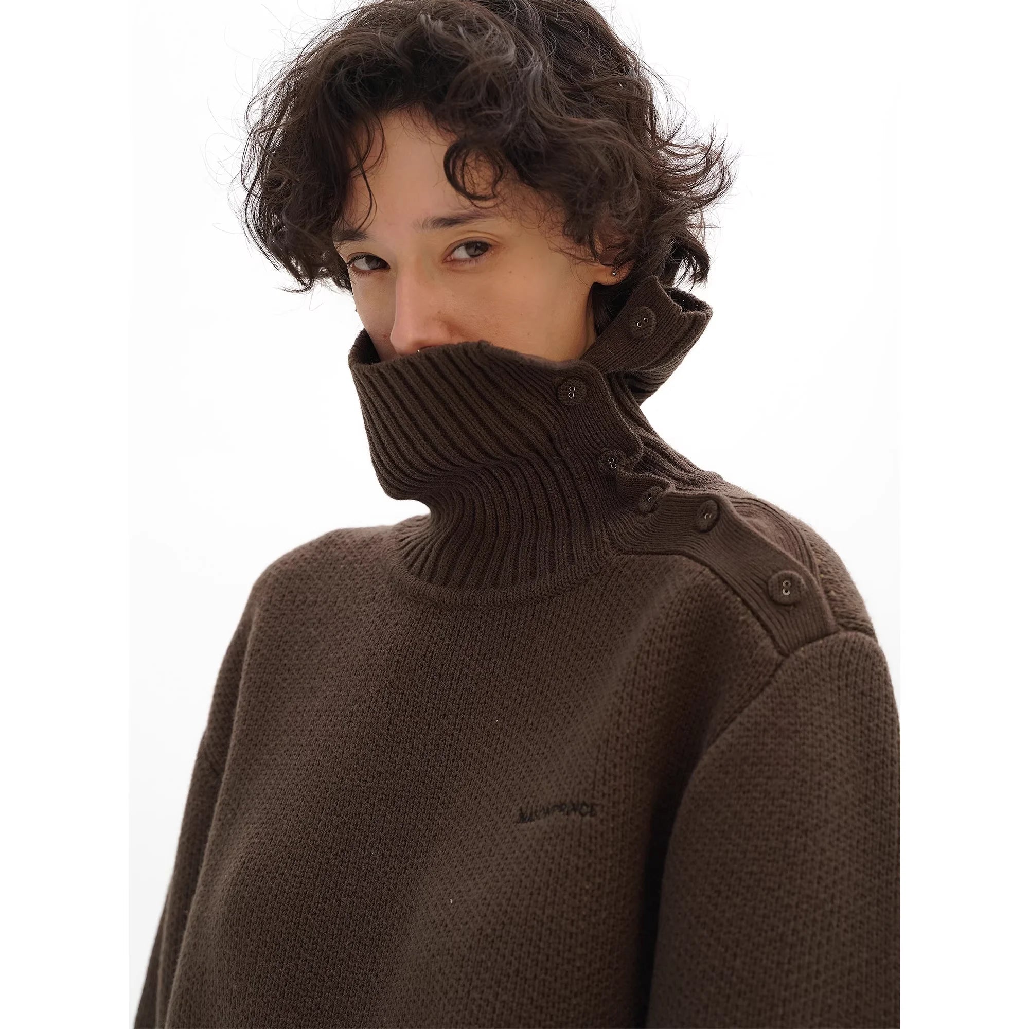 Stay warm and stylish with this unisex self-heating turtleneck sweater, crafted from a thick, textured knit ideal for winter wear. The high ribbed turtleneck extends to cover most of the neck, offering added warmth and comfort, while an asymmetrical button closure on the shoulder adds a unique and functional design element. Subtle embroidery on the chest and a slightly oversized fit provide both minimalistic appeal and cozy sophistication.