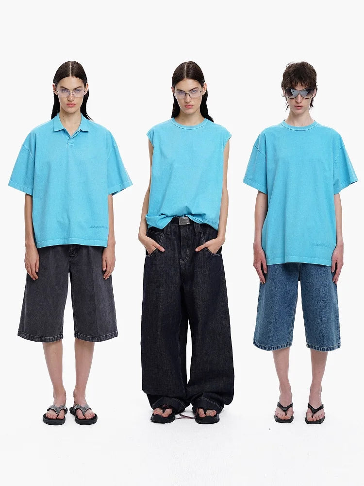 Elevate your casual wardrobe with these unisex washed turquoise blue tops, offered in three versatile street-style designs. Choose from a collared short-sleeve shirt, a sleeveless muscle tee, or an oversized basic T-shirt. Crafted from breathable cotton with a washed finish and subtle embossed detailing, each piece is designed for both comfort and visual appeal.