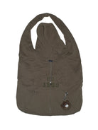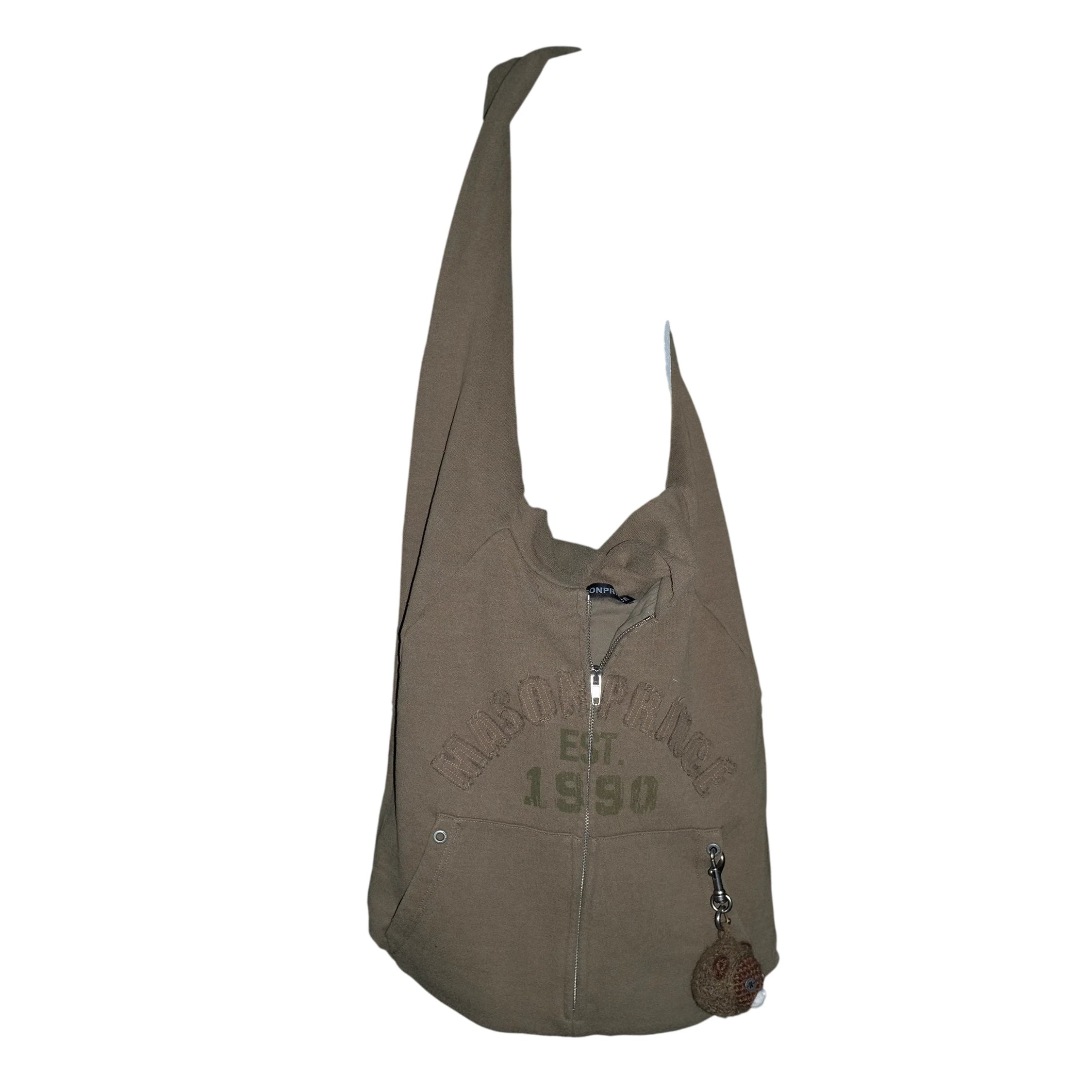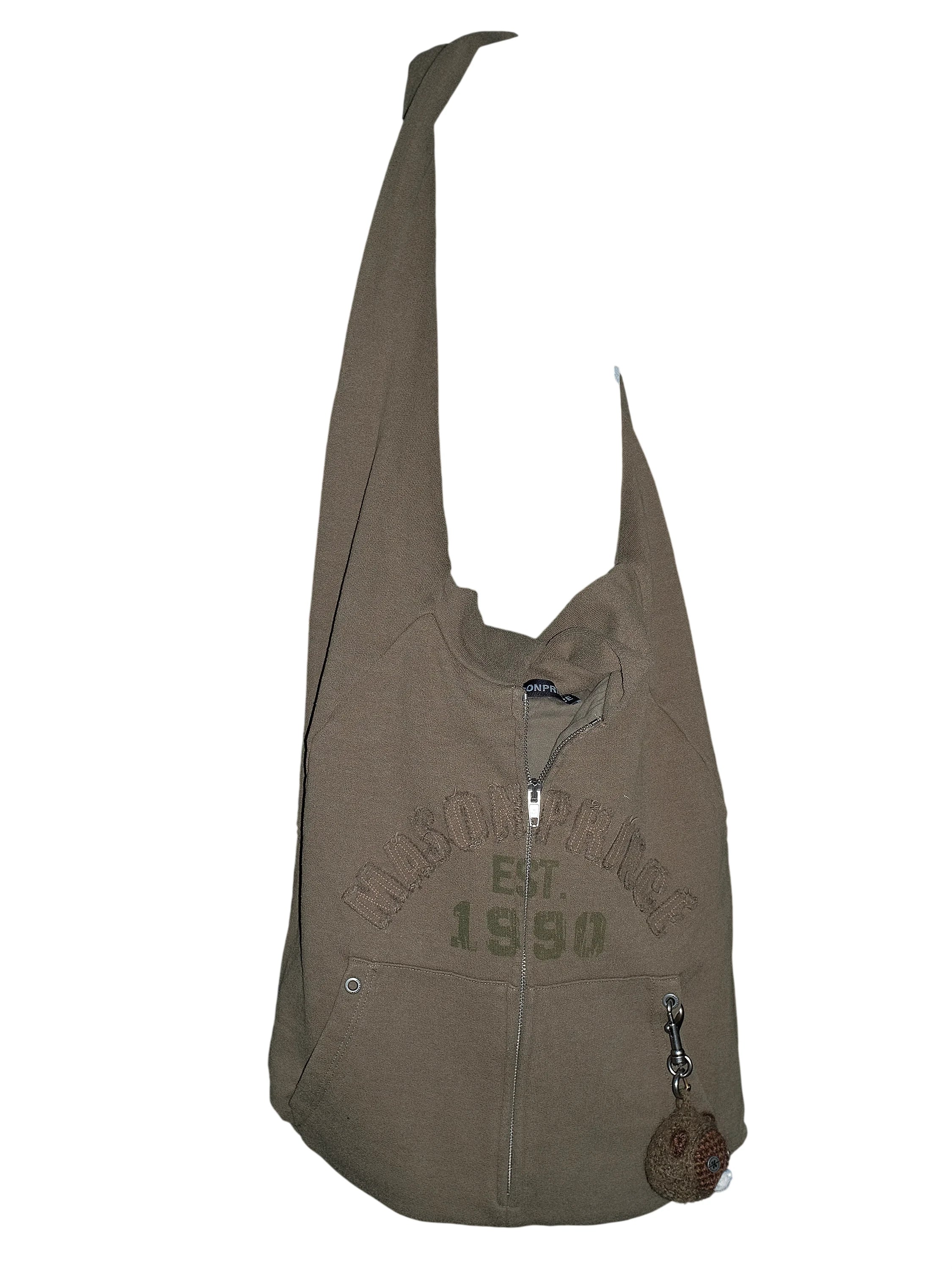 This tote bag is creatively made from a repurposed khaki-colored hoodie, bringing a unique and sustainable twist to everyday accessories. The front of the bag features a zipper closure and tonal green embroidered text, giving it a distinctive, worn-in look. Decorative grommet details at the bottom hint at the bag's original design, while a whimsical crocheted keychain adds a playful touch. Designed for versatile use, this unisex piece is perfect for those who appreciate inventive fashion with character.