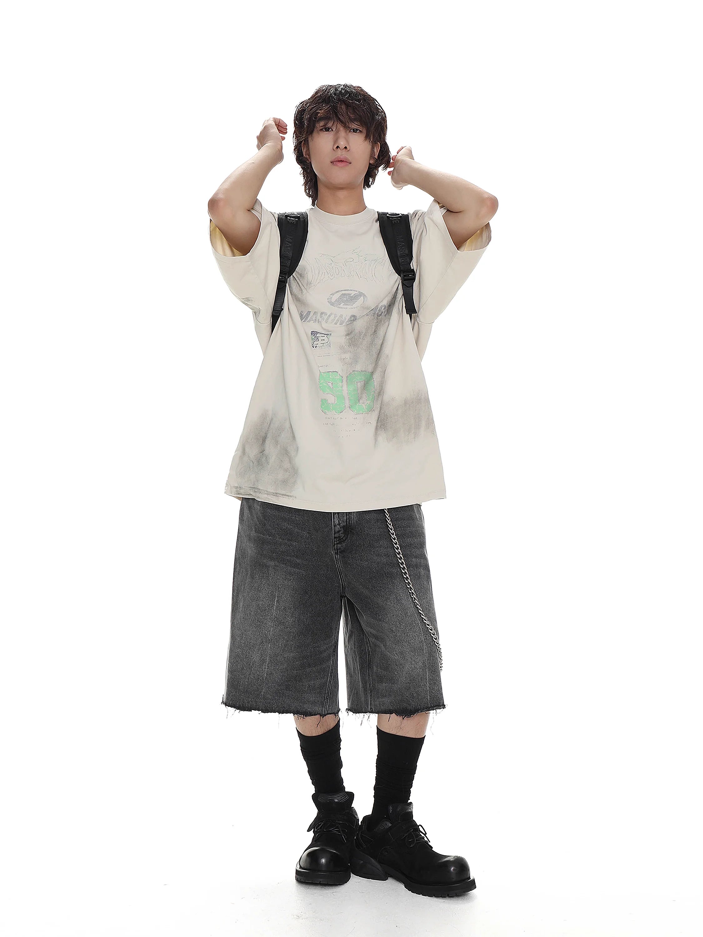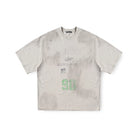 This men's short-sleeve t-shirt features a relaxed, boxy silhouette with a vintage-inspired distressed aesthetic. The light grey cotton fabric is treated with a washed and faded finish, creating a unique tie-dye effect. Bold layered graphics, including a large '90' in faded green, stylized typography, and abstract design elements, add to its retro sportswear vibe. Soft and worn-in for all-day comfort, this tee delivers authentic early '90s streetwear style.