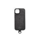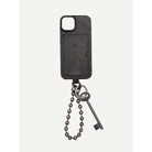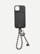 This rugged black phone case features a vintage-inspired leather-textured finish and a built-in card holder slot for added convenience. A metal keychain with a silver ring, ball chain loop, and antique-style key is attached at the base, providing both style and functionality. The case combines industrial aesthetics with practical design, making it suitable for a unisex audience. Photographed against a clean, white background, the accessory is modern and visually distinctive.