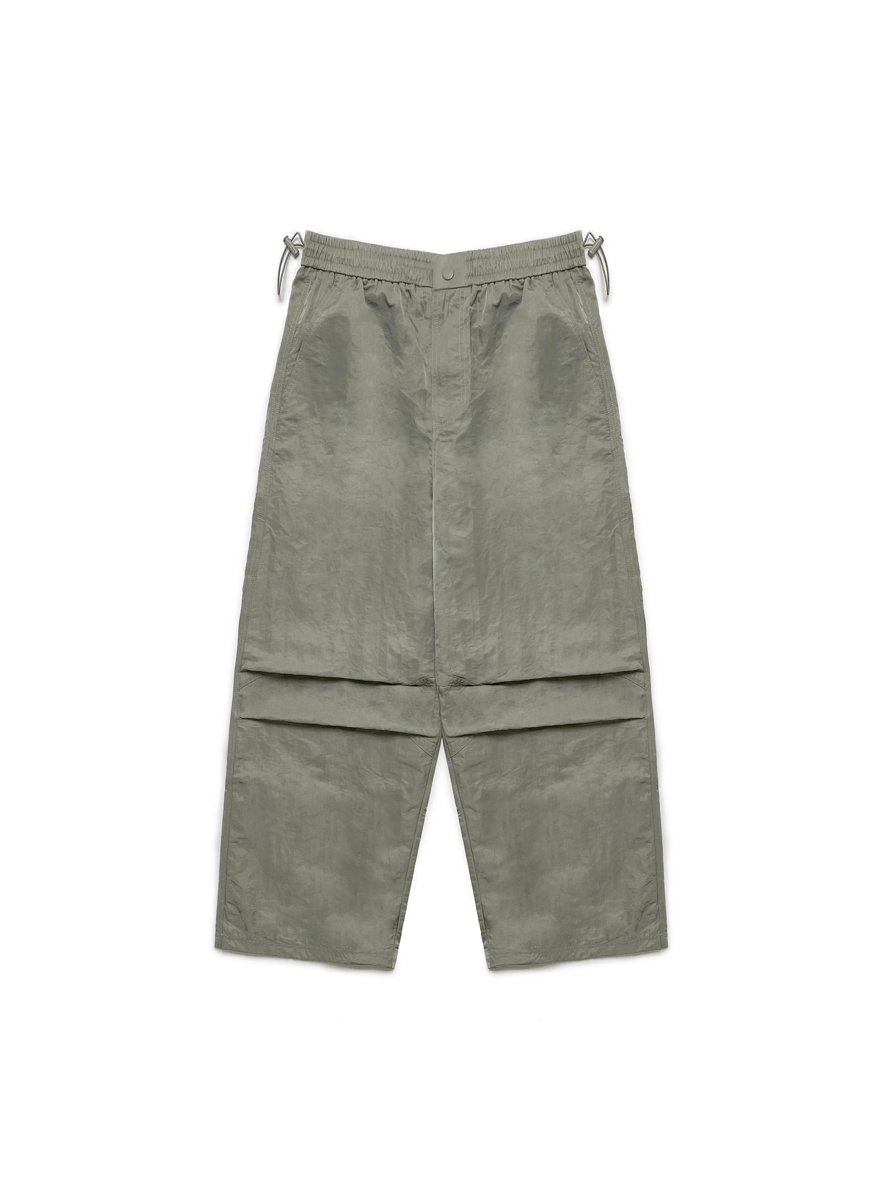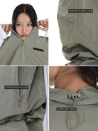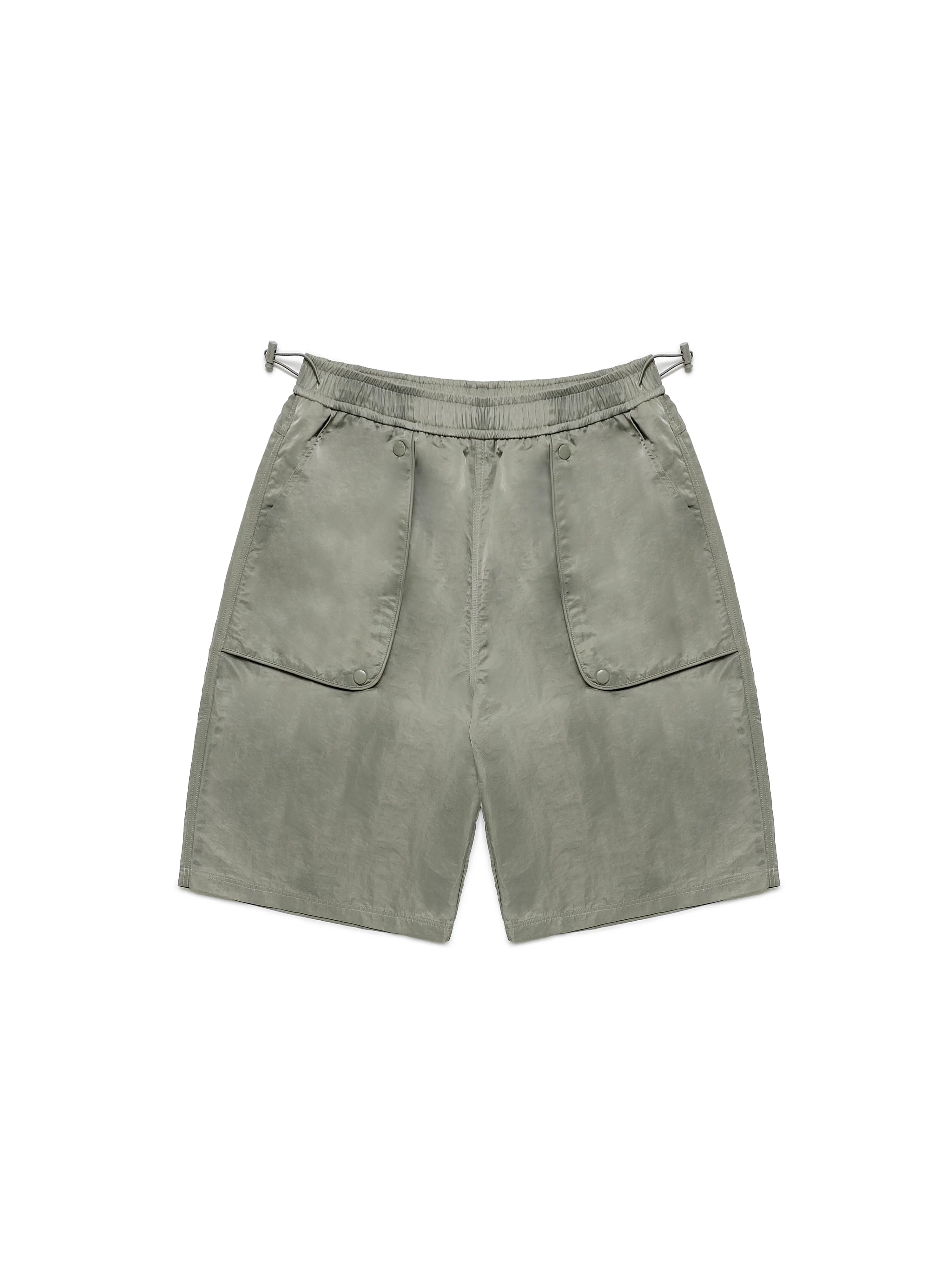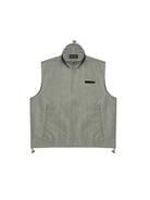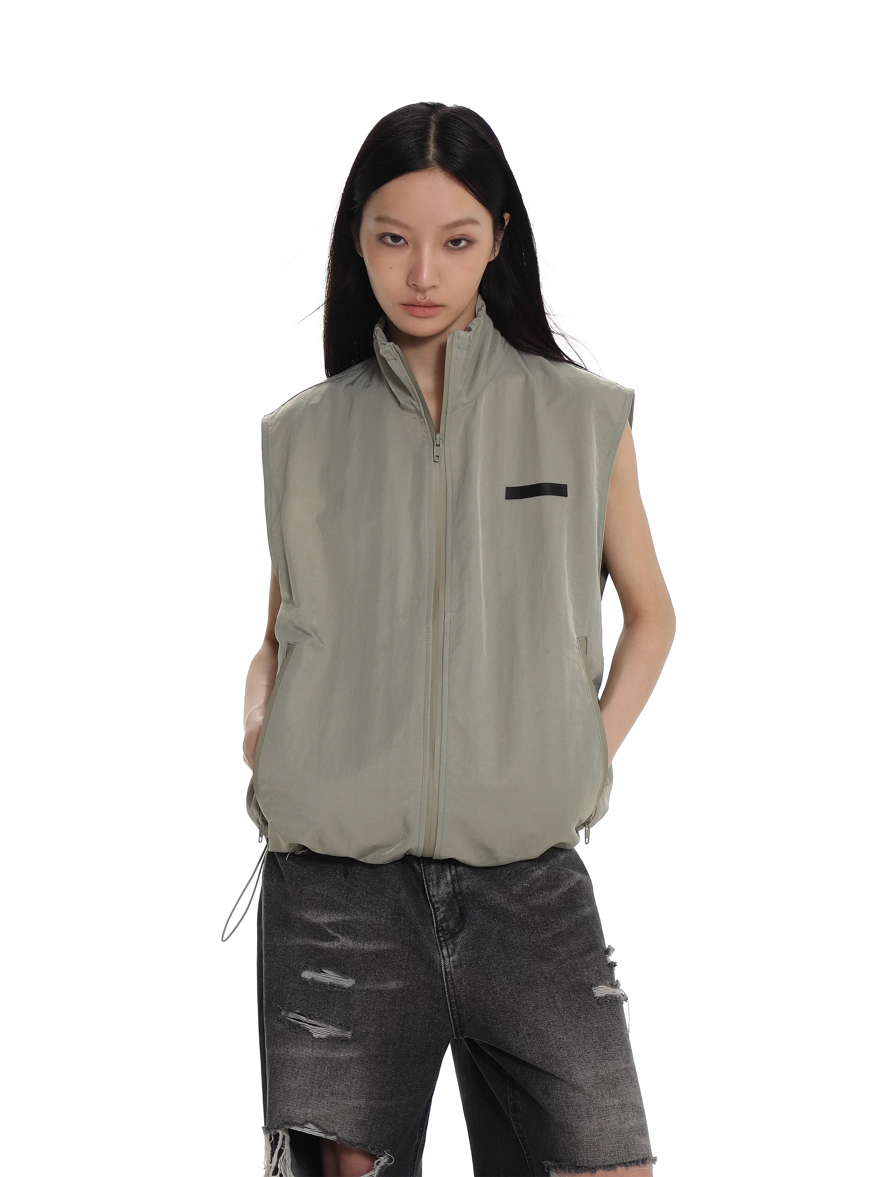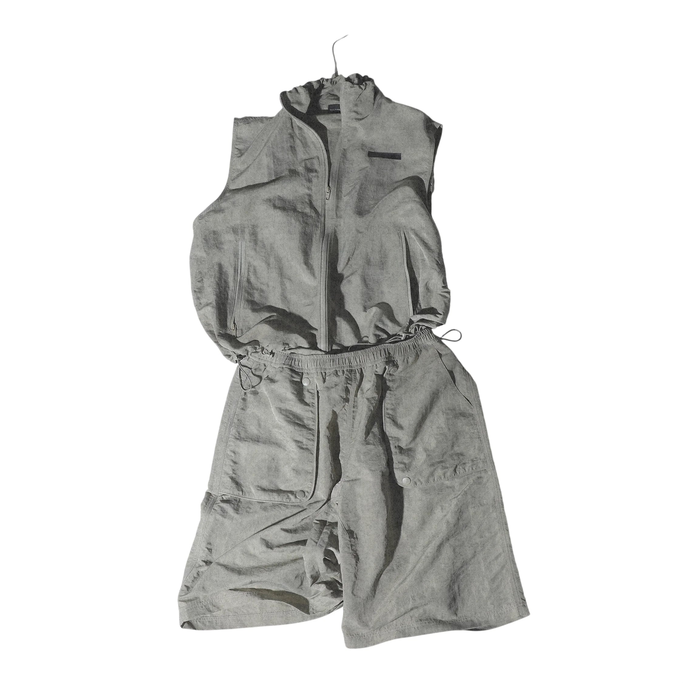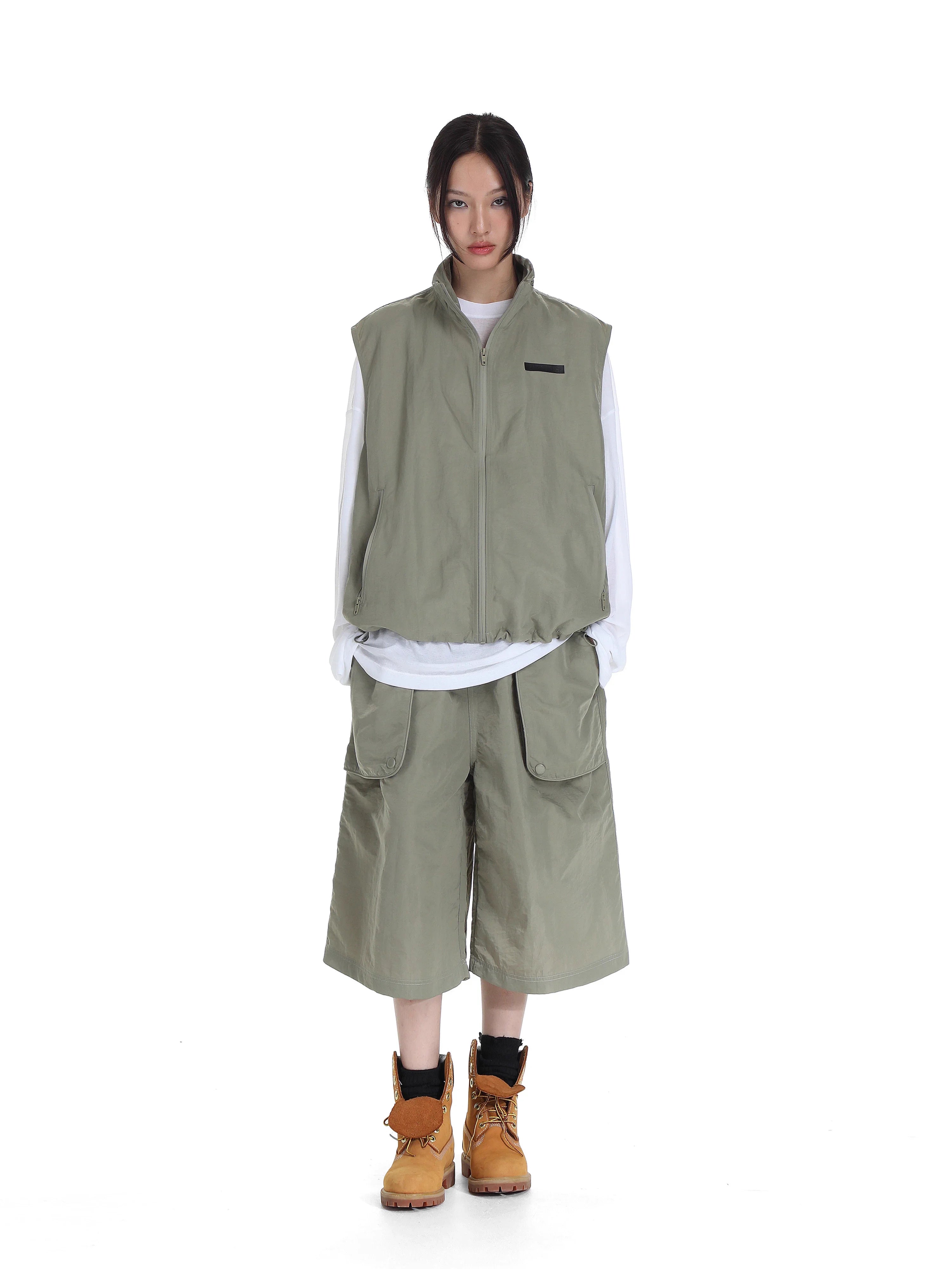 This outdoor-ready set features a sleeveless zip-up vest and matching cargo shorts made from lightweight, waterproof nylon with a subtly crinkled finish. The vest includes a high drawstring collar, center zipper closure, and zippered side pockets for secure storage. The knee-length shorts are designed with an elastic drawstring waistband, side pockets, and flap cargo pockets with snap closures for added utility. Ideal for warm-weather activities, this unisex set offers a functional and modern athleisure style.