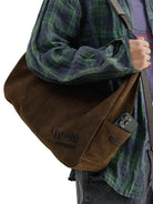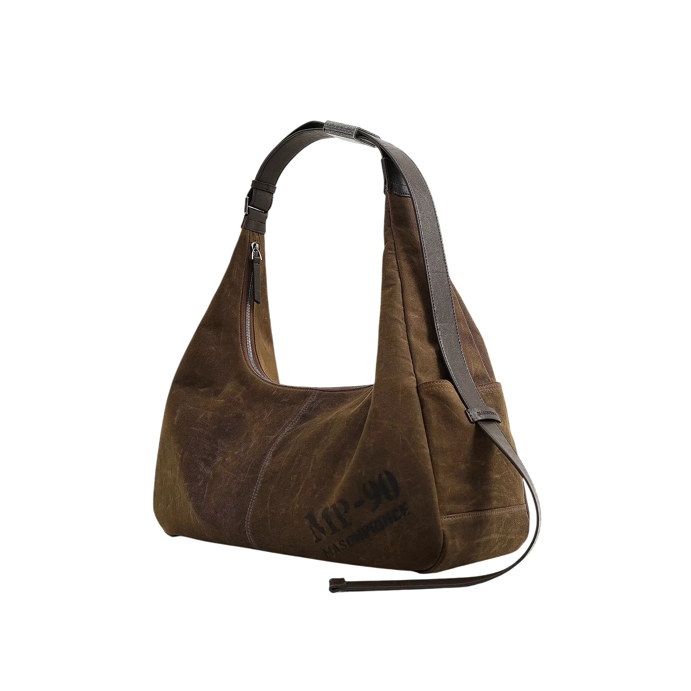 Unisex crossbody bag crafted from rugged waxed canvas with a distressed brown finish. This slouchy, asymmetrical silhouette offers a casual yet structured look, ideal for everyday use or weekend outings.