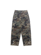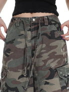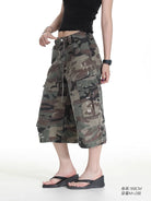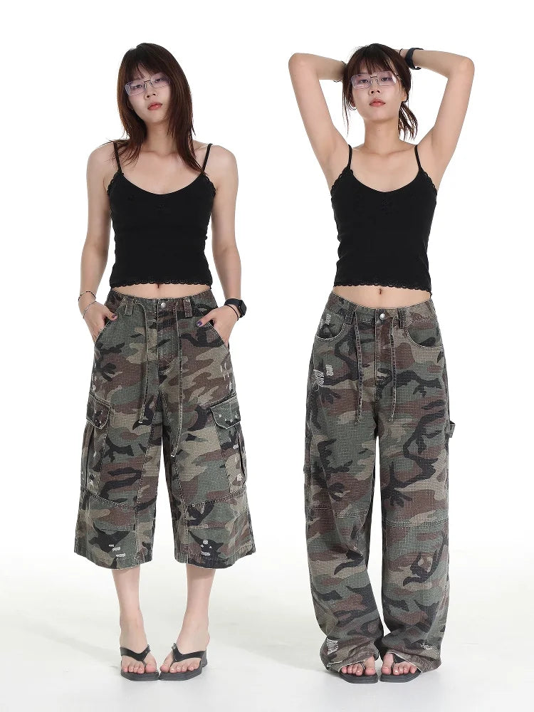 These women's camouflage cargo pants blend rugged outdoor style with everyday wearability. Designed in a classic green and brown woodland camo pattern, they feature a relaxed, straight-leg silhouette with a drawstring waistband for adjustable comfort. Available in two versatile styles—cropped mid-calf length and full-length floor-sweeping cut—both variations are crafted from durable fabric and include multiple utility pockets for functionality. Subtle distressed details add a touch of street-ready character, making these pants ideal for casual and workwear looks alike.