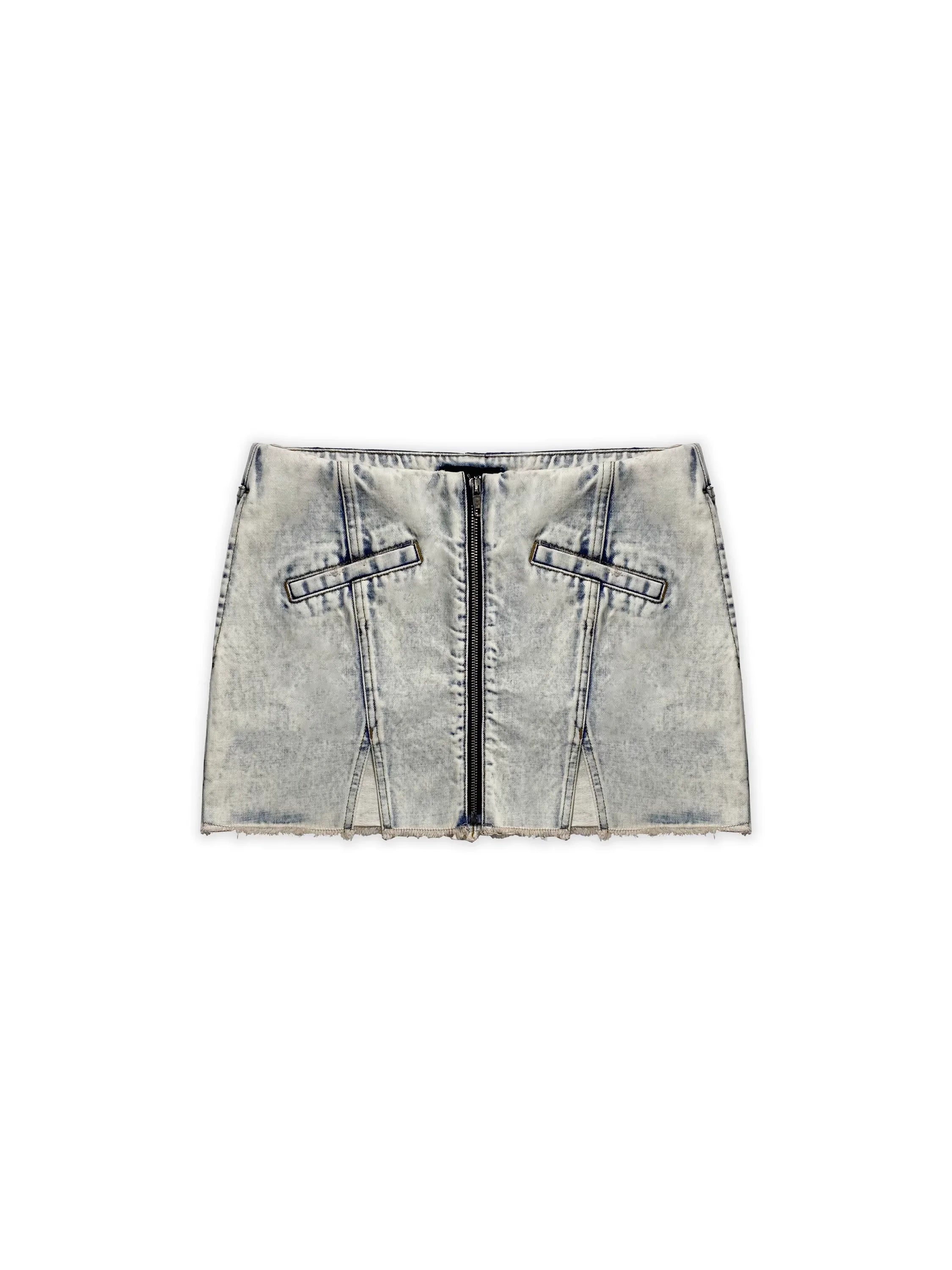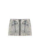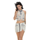 Make a bold fashion statement with this stylish two-piece denim set for women. Featuring a light snow-wash finish, the sleeveless halter crop top is designed with a high neckline, frayed edges, faux pocket details, and exposed seams for a structured fit. The matching high-waisted mini skirt includes a front zipper, faux slit pockets, and raw hems with subtle front slits on both legs, adding an edgy touch to the ensemble. Perfect for warm-weather outings, this set combines modern streetwear flair with casual summer comfort.