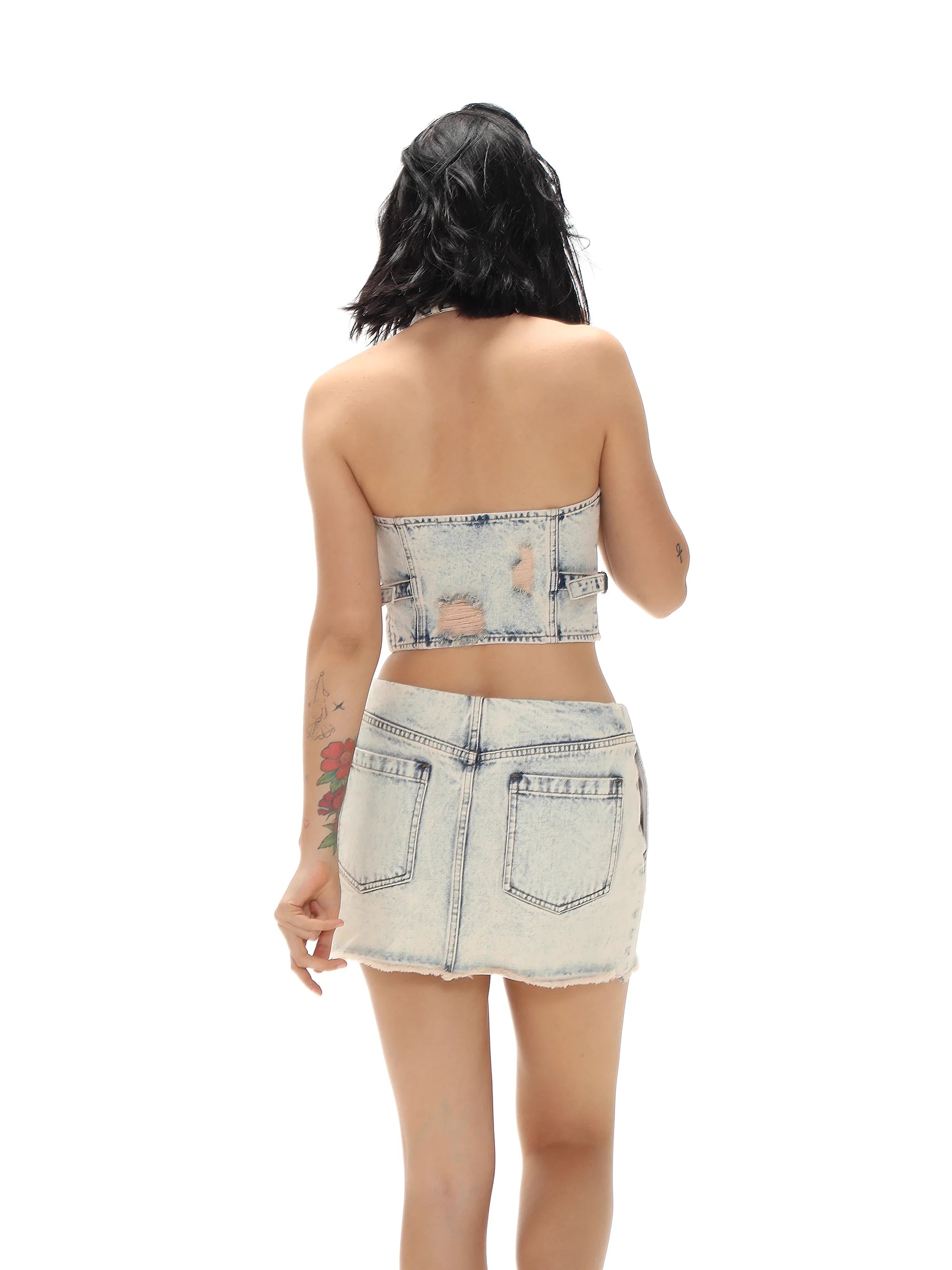 MASONPRINCE Women's Distressed Denim Halter Top and Mini Skirt Set