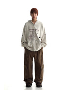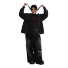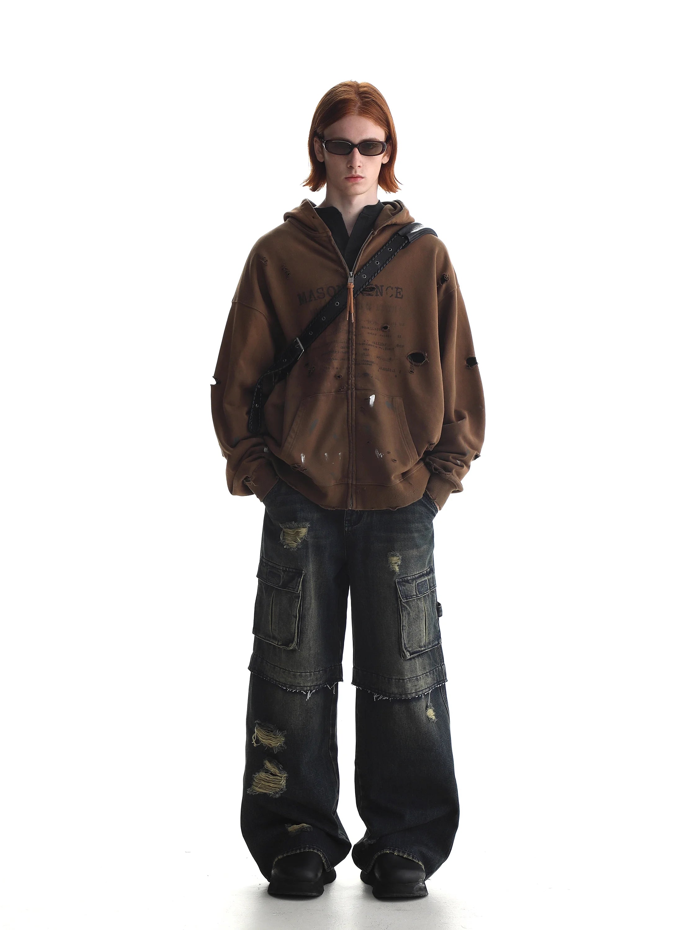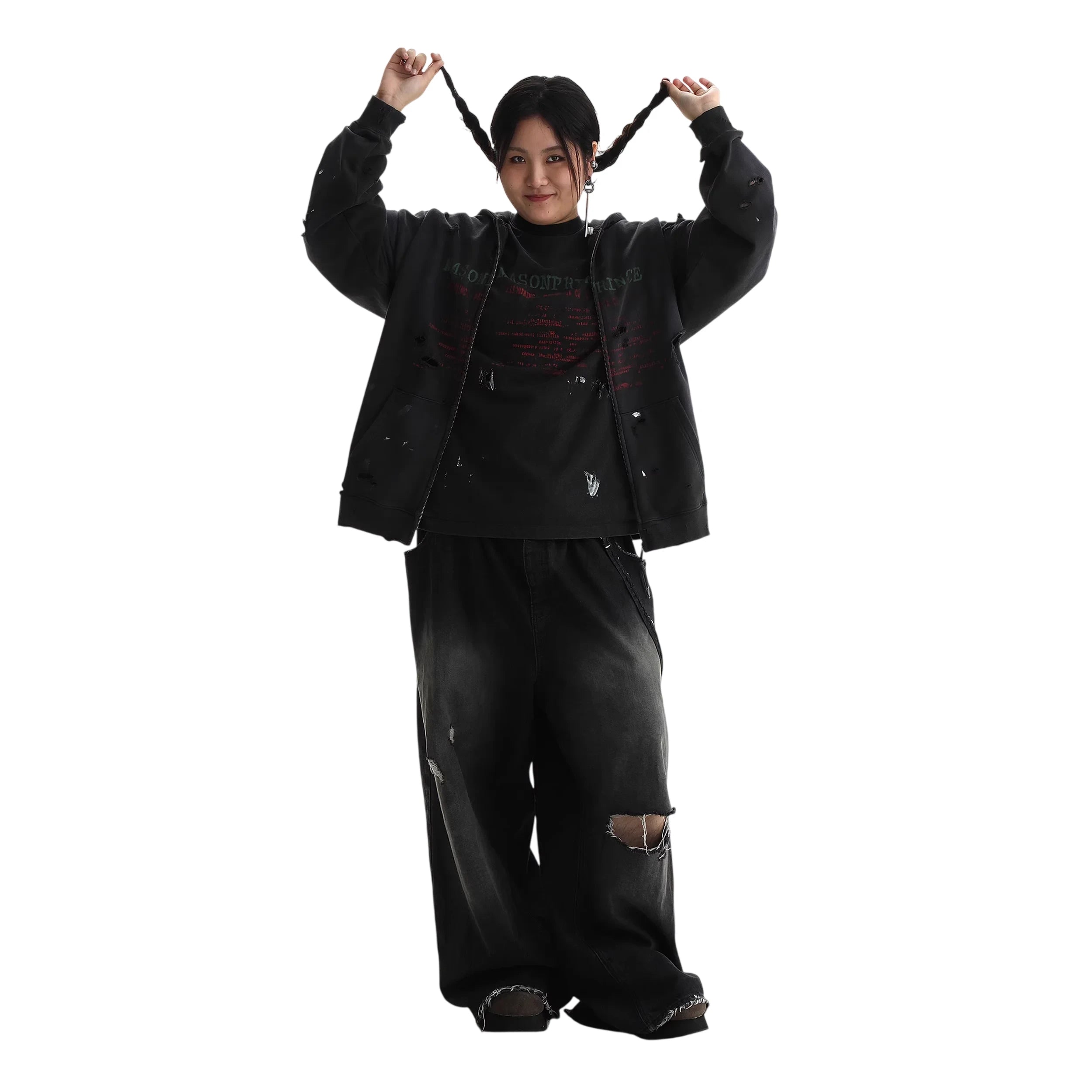 Embrace a bold streetwear vibe with this women's distressed zip-up hoodie jacket, perfect for early autumn layering. Crafted in a loose, oversized fit, this black hoodie features edgy distressing details, including holes and a faded red and green graphic on the front for a grunge-inspired look. Paired effortlessly with similarly styled pieces, this jacket adds an urban, rock-inspired edge to your wardrobe.