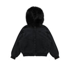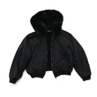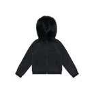 Stay warm and stylish in this women's knit fleece bomber jacket, designed with both comfort and fashion in mind. Featuring a plush faux fur collar and hood lining, this jacket offers superior insulation ideal for cold-weather wear. The design includes ribbed cuffs and hem for a snug fit, two convenient front pockets, and a full-front zipper closure. With its sleek all-black appearance and subtle chest branding, this timeless classic adds effortless chic to any winter wardrobe.