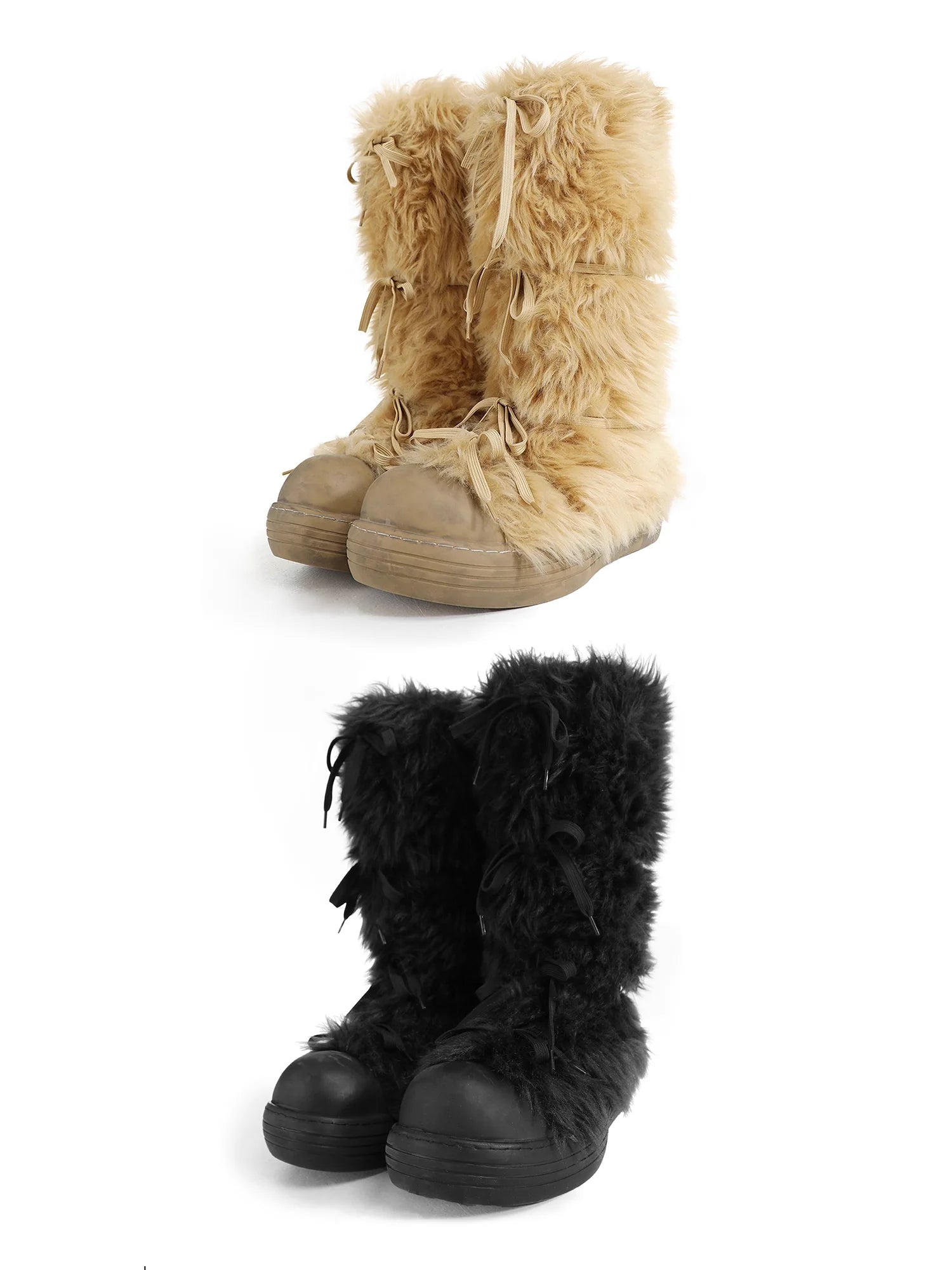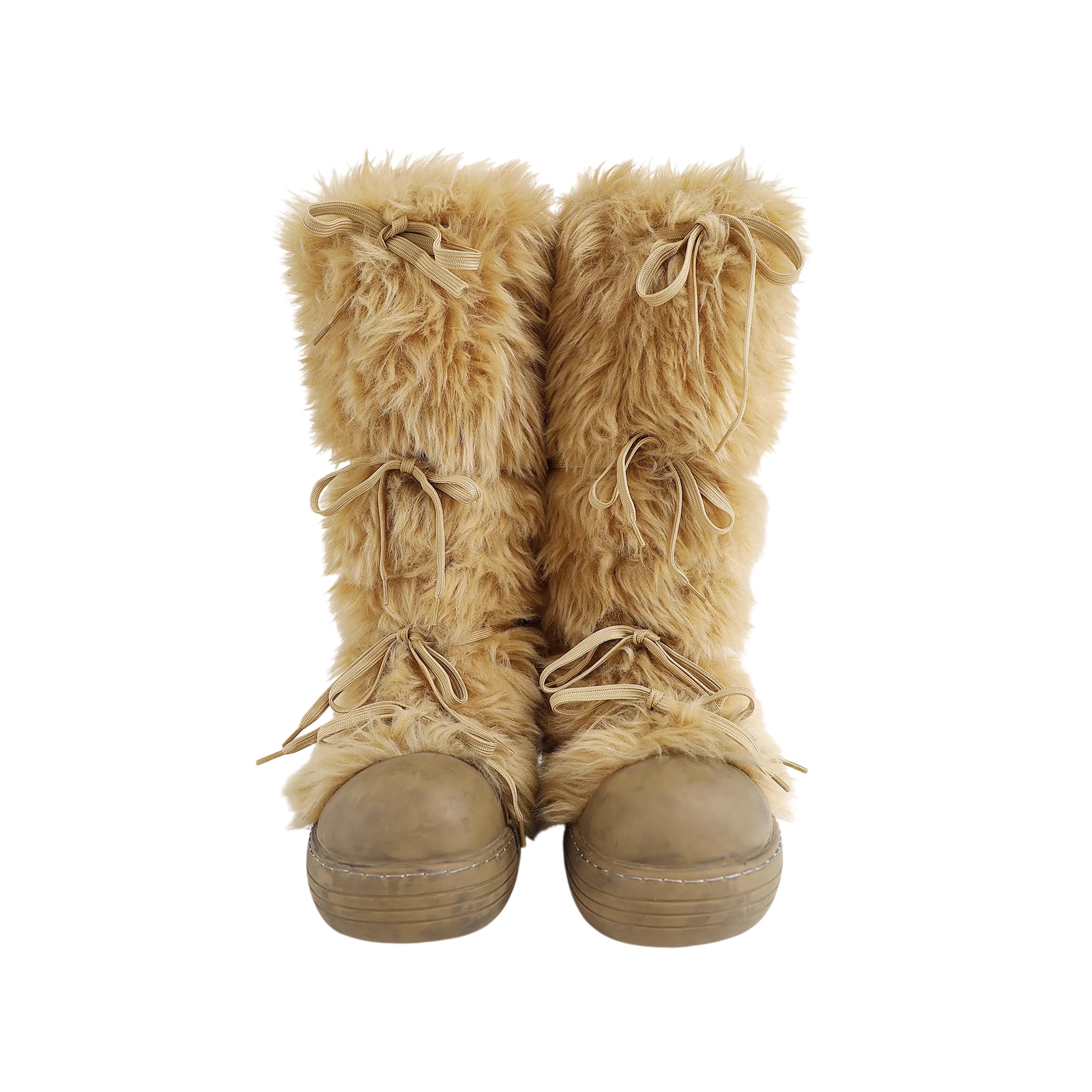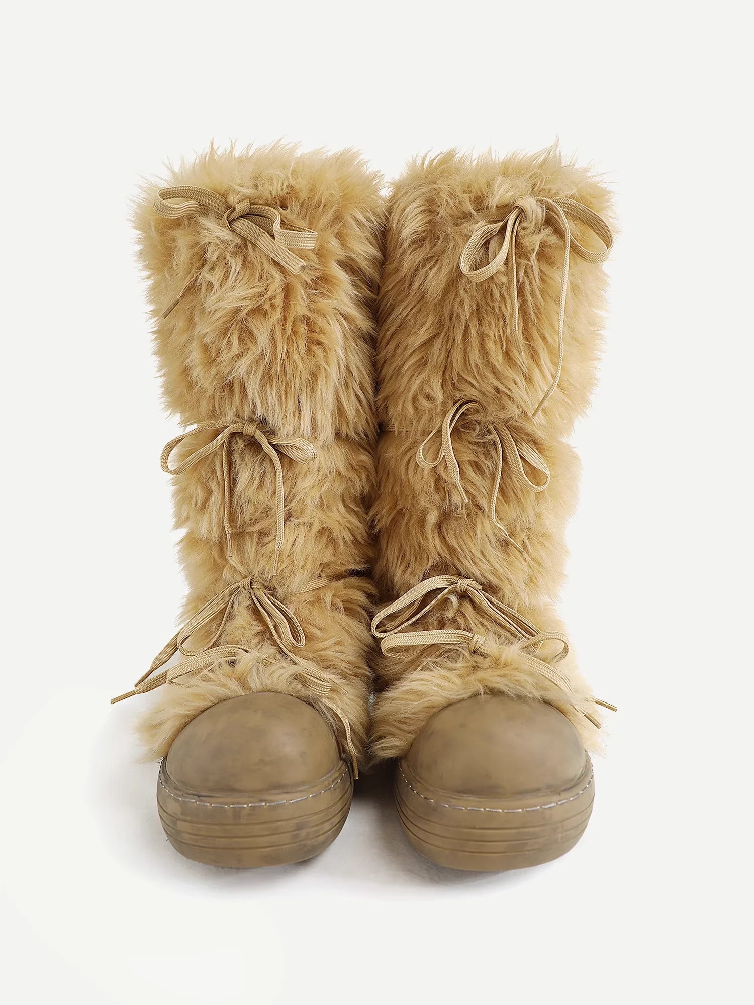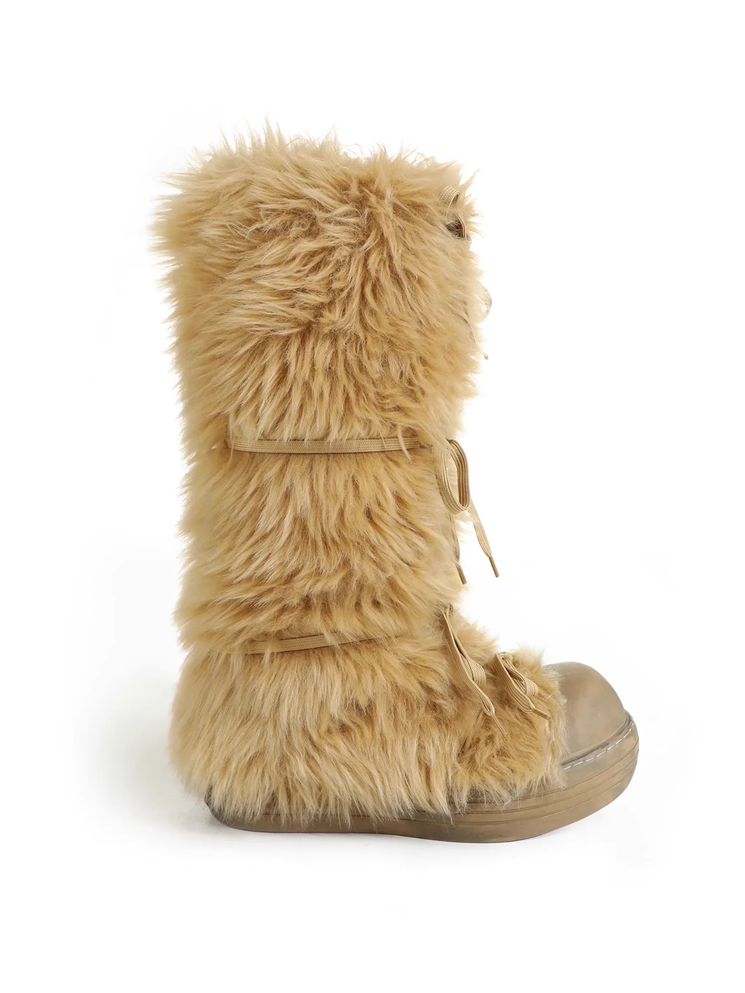 Step into warmth and style with these women's extra-long snow boots, designed for both comfort and fashion. Featuring a soft, tan faux fur exterior that extends up the shaft, these boots offer a bold and cozy winter statement. The front lace-up closure adds an adjustable fit and a touch of rugged charm, while the durable brown soles provide strong grip and protection from the elements. Ideal for cold weather, these plush boots are perfect for adding flair to your winter wardrobe.