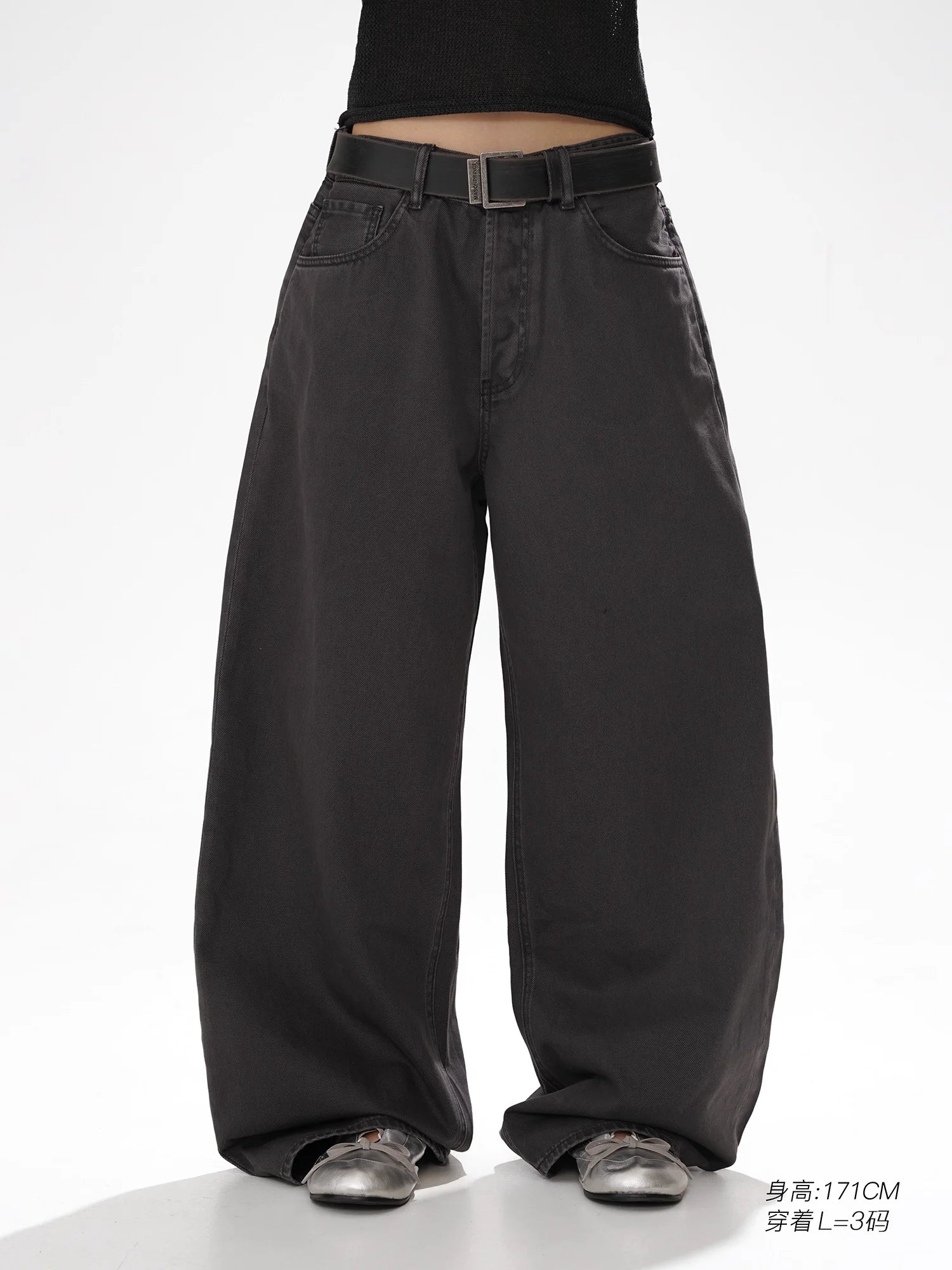 These women's grey straight-leg jeans offer a relaxed, wide-leg silhouette with a modern, eco-washed finish. Designed with a high-rise waist for a flattering fit, they feature classic five-pocket styling and a comfortable, baggy cut that drapes effortlessly over footwear. The look is completed with a coordinating black belt featuring a rectangular metal buckle, ideal for casual and streetwear-inspired outfits.