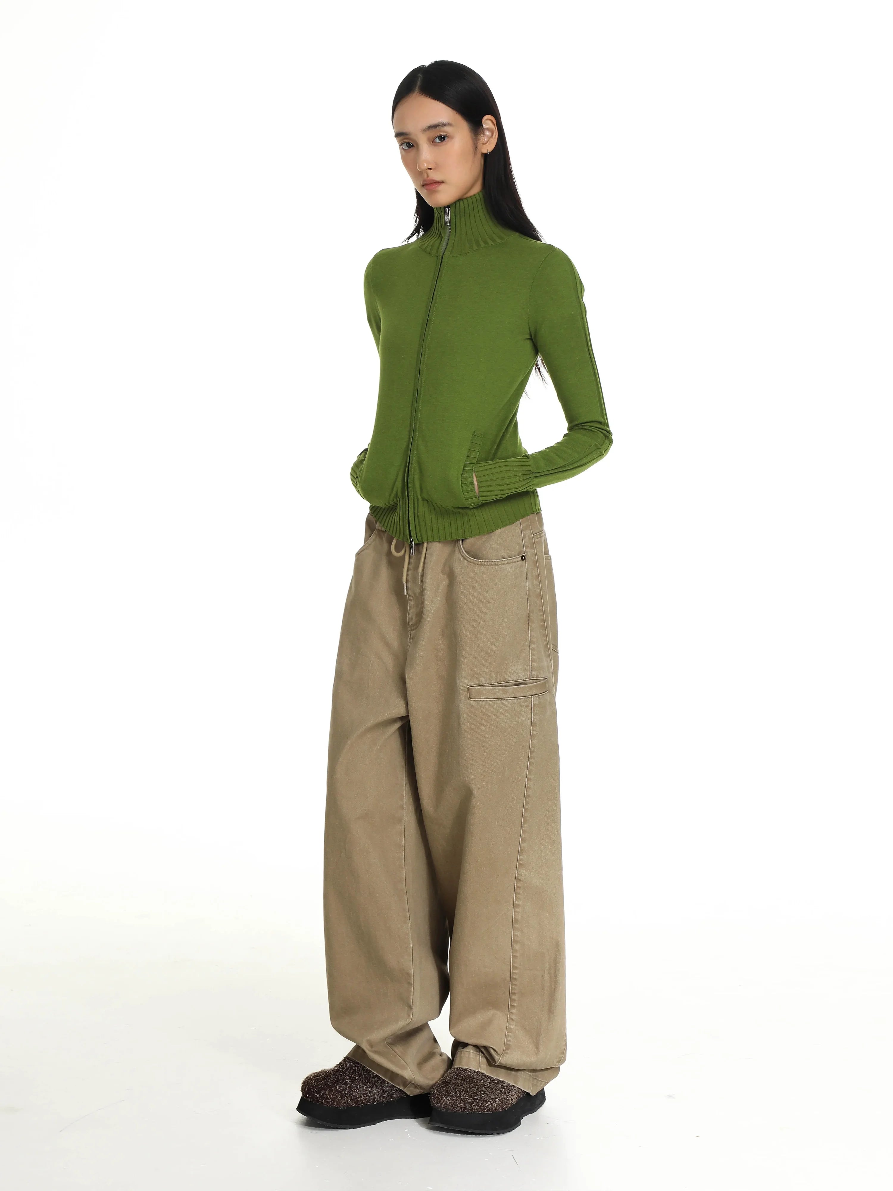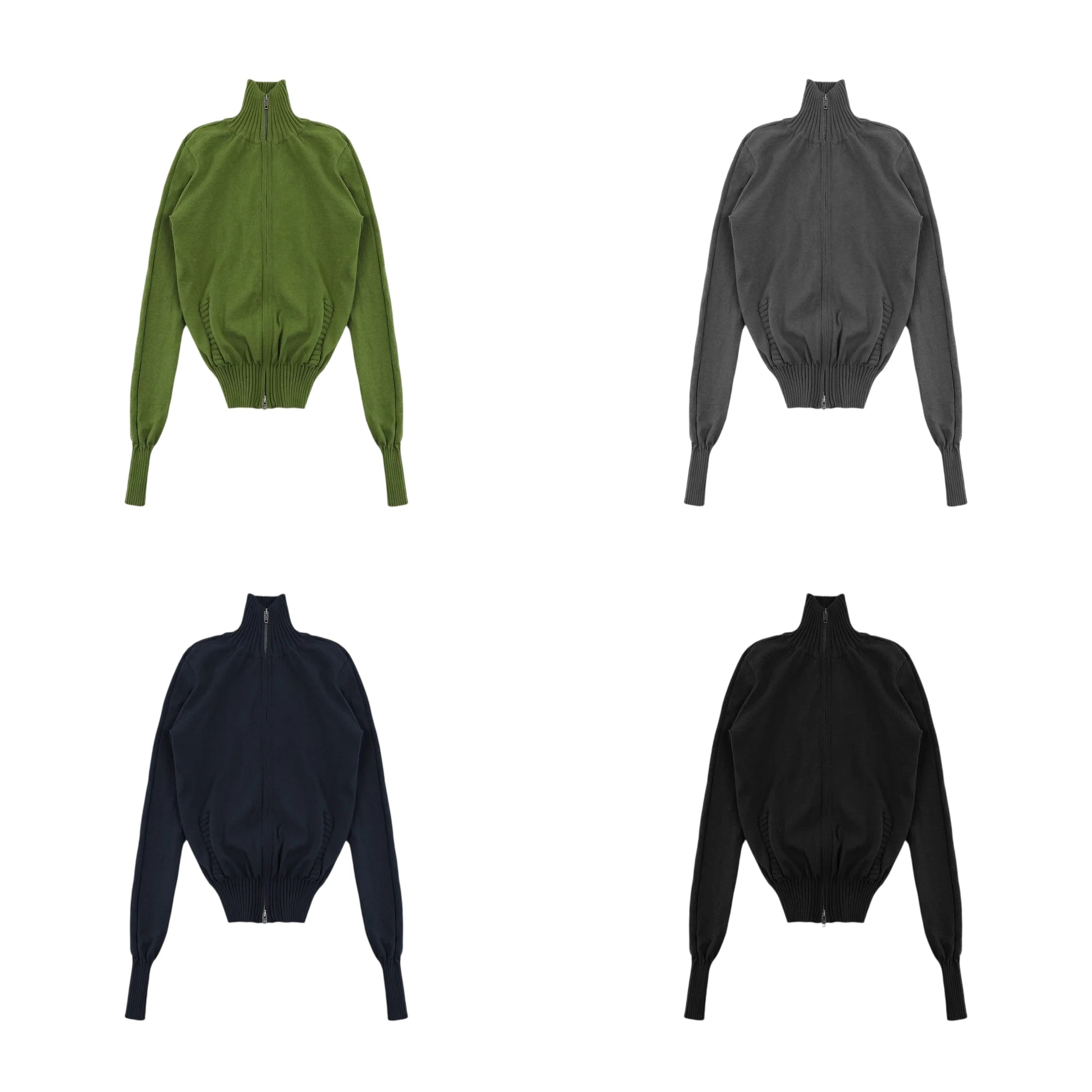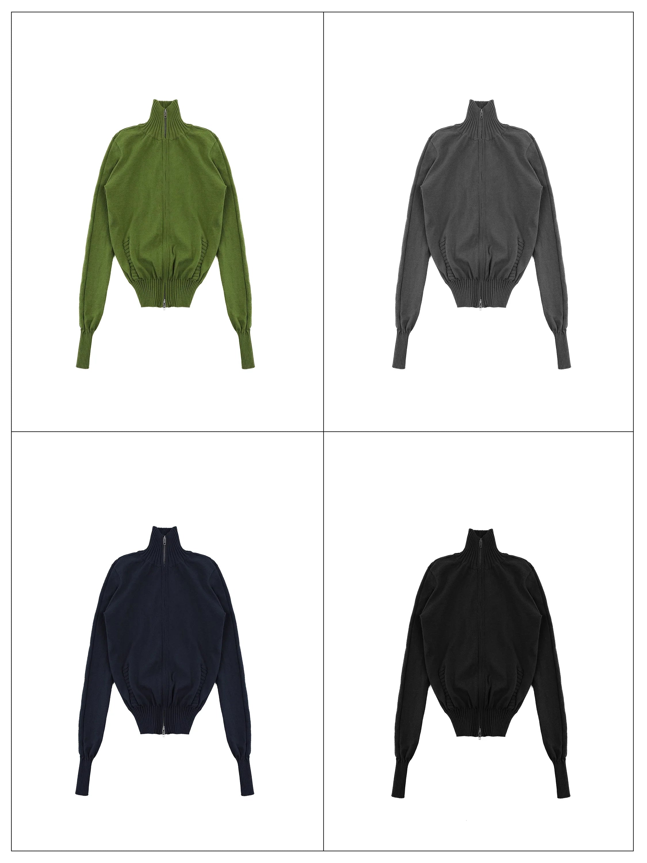 This women's high-neck zip-up cardigan combines everyday comfort with a flattering tailored silhouette. Designed with a soft cotton-feel fabric, the cardigan features a full-length front zipper, ribbed hem and cuffs, and a neatly knitted texture for a polished look. Available in green, gray, navy blue, and black, it's ideal for layering and versatile styling.