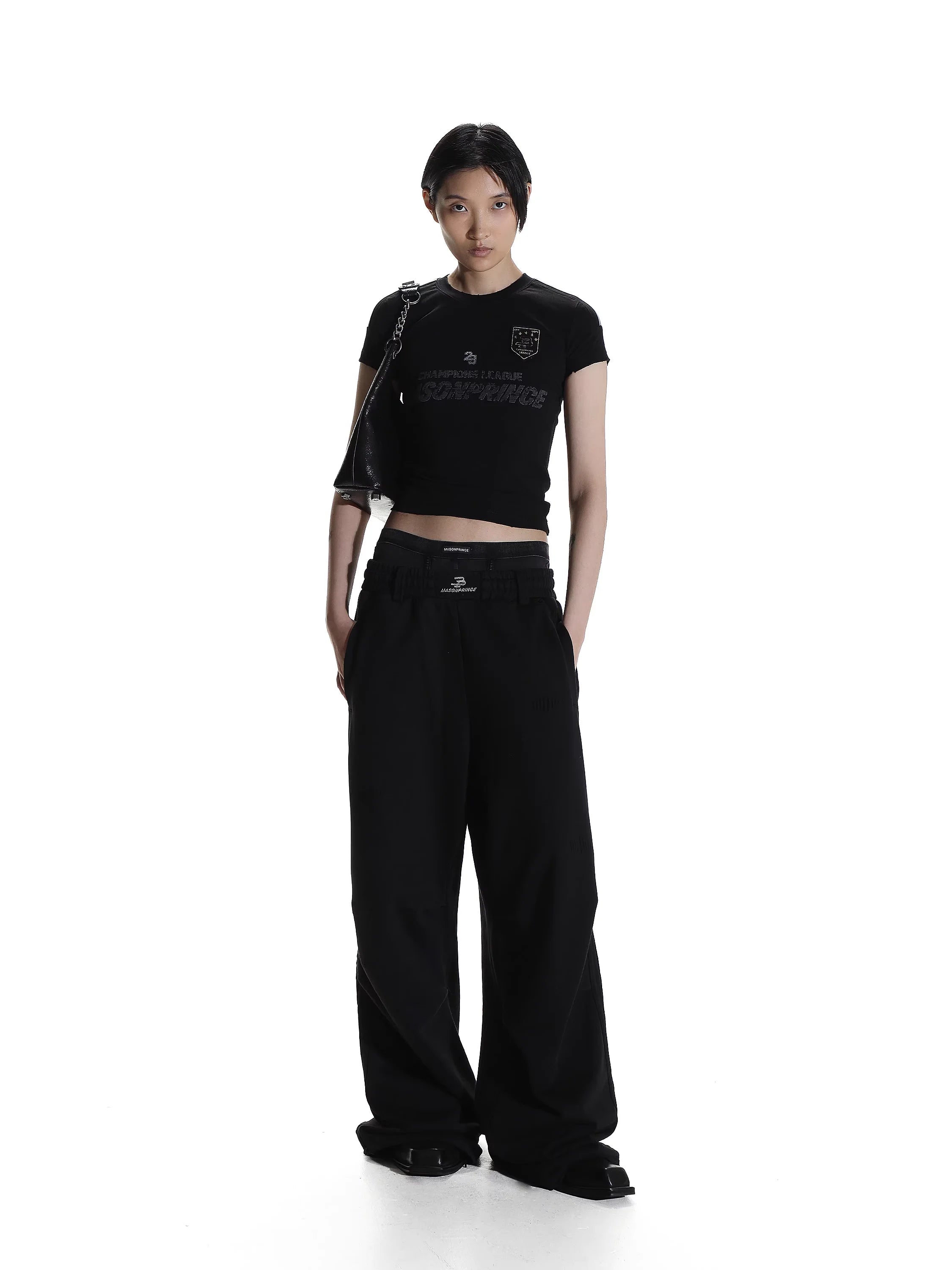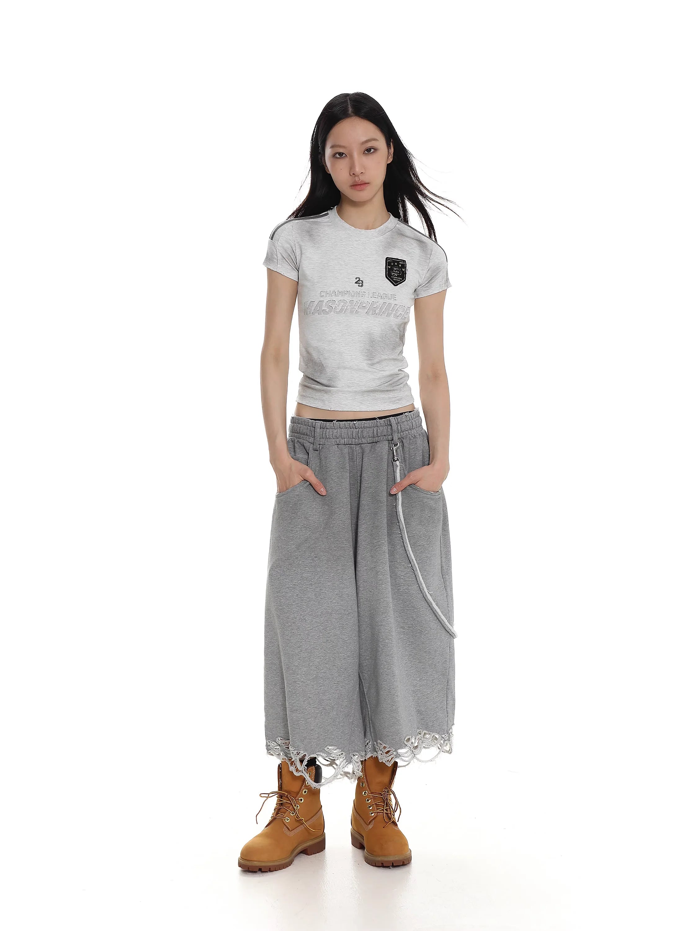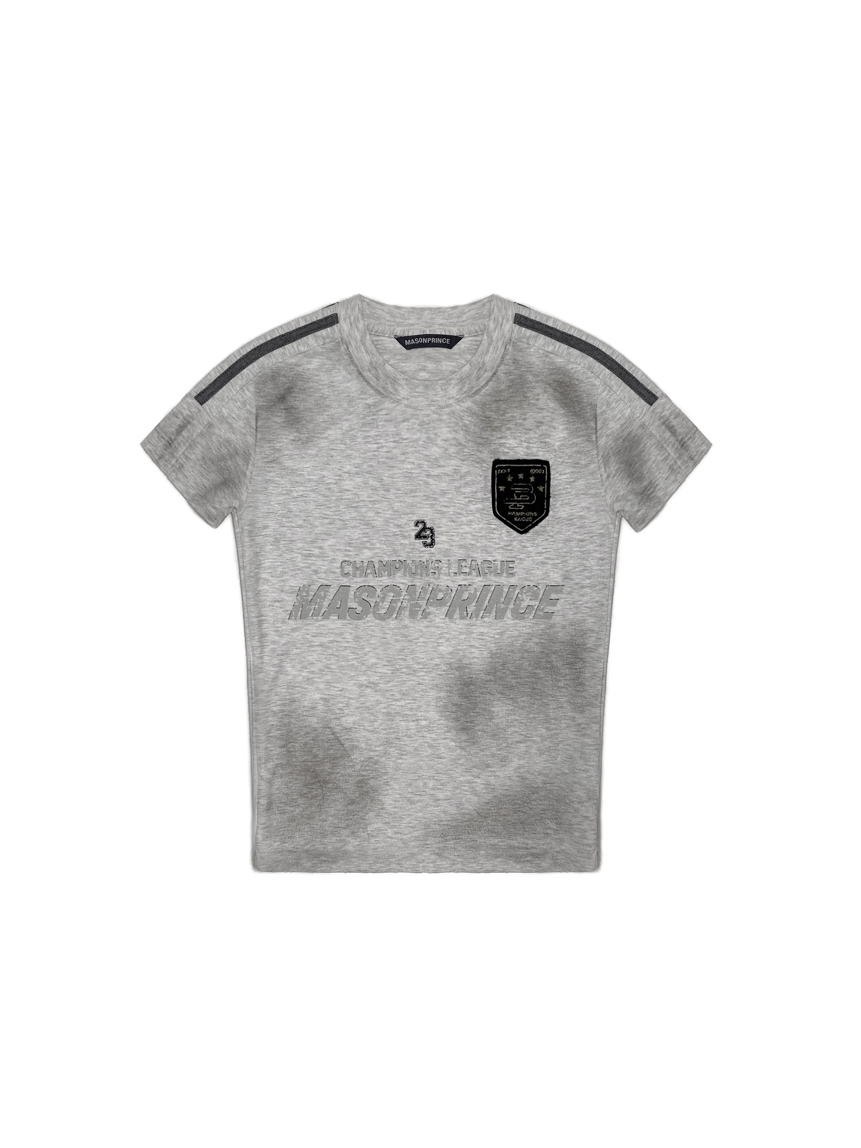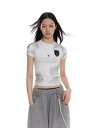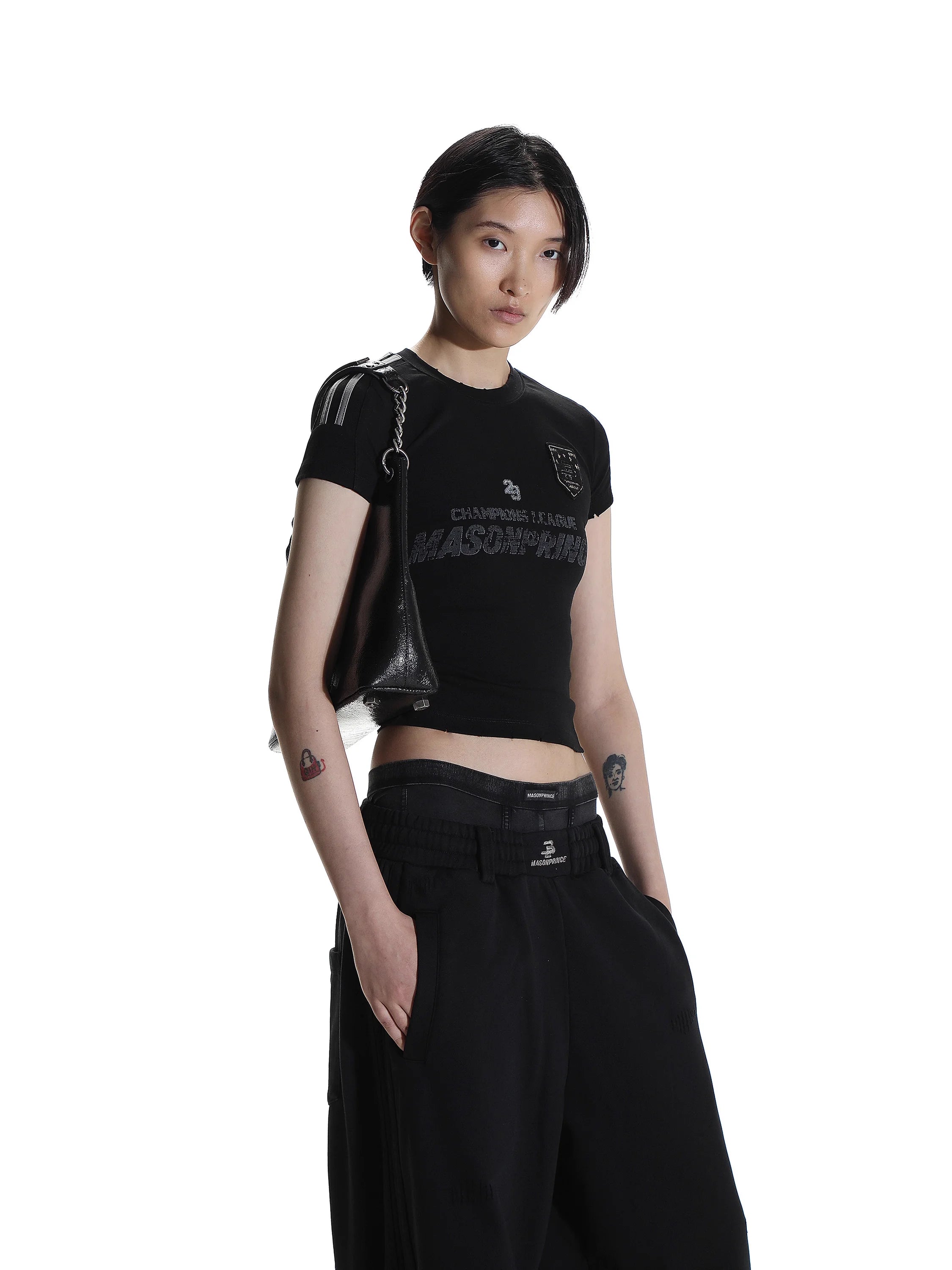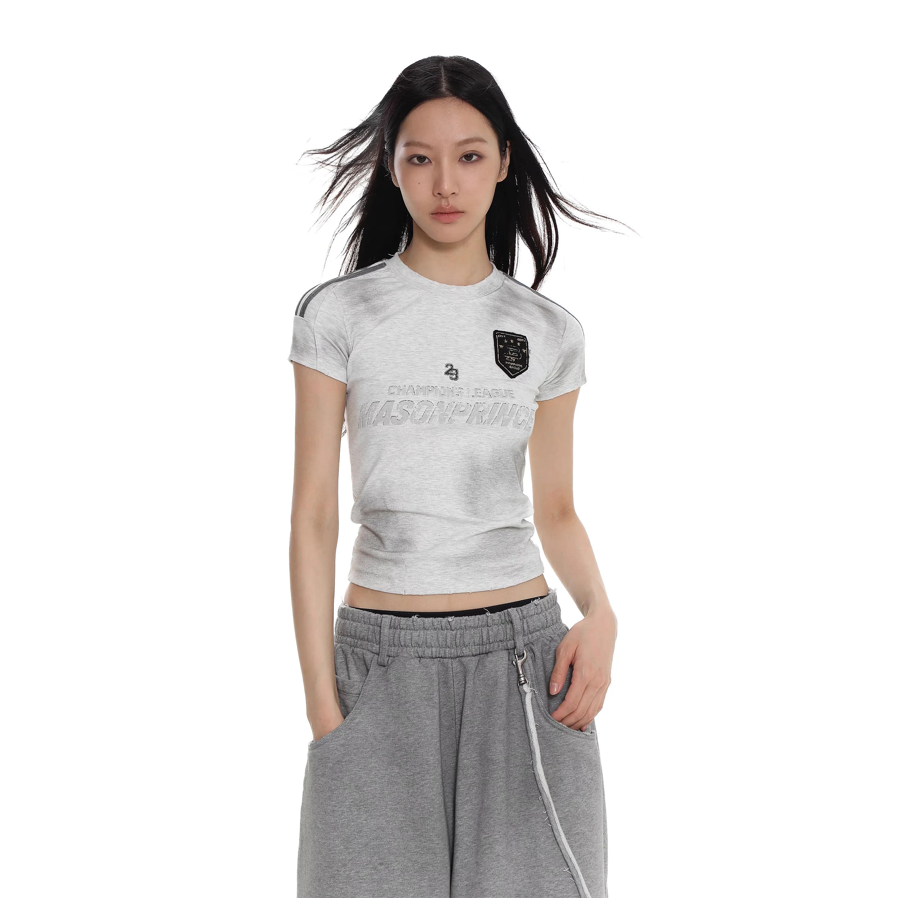 Stay cool and stylish with this women's slim fit sporty crop t-shirt, ideal for summer wear. Made with a four-way stretch fabric, this short sleeve top features a comfortable crew neck and athletic-inspired dark shoulder stripes. Distressed detailing and printed accents, including a patch referencing "Champions League," give it a trendy, streetwear edge. Perfectly paired with joggers or jeans for a casual yet sporty vibe.