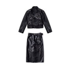 Make a bold style statement with this coordinated women's faux leather biker set. Featuring a cropped jacket and matching high-waisted pencil skirt, this edgy ensemble combines classic motorcycle elements with a modern grunge twist.