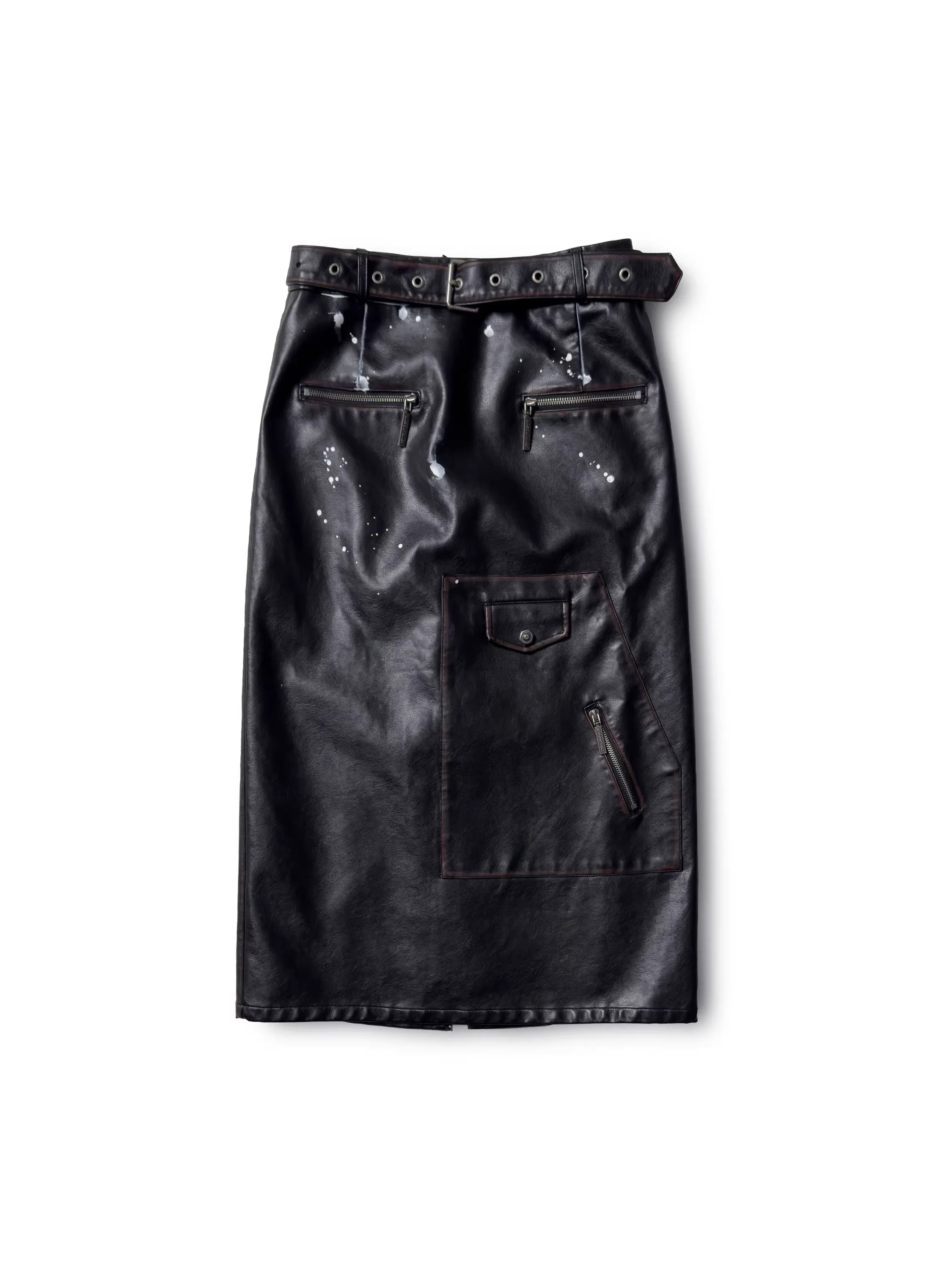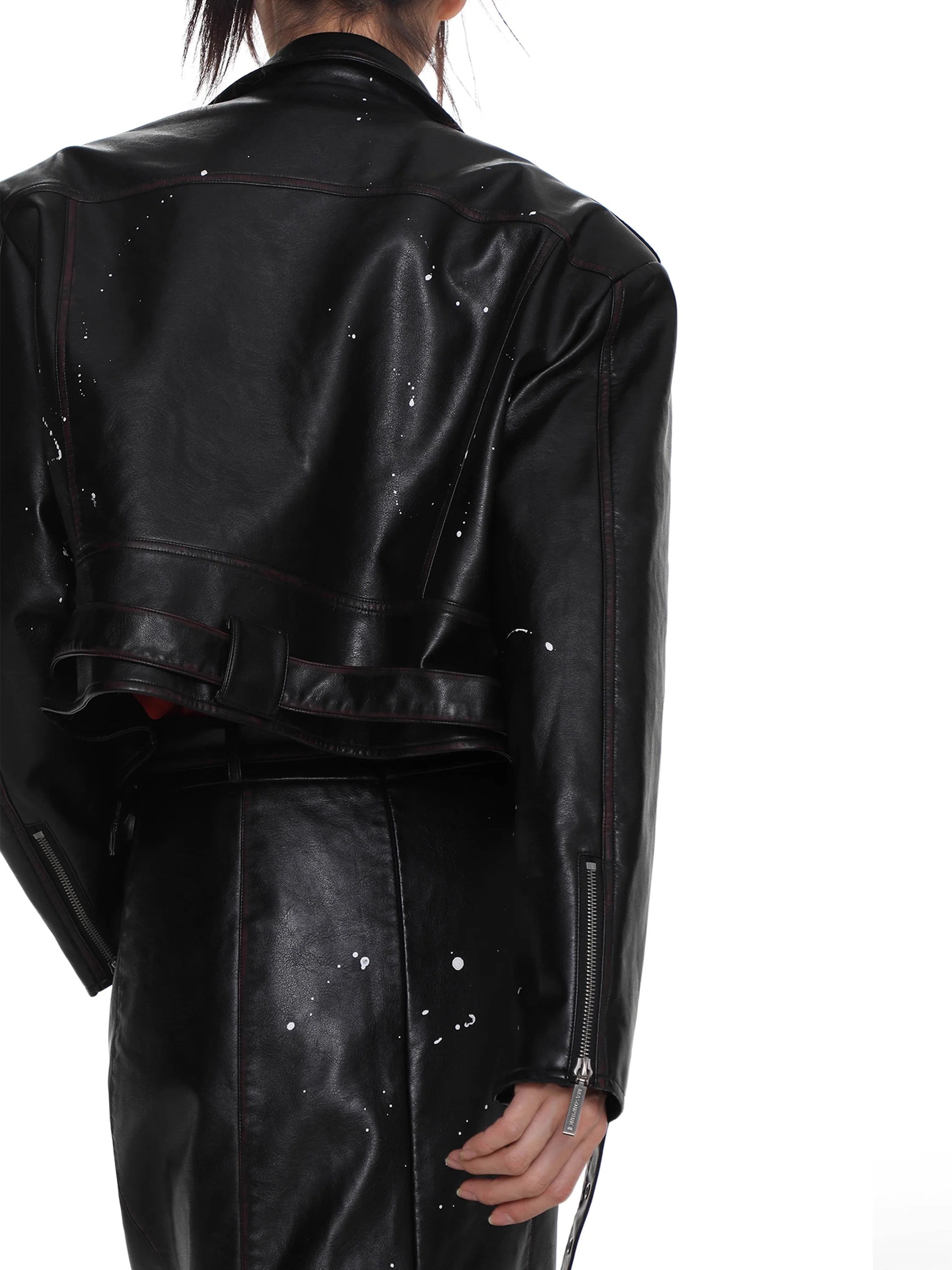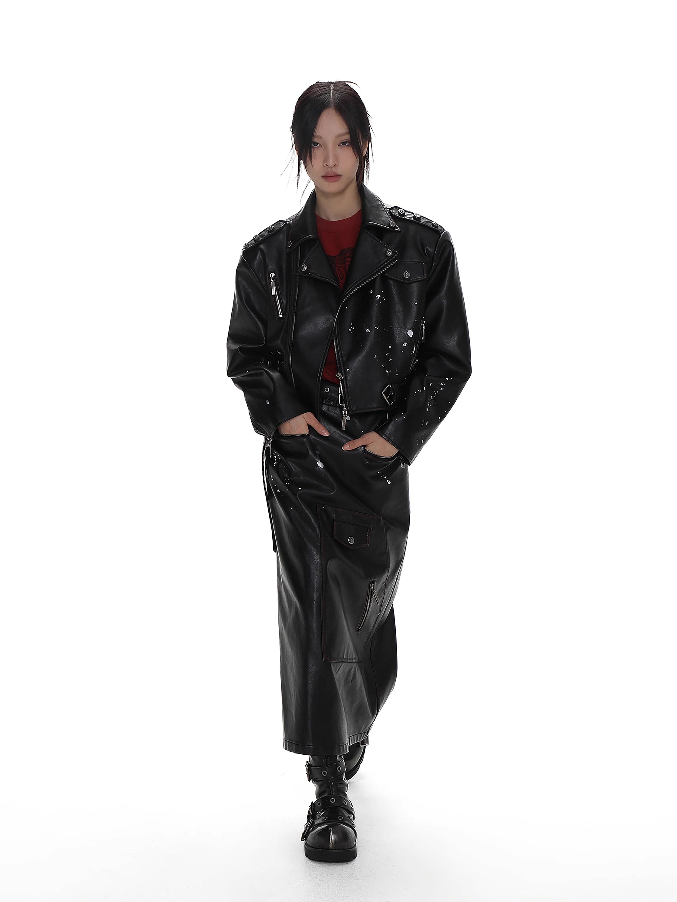 The biker-style jacket is designed with asymmetrical zip closure, metallic snap buttons, belted hem, and multiple zippered pockets. Subtle distressed white splatter effects add a vintage, worn-in look. Paired with a coordinating skirt boasting a belted waist, front zip, and flap compartments, the set delivers an effortlessly cool aesthetic perfect for fashion-forward wardrobes.