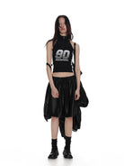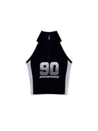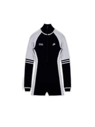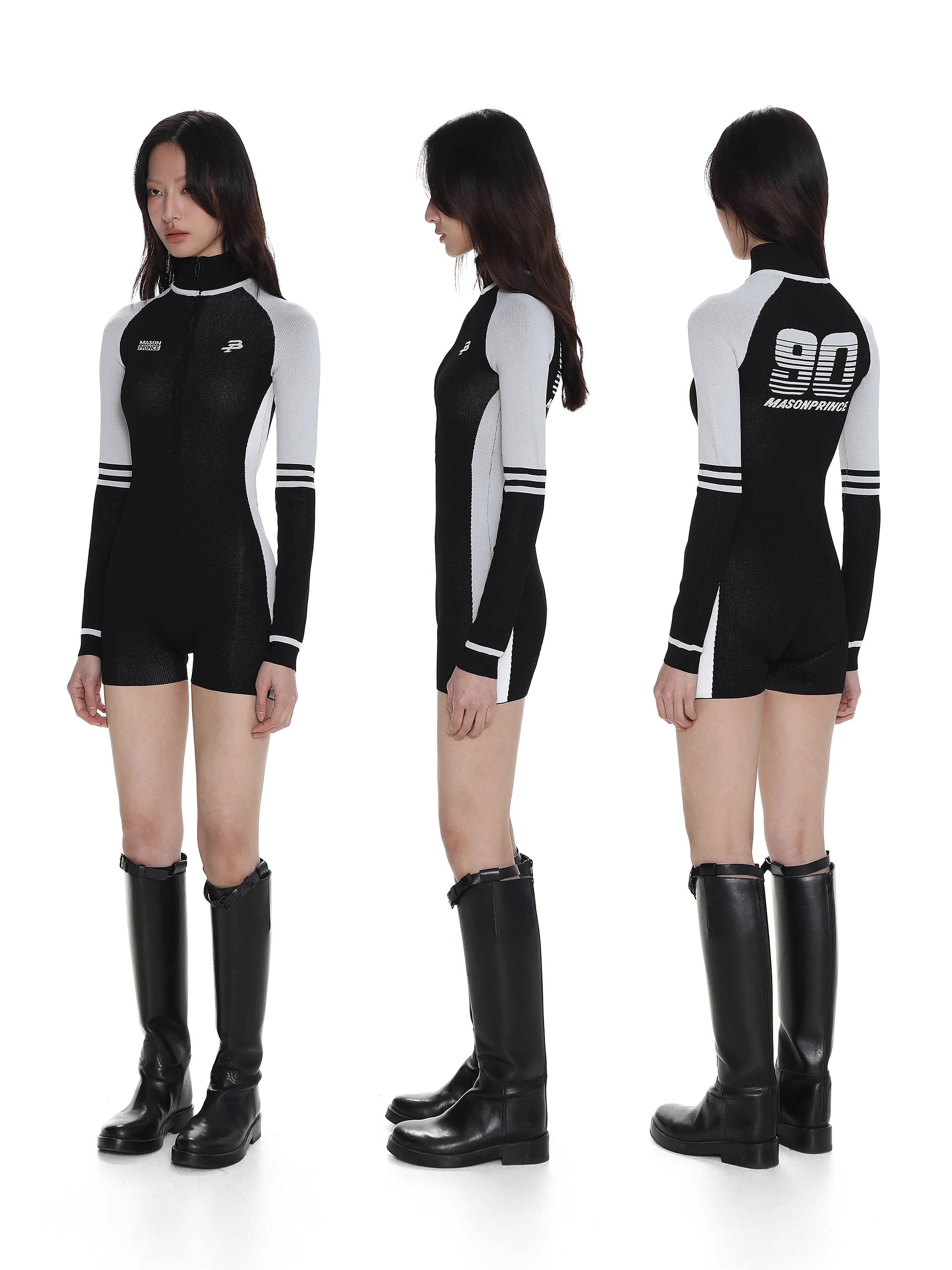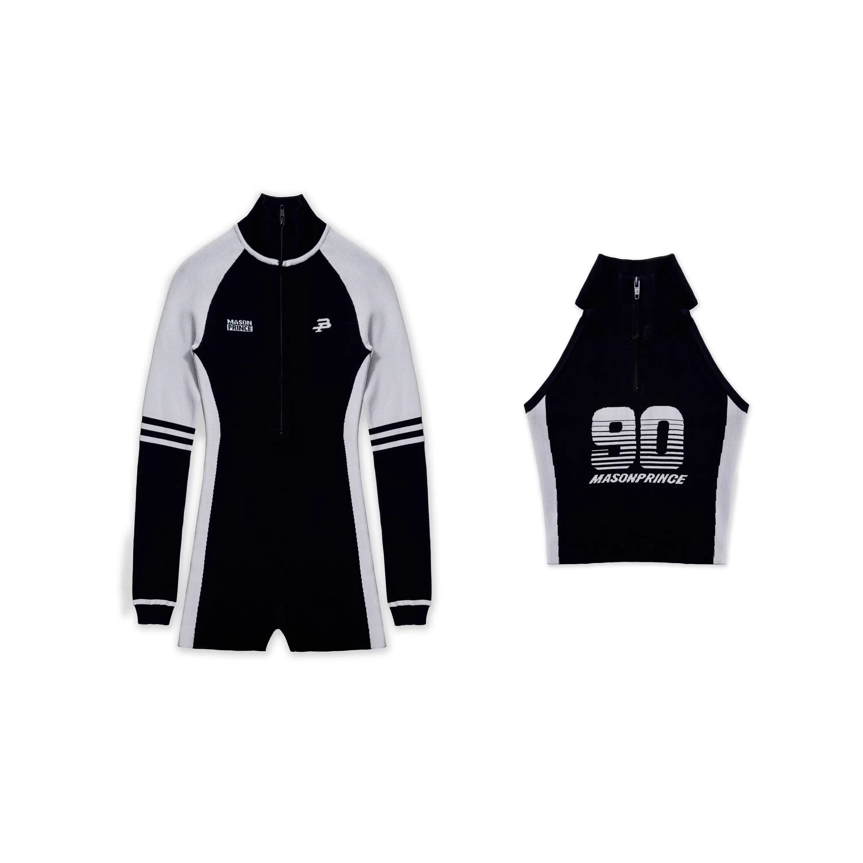 Upgrade your activewear collection with this stylish two-piece set designed for women. The ensemble includes a sleek black long-sleeve romper with contrasting white sleeves and side panels, highlighted by sporty horizontal stripes on the arms and a convenient front zip-up closure. Complementing the romper is a bold sleeveless crop top featuring a high zip collar and striking white accents. Graphic text and numeric details lend a retro-sporty vibe, making this set both functional and fashion-forward for spring cycling or everyday workouts.