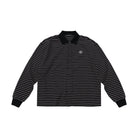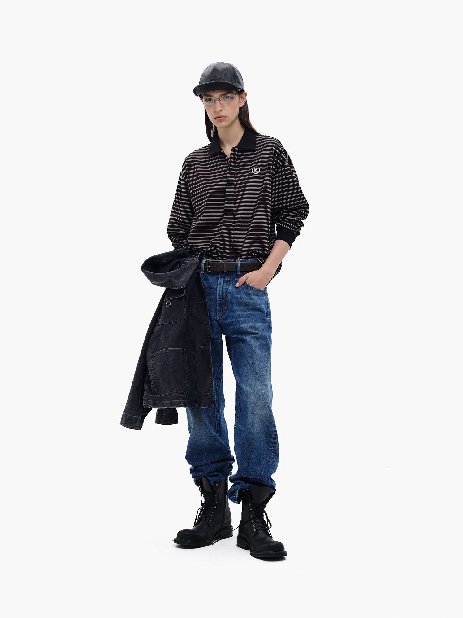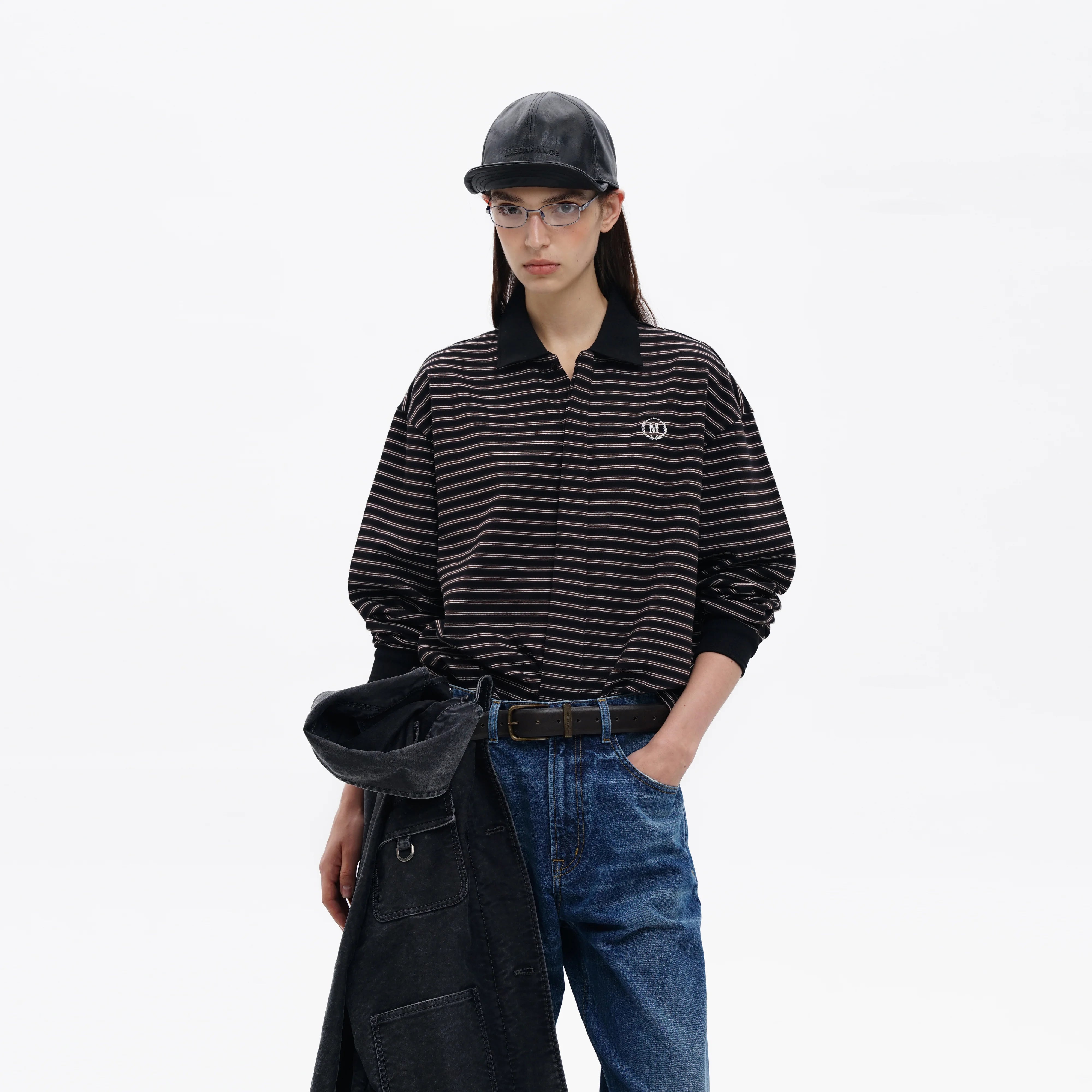 Elevate your casual autumn wardrobe with this stylish women's long-sleeve cardigan. Made from soft, washed cotton, this polo-style top features timeless black and brown horizontal stripes and a refined black collar. The subtle embroidered logo on the left chest adds a classic touch while maintaining a minimalist look.