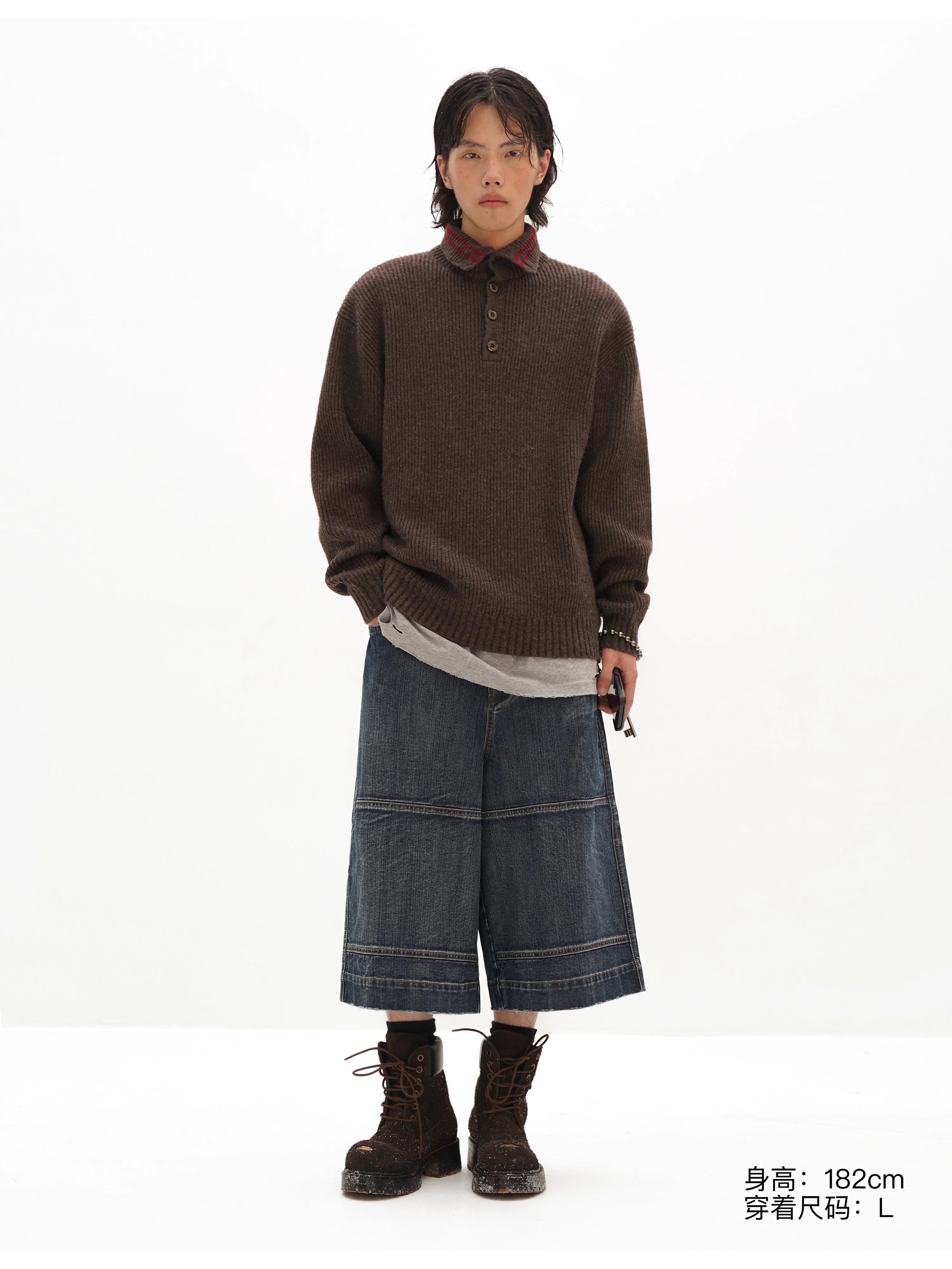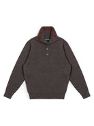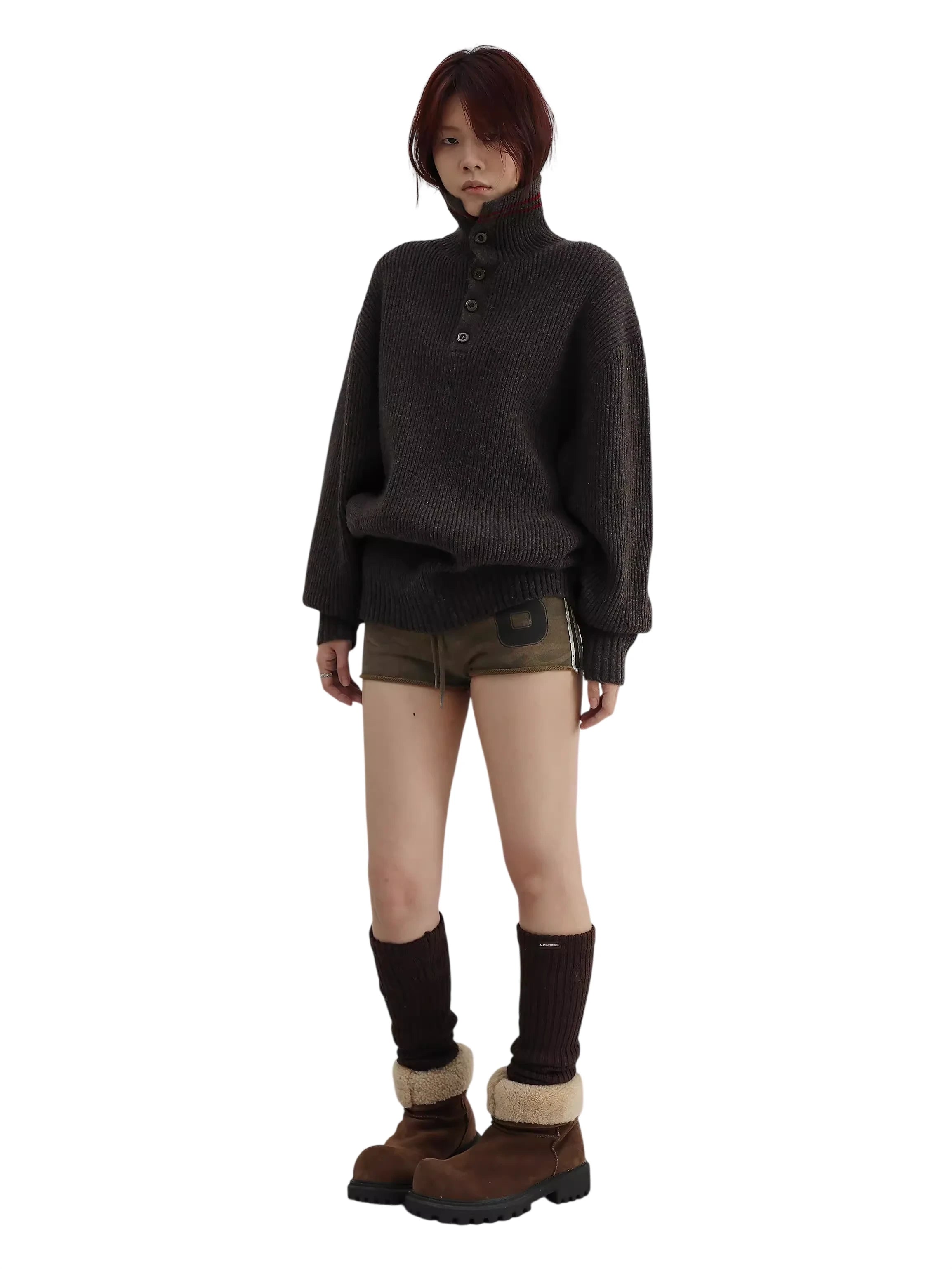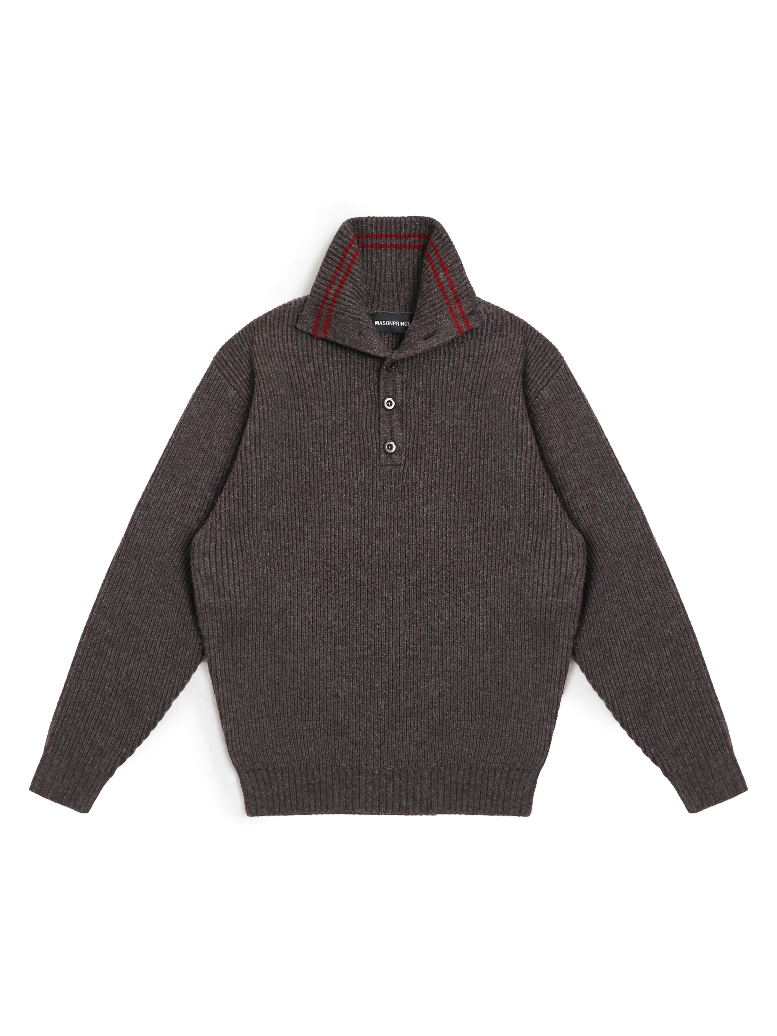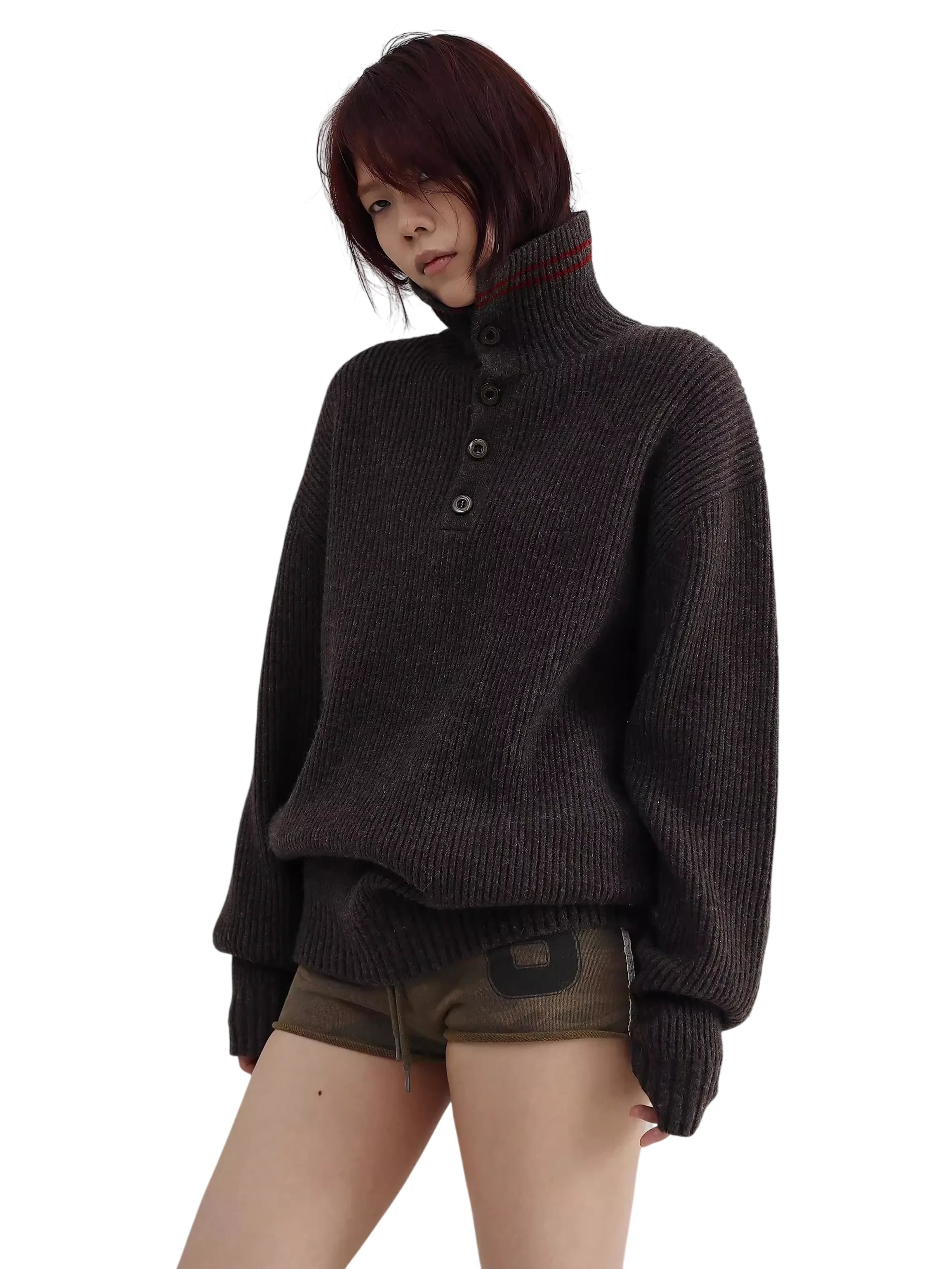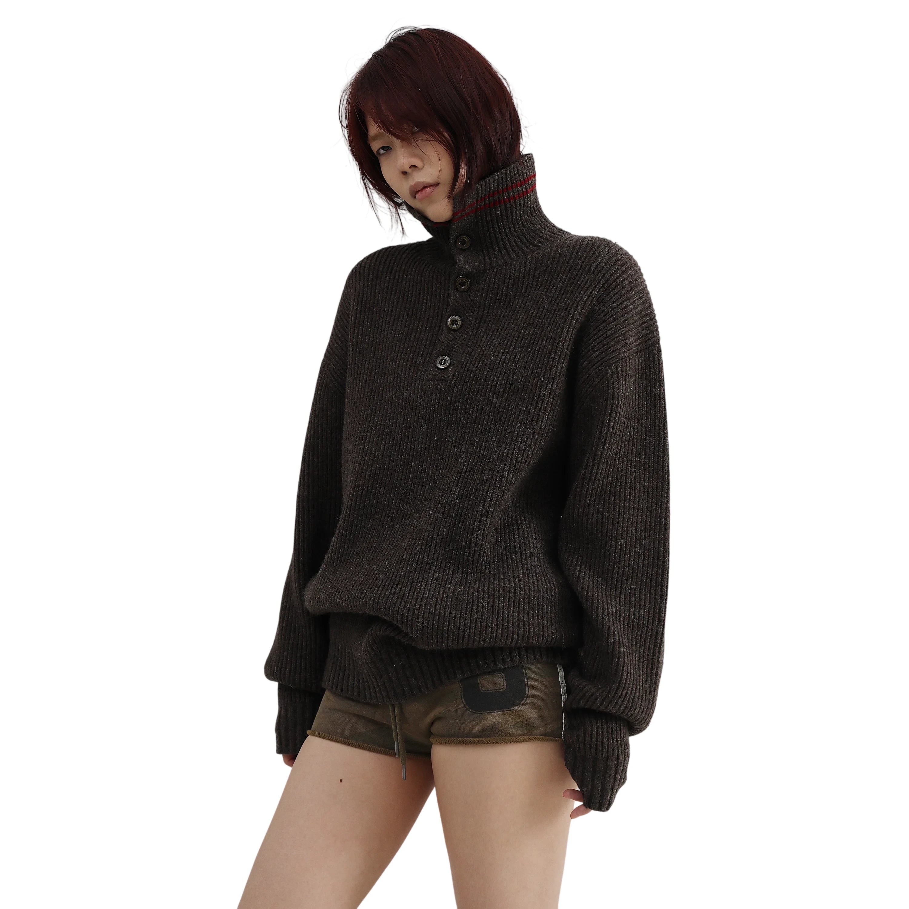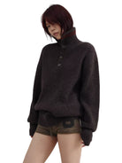 This oversized half-zip sweater is crafted from a cozy wool blend with a textured ribbed knit finish. Designed in a rich dark brown hue, it features a high collar with four front buttons and a subtle red double-stripe accent near the neckline. The relaxed fit and extended sleeves create a slouchy silhouette, making it a stylish and comfortable choice for cooler days. Perfect for women seeking a chic yet casual layering piece.