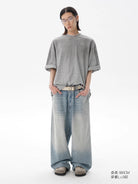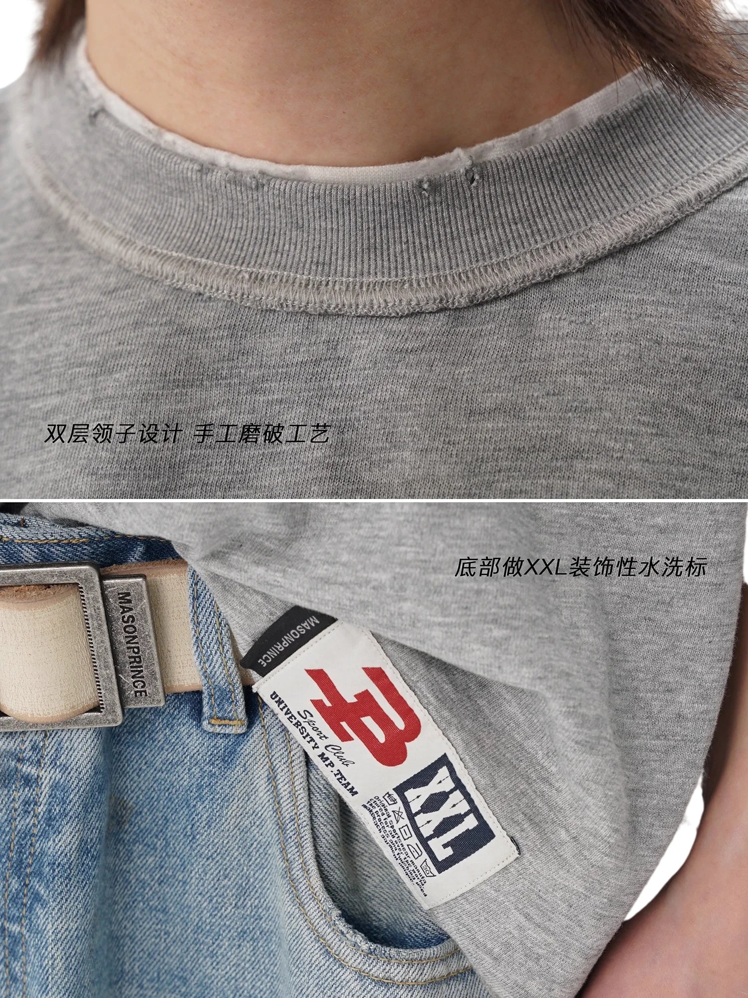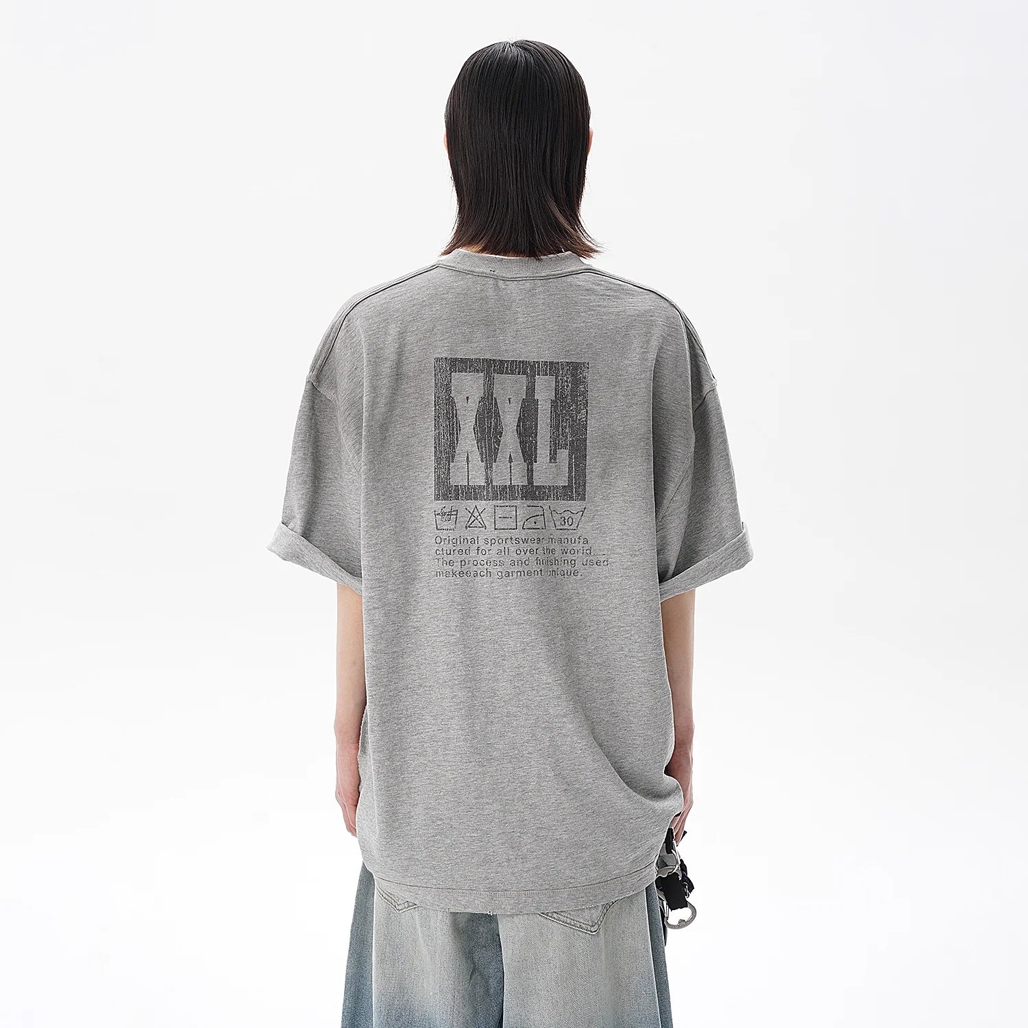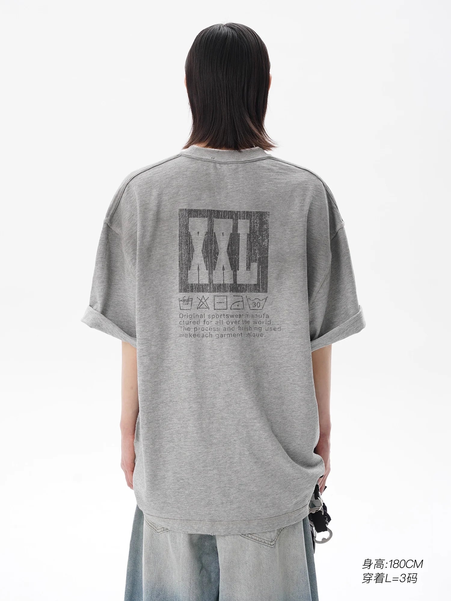 This unisex grey t-shirt showcases a relaxed, oversized fit with rolled short sleeves for a laid-back aesthetic. The back features a bold graphic design with the prominent text "XXL," surrounded by care label-style icons and artistic text. Crafted with a distressed double-layer collar and subtle spray detailing, this tee combines streetwear influence with casual comfort. Ideal for everyday style with a statement look.