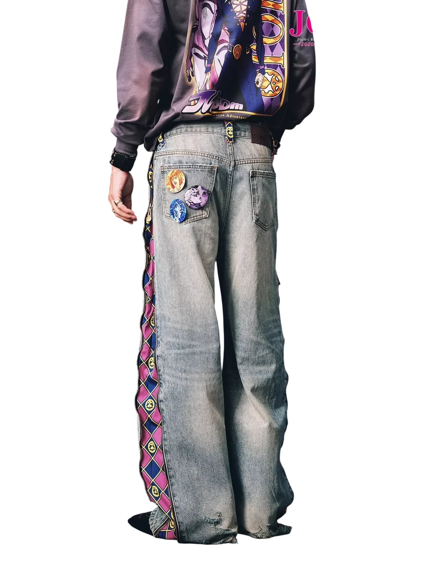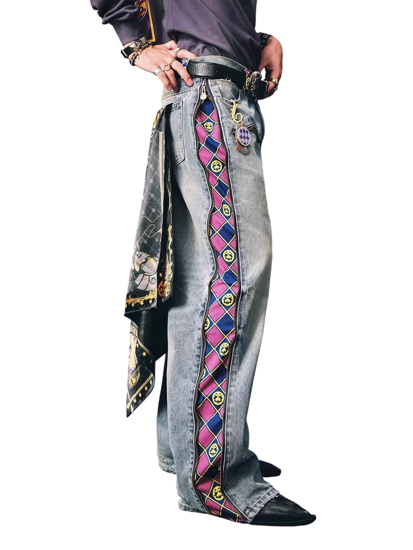 Elevate your streetwear style with these men's wide-leg floor-length jeans, crafted with a vintage washed finish for a worn-in look. Featuring distressed detailing and a bold multicolored plaid trim inspired by pop culture, these jeans offer a unique twist on casual denim. The design includes a functional side zipper pocket and decorative accessories that bring added flair and utility to this standout piece. Perfect for those who appreciate statement fashion with a utilitarian edge.