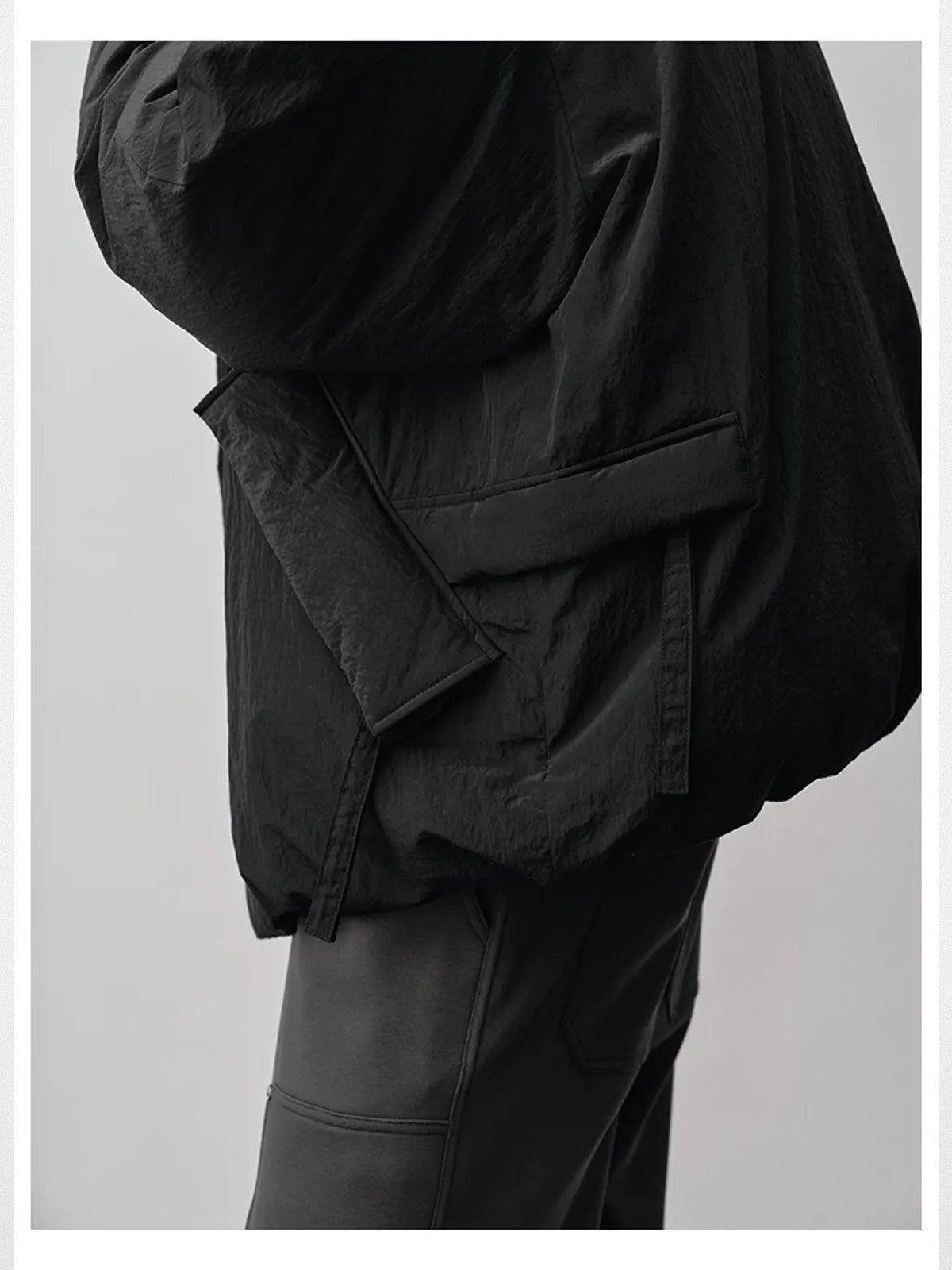 NANS's oversized puffer in crinkled metallic nylon filled with 90% white goose down. Turn-down collar, concealed front placket, angled flap pockets.