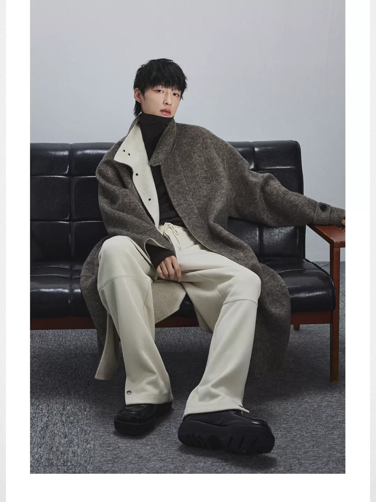 NANS's heavyweight handmade coat in 89% wool and 11% rabbit hair. Double-faced construction with a convertible contrast collar, concealed placket, and curved patch pockets.