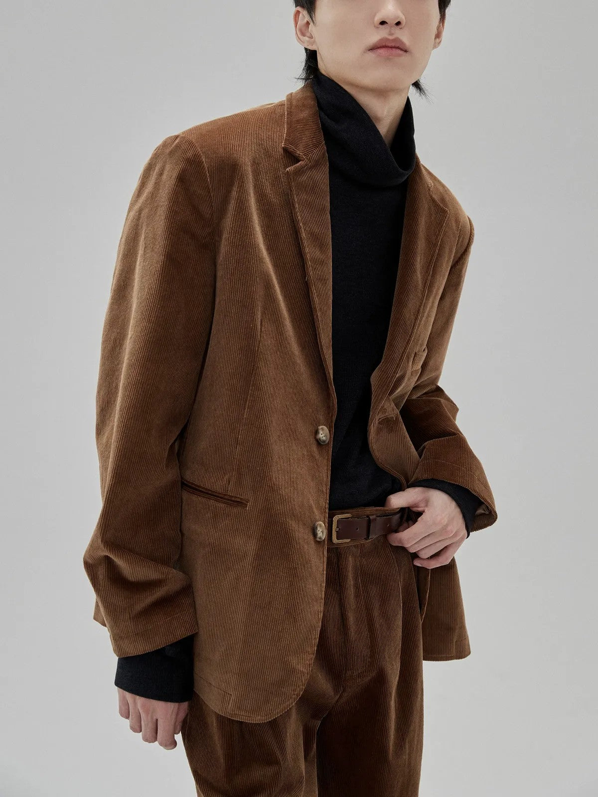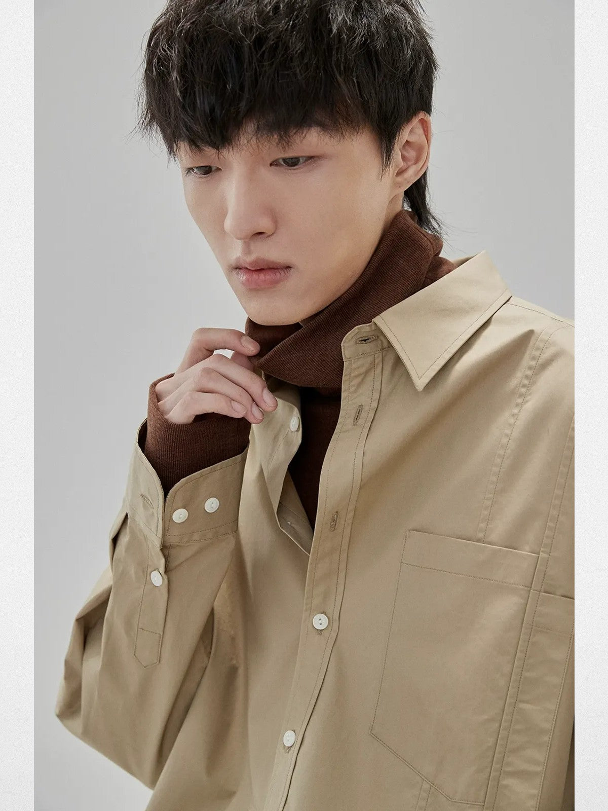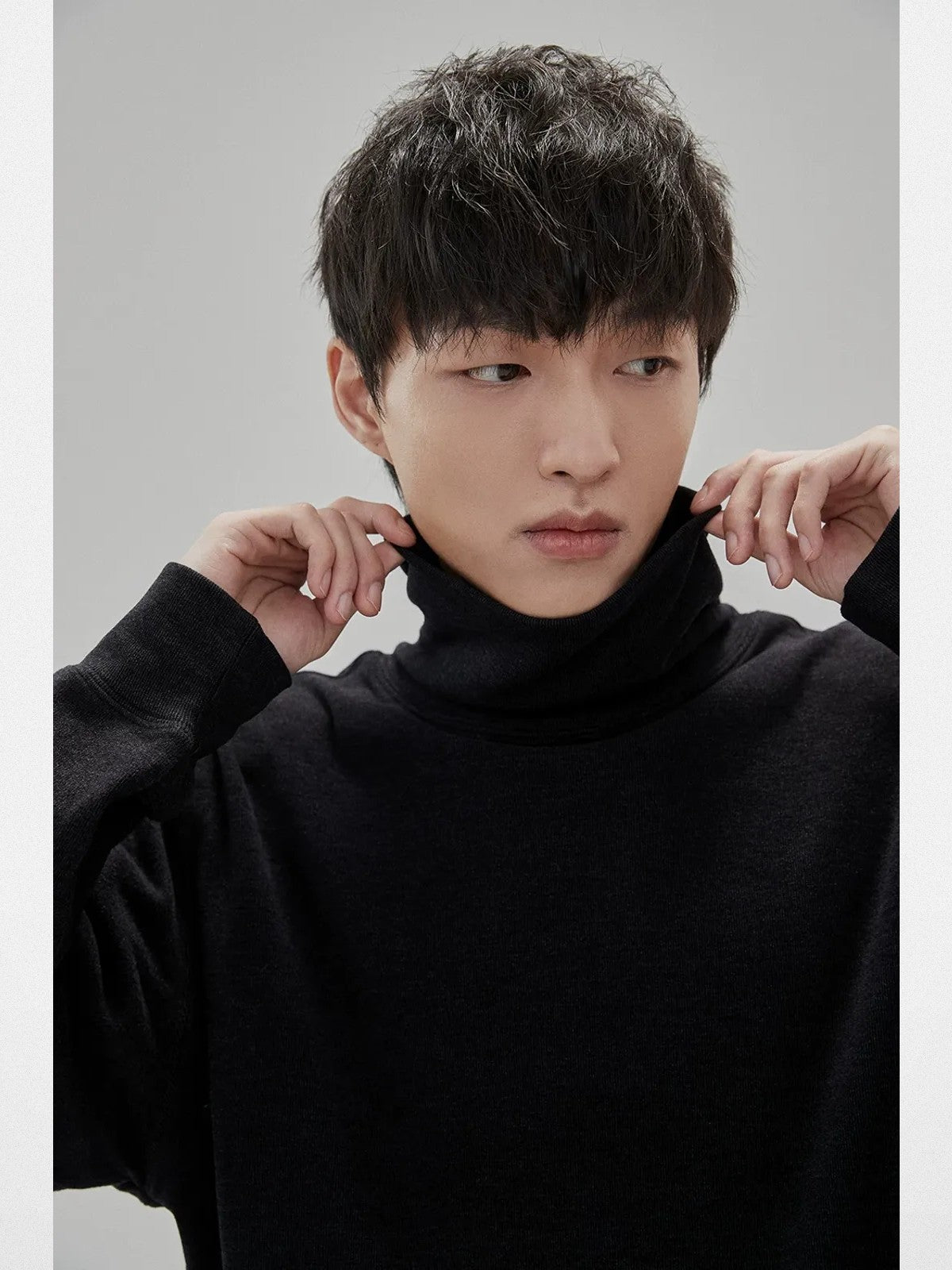 NANS's long-sleeve tee in a soft, high-stretch viscose blend. Slouchy high neck, subtle vertical texture, dropped shoulders, ribbed cuffs.
