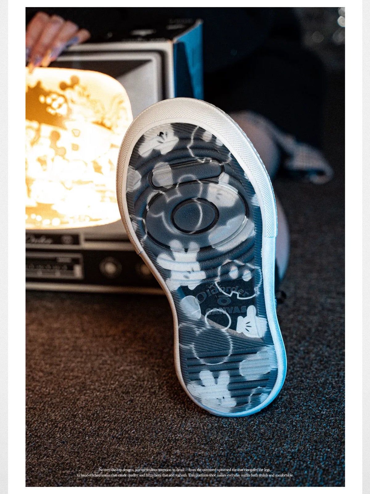 OLDORDER's Disney collaboration sneaker in denim, corduroy, and deerskin. Frayed raw edges, oversized rubber toe cap, removable Mickey Mouse lace charms.