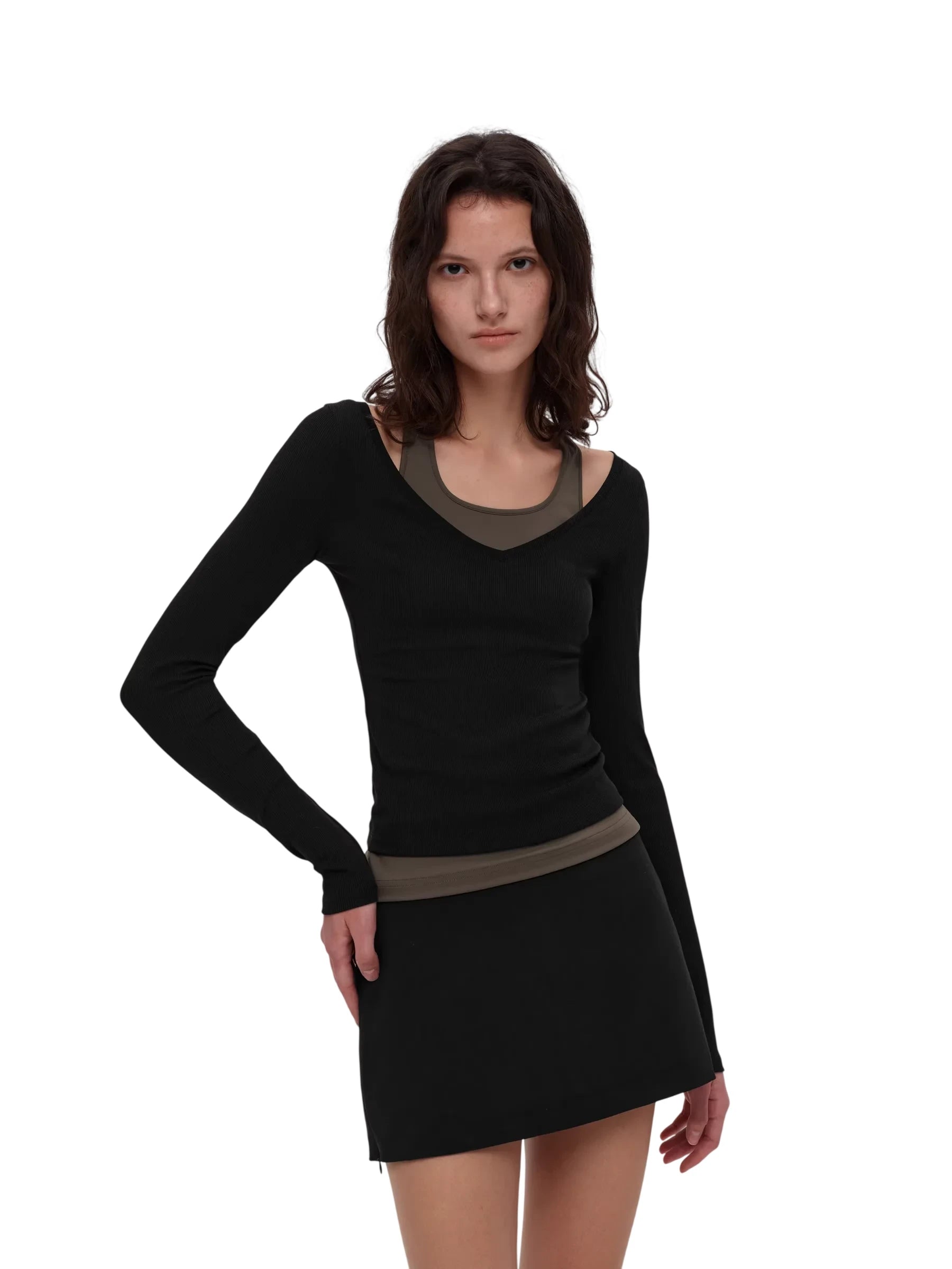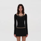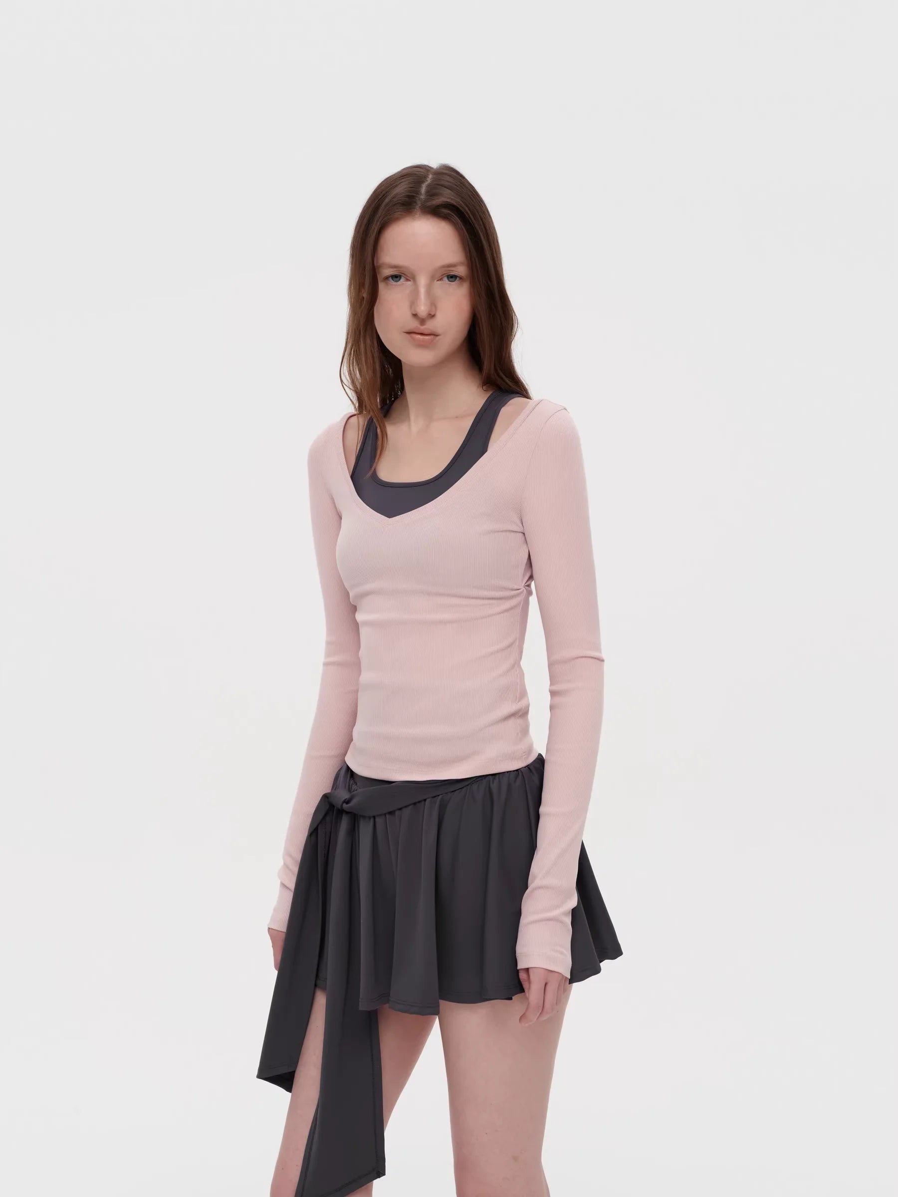 Elevate your casual wardrobe with this ballet-inspired faux two-piece set. Featuring a colorblock halter top with a V-neckline and layered look, this outfit combines sporty elegance with feminine charm. The ribbed knit fabric offers a snug, comfortable fit, perfect for everyday or athleisure wear. The matching bow tie skirt completes the look, adding a graceful silhouette. Designed for women who love movement and style.
