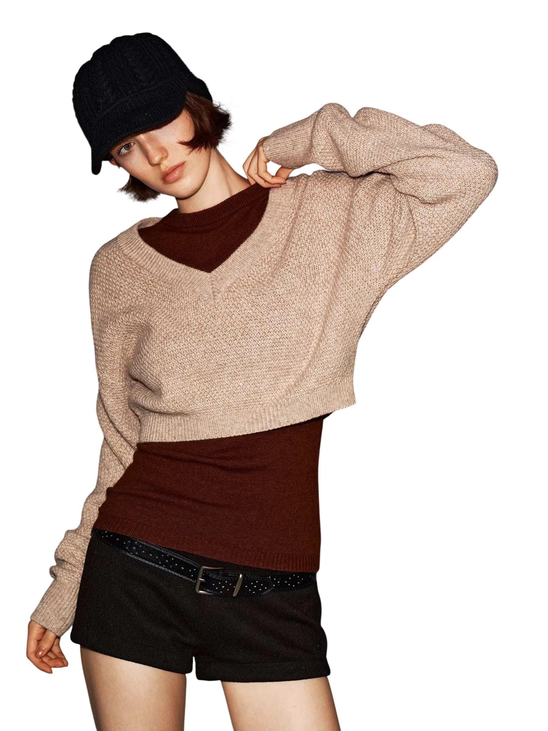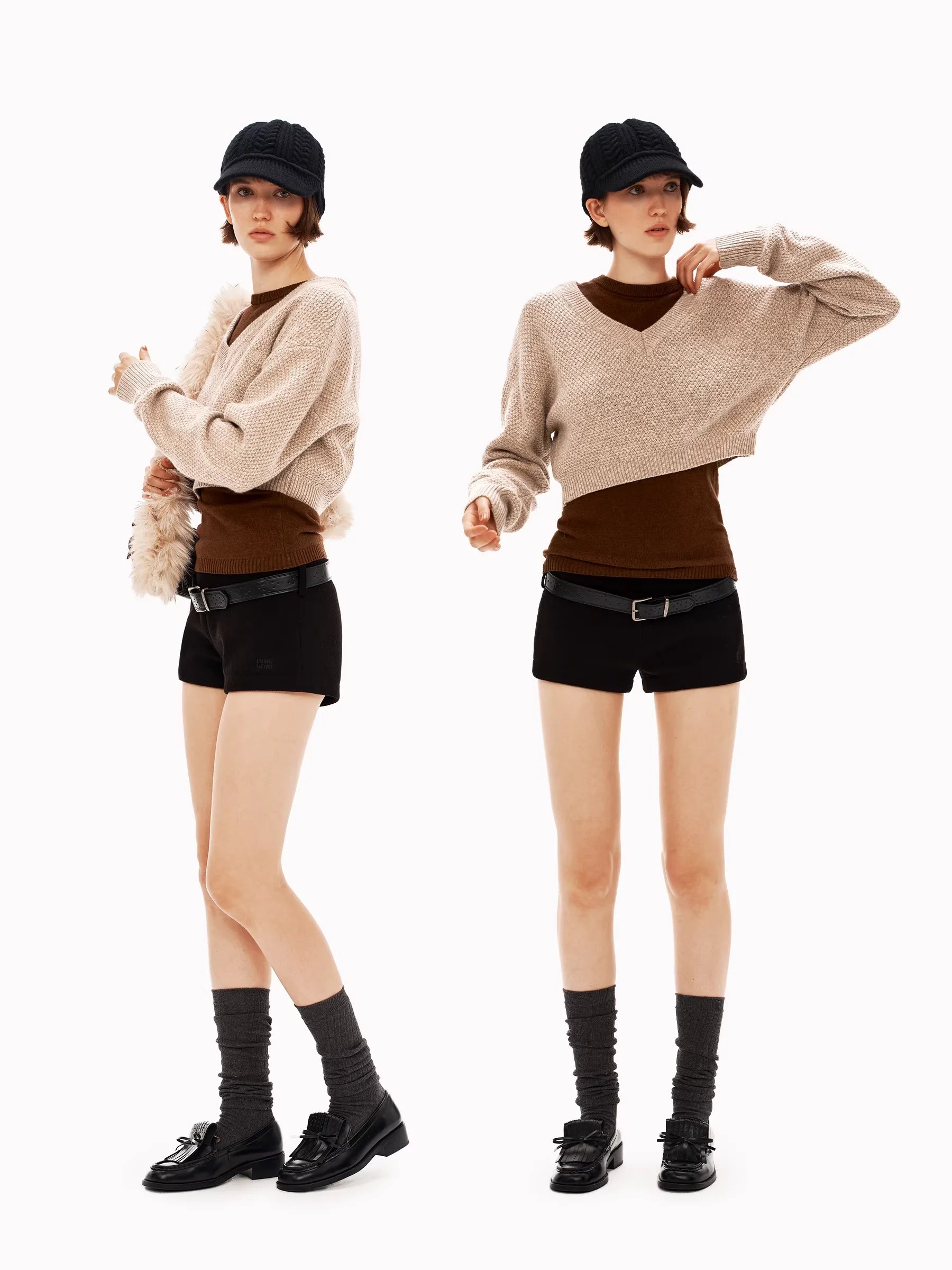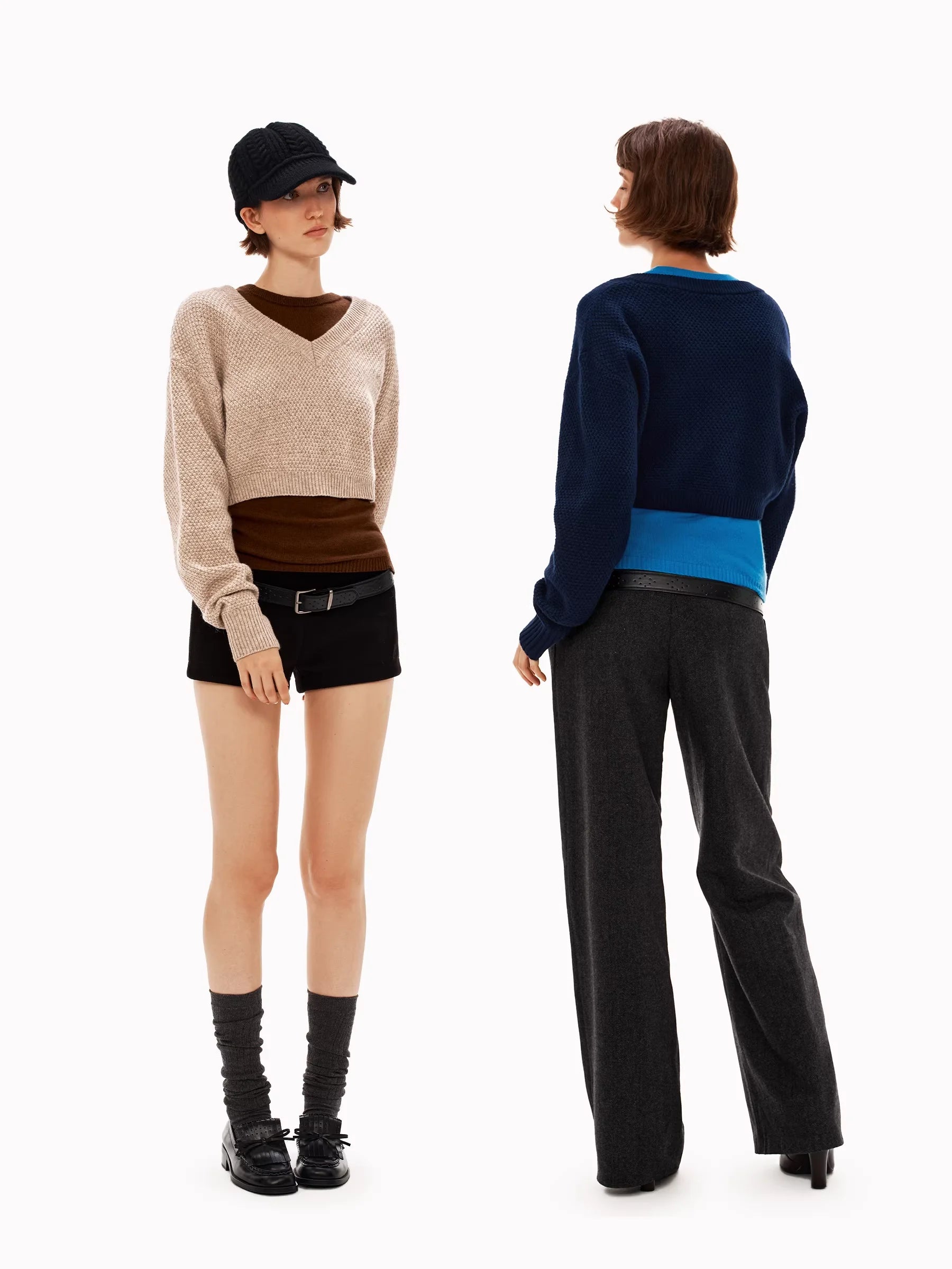 Styled for women, this set offers a versatile and chic appearance. One model pairs the beige outer sweater with a brown inner layer, high-waisted black shorts, and knee-high socks for a sleek, city-ready outfit. The other showcases a navy sweater over a vibrant blue shirt, styled with wide-leg trousers for a more relaxed silhouette. This ensemble is ideal for achieving a contemporary layered look with minimal effort.