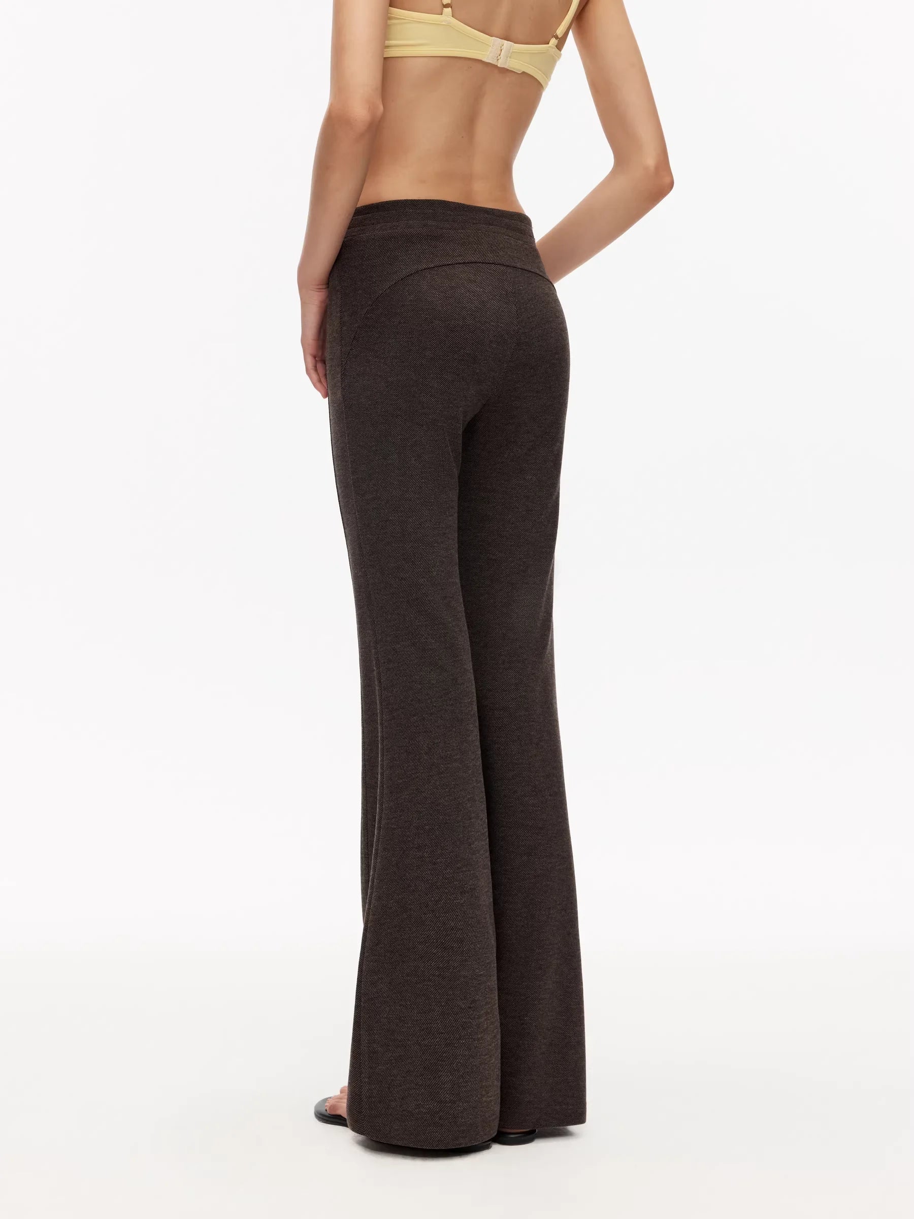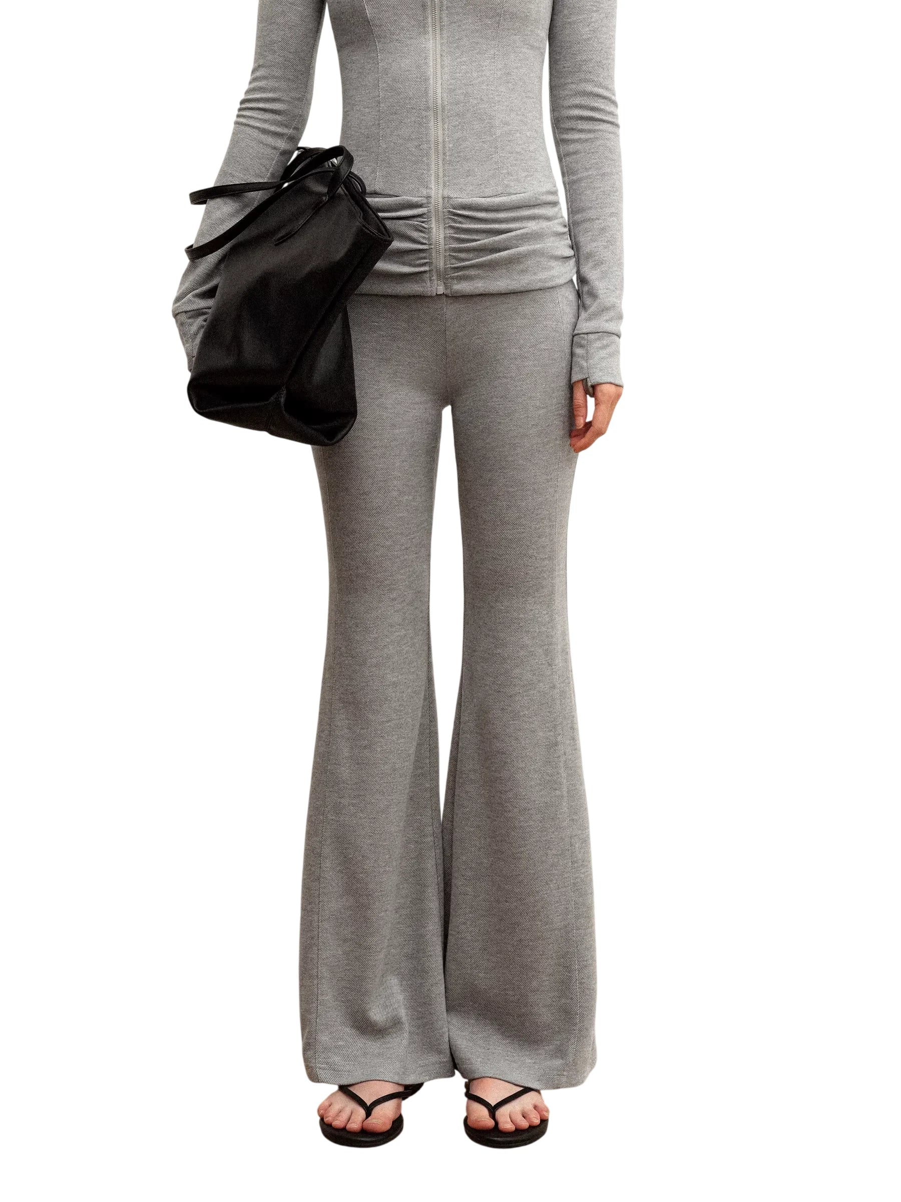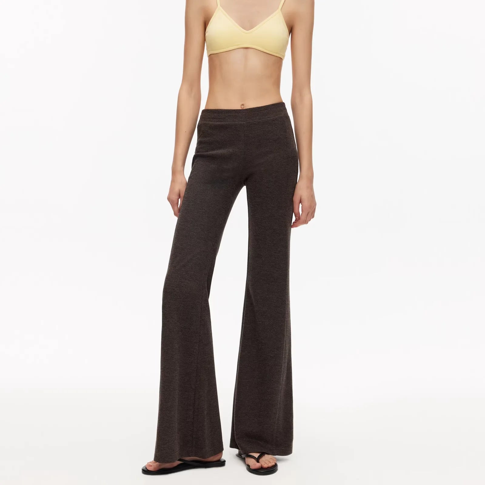 Elevate your everyday style with this classic two-piece set featuring high-waisted flared pants and a minimalist bralette-style top. Designed for women, the dark gray pants showcase a vintage-inspired wide-leg silhouette that flares from the knee down, offering both elegance and comfort. Made from a soft, slightly textured stretch fabric, the pants provide ease of movement and are perfect for casual wear. The coordinating light yellow top adds a chic contrast to the look, making this set a versatile choice for relaxed yet fashionable dressing.