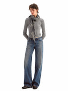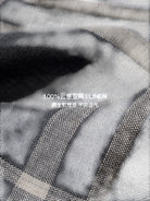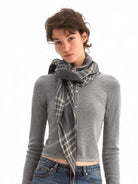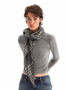 Elevate your wardrobe with this stylish triangle scarf crafted from 100% lightweight linen. Featuring a timeless plaid pattern in dark grey, beige, and muted white tones, this scarf is designed for both comfort and chic versatility. The slightly sheer fabric makes it ideal for layering during transitional weather. Shown on a female model wearing a grey long-sleeve top, this scarf adds a refined touch to any outfit.
