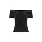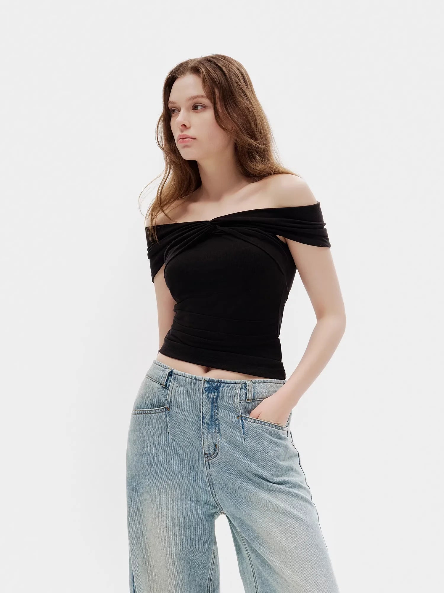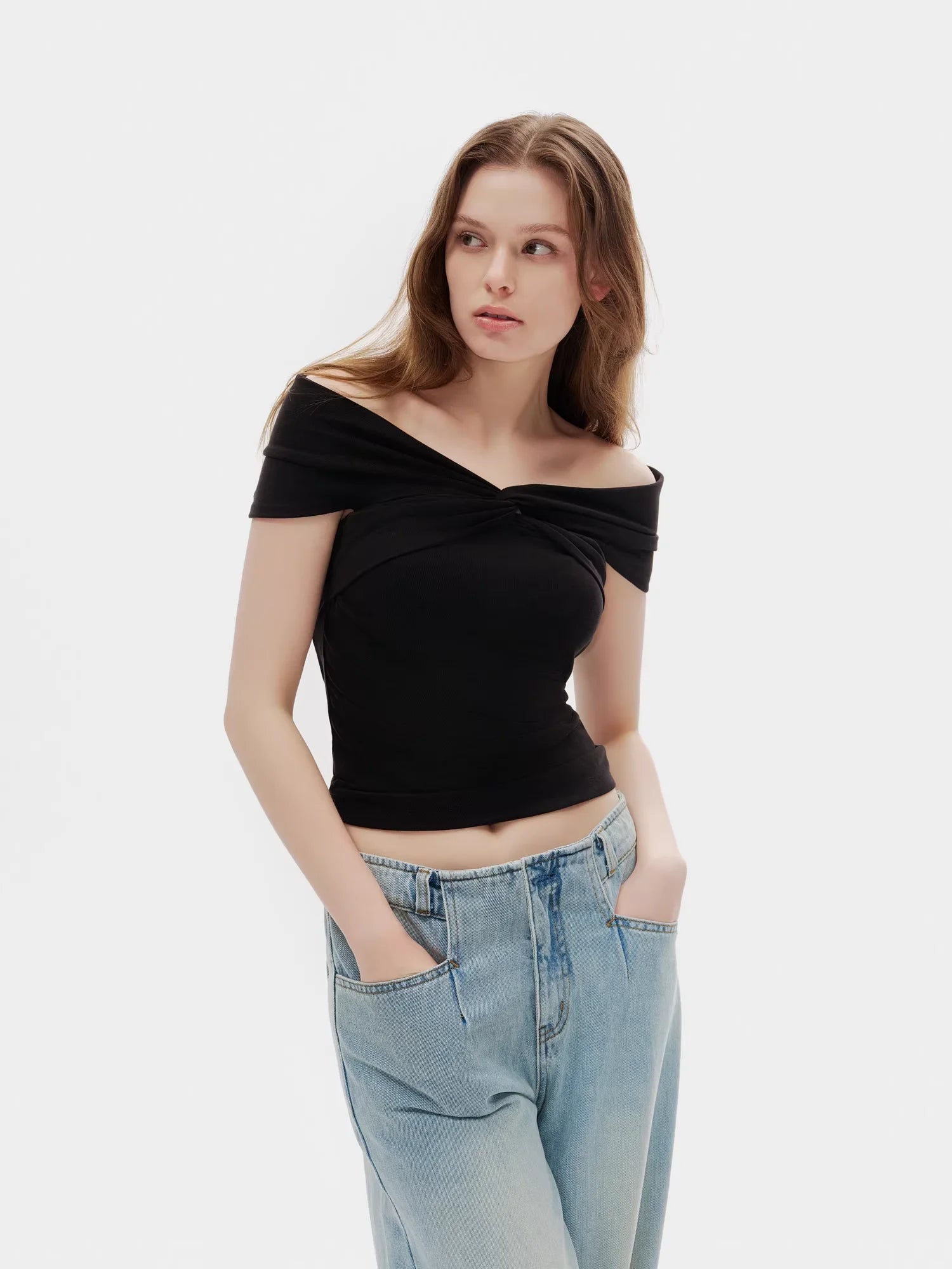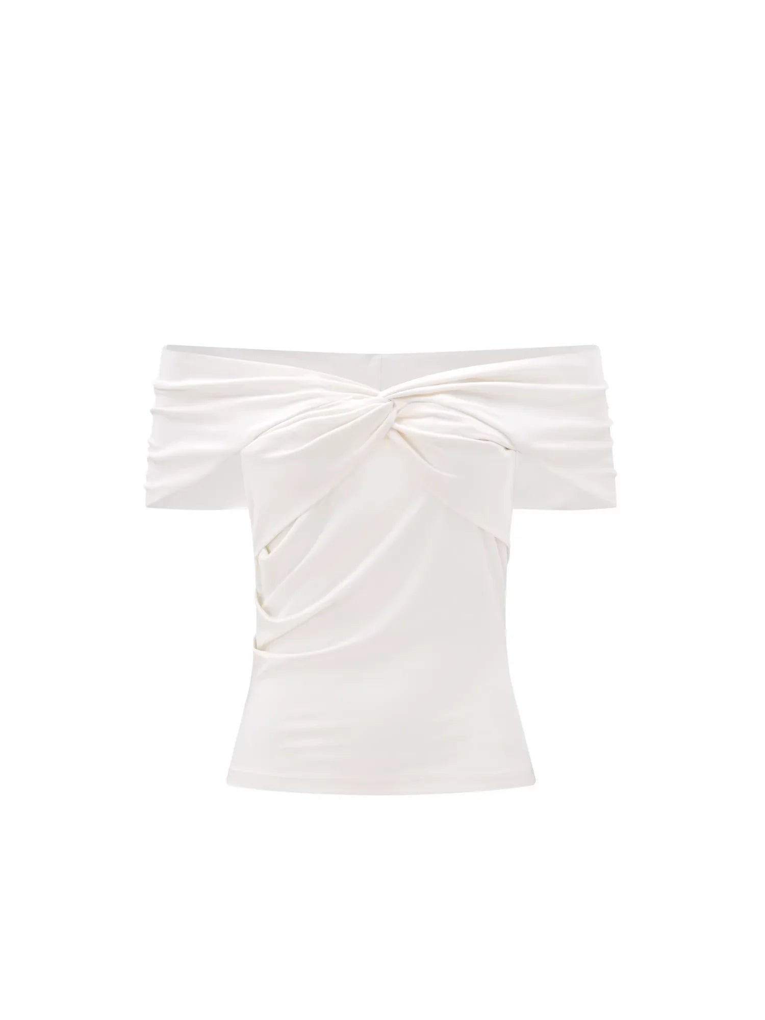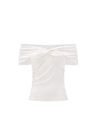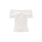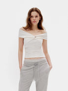 This stylish off-shoulder top features a chic twist-knot design at the front, adding a touch of elegance to its modern silhouette. Crafted for a flattering, fitted look, it accentuates the waist and offers a comfortable fit. The short sleeves and layered ruching details further elevate its fashionable appeal. Ideal for casual outings or dressed-up loungewear, this women's top effortlessly blends comfort with contemporary style.